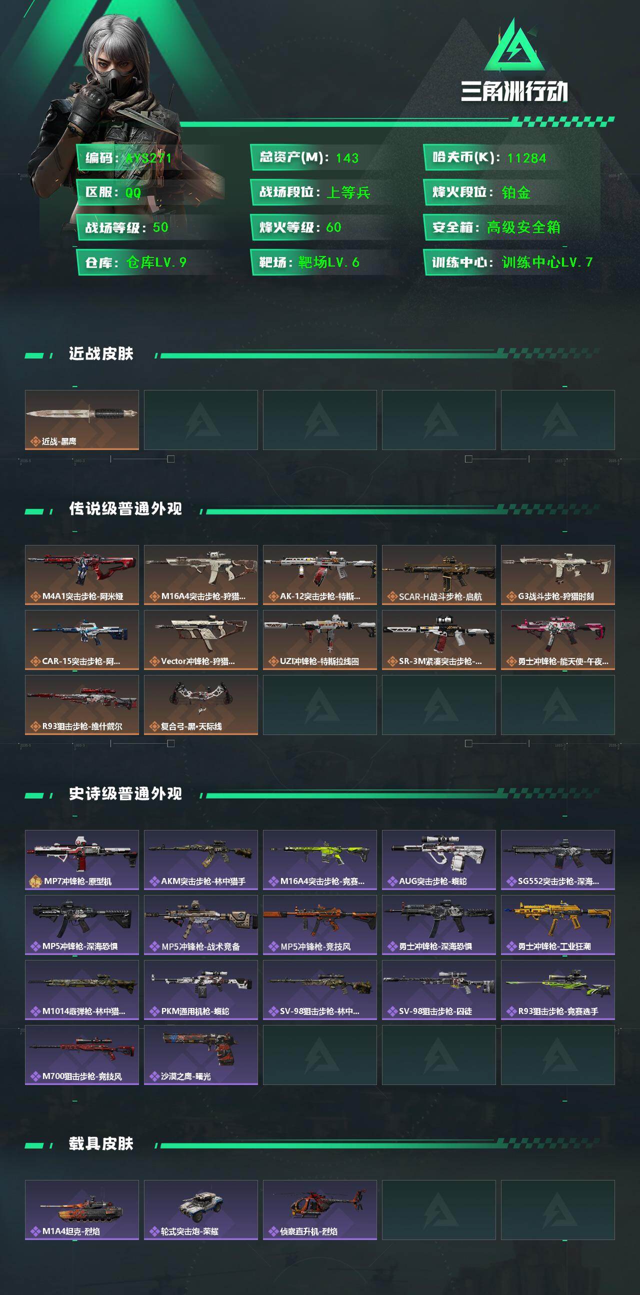 [15632100]143m总资产-11284k哈伏币-60烽火等级-铂金-50战场等级-上等兵 【近战皮肤】:近战-黑鹰 【传说外观】:M4A1突击步枪-阿米娅,M16A4突击步枪-狩猎时刻,AK-12突击步枪-特斯拉线圈,SCAR-H战斗步枪-启航,G3战斗步枪-狩猎时刻,CAR-15突击步枪-阿米娅,Vector冲锋枪-狩猎时刻,UZI冲锋枪-特斯拉线圈,SR-3M紧凑突击步枪-特斯拉线圈,勇士冲锋枪-能天使-午夜邮差,R93狙击步枪-维什戴尔,复合弓-黑·天际线 【史诗外观】:MP7冲锋枪-原型机,AKM突击步枪-林中猎手,M16A4突击步枪-竞赛选手,AUG突击步枪-蝮蛇,SG552突击步枪-深海恐惧,MP5冲锋枪-深海恐惧,MP5冲锋枪-战术竞备,MP5冲锋枪-竞技风,勇士冲锋枪-深海恐惧,勇士冲锋枪-工业狂潮,M1014霰弹枪-林中猎手,PKM通用机枪-蝮蛇,SV-98狙击步枪-林中猎手,SV-98狙击步枪-囚徒,R93狙击步枪-竞赛选手,M700狙击步枪-竞技风,沙漠之鹰-曙光 【稀有外观】:M14射手步枪-天际线,M4A1突击步枪-零点,AKM突击步枪-前沿科技,AKM突击步枪-肃杀,QBZ95-1突击步枪-公平竞技,K416突击步枪-碳纤维,M16A4突击步枪-街头涂鸦,AUG突击步枪-全金属外壳,M7战斗步枪-捣蛋鬼,AK-12突击步枪-零点,AK-12突击步枪-前沿科技,SCAR-H战斗步枪-荣耀列队,PTR-32突击步枪-天网,AS Val突击步枪-哈夫克科技,MP5冲锋枪-弄臣,MP5冲锋枪-虎啸,P90冲锋枪-医疗协议,Vector冲锋枪-先锋,SMG-45-行动开启,SMG-45冲锋枪-幻影结构,SMG-45冲锋枪-天网,MP7冲锋枪-幻影结构,M1014霰弹枪-幻影结构,M1014霰弹枪-童趣,M249轻机枪-战损,M250通用机枪-前沿科技,M250通用机枪-天网,Mini-14射手步枪-荣耀列队,SVD狙击步枪-战术行动,M14射手步枪-出厂配置,SKS射手步枪-弄臣,SR-25射手步枪-开拓,SR-9射手步枪-街头涂鸦,SV-98狙击步枪-星链科技,SV-98狙击步枪-哈夫克航天,SV-98狙击步枪-精英联盟 【普通外观】:CAR-15突击步枪-监察,M4A1突击步枪-粉色涂装,M4A1突击步枪-高雅黑,M4A1突击步枪-海色,QBZ95-1突