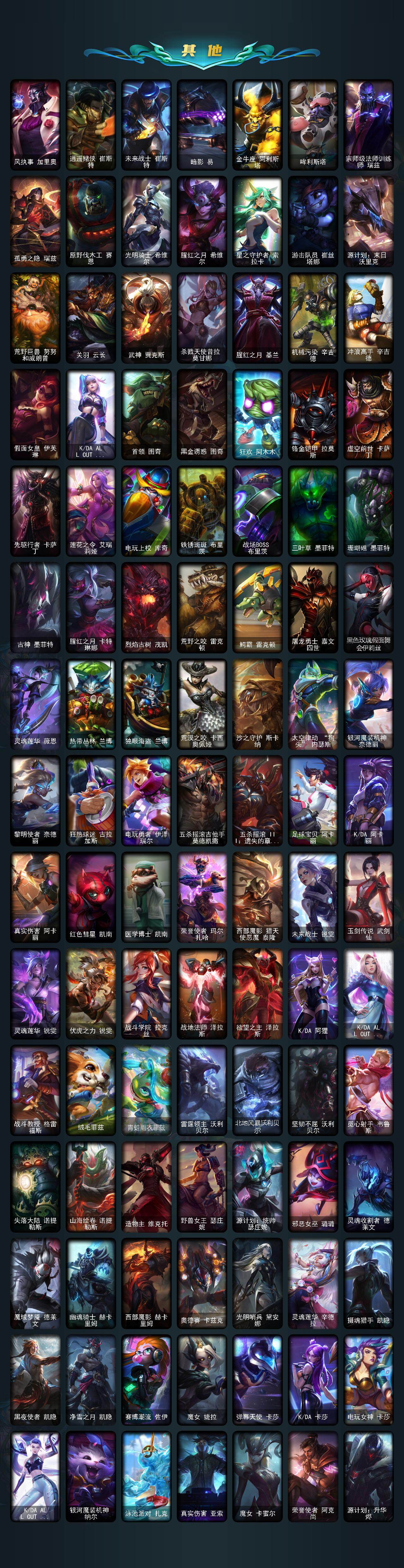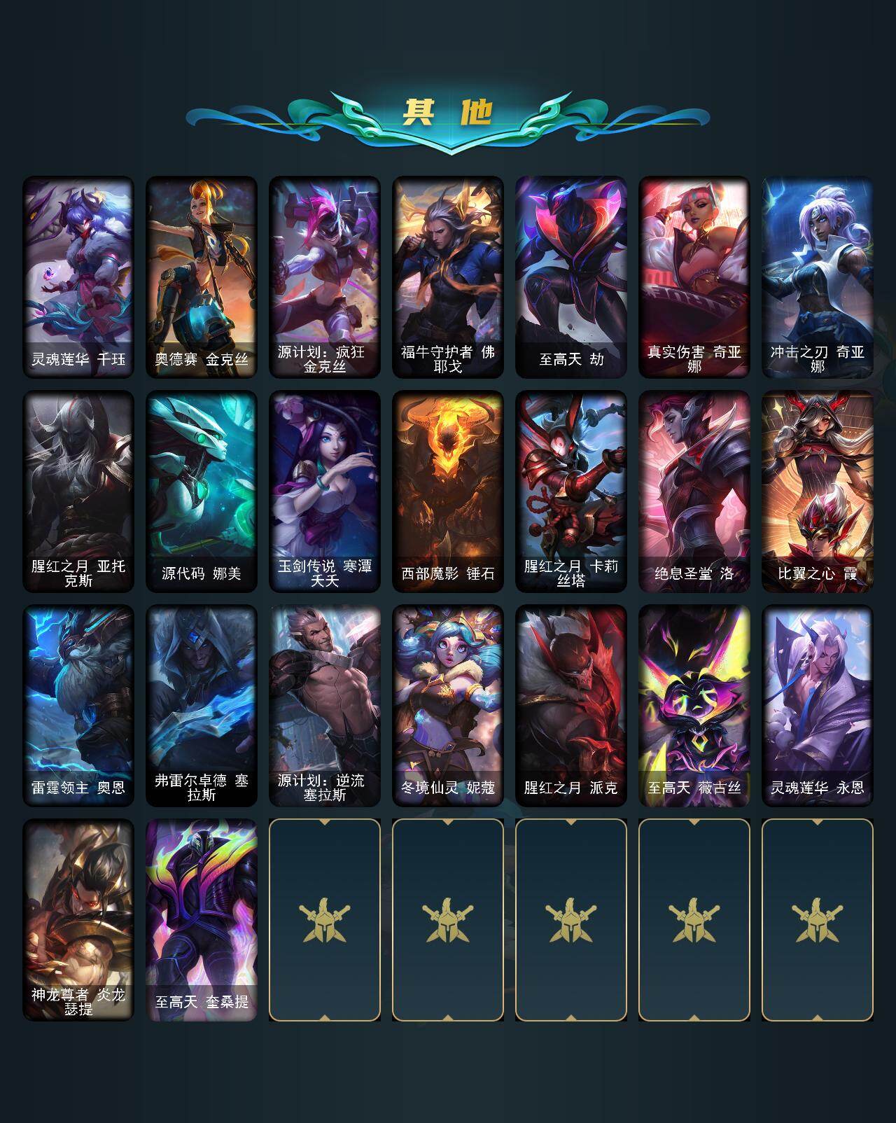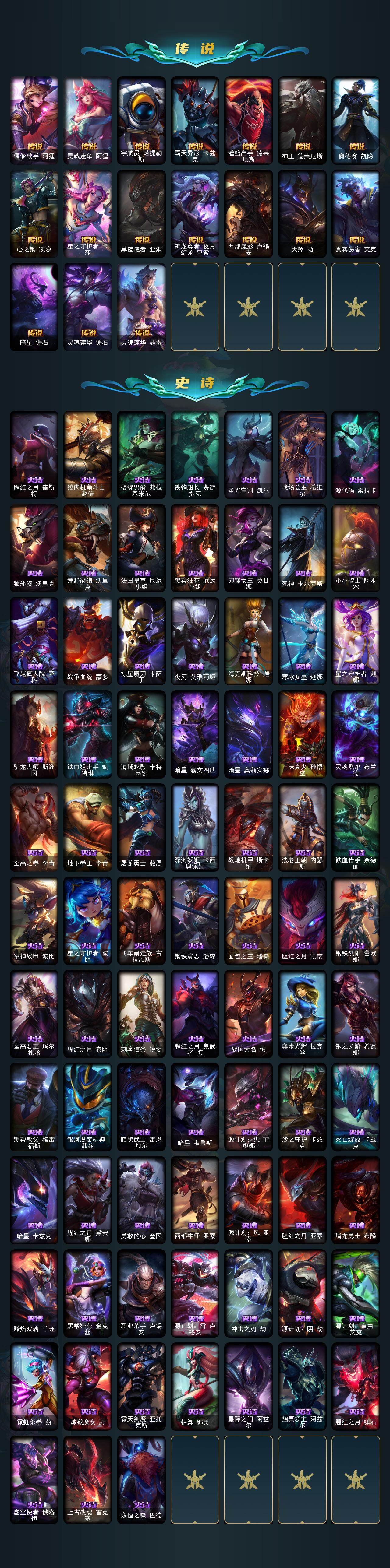 【传说皮肤】:战地机甲厄加特,邪鸦魅影乐芙兰,钢铁之翼凯尔,恶魔男爵瑞兹,霸天零式赛恩,提莫约德尔人的一大步,驯龙炮手崔丝塔娜,源计划联合艾希,电玩女神娑娜,冰霜之刃艾瑞莉娅,女主播迦娜,红色男爵库奇,女警狙击凯特琳,苹果机器人布里茨,地狱行者孙悟空,神拳李青,神龙尊者圣龙李青,源计划净化薇恩,银河魔装机神兰博,驯龙学者黑默丁格,炼狱魔犬内瑟斯,战斗学院伊泽瑞尔,源计划超体莫德凯撒,神王盖伦,黎明使者锐雯,绝息圣堂锐雯,黯黑魔龙希瓦娜,冰霜亚龙希瓦娜,偶像歌手阿狸,灵魂莲华阿狸,宇航员诺提勒斯,霸天异形卡兹克,灌篮高手德莱厄斯,神王德莱厄斯,奥德赛凯隐,心之钢凯隐,星之守护者卡莎,黑夜使者亚索,神龙尊者夜月幻龙亚索,西部魔影卢锡安,天煞劫,真实伤害艾克,暗星锤石,灵魂莲华锤石,灵魂莲华瑟提