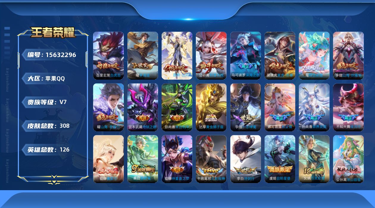 [15632296]【特价出售/店主推荐】苹果Q-V7-最强王者段位-126英雄-308皮肤-23传说-87史诗