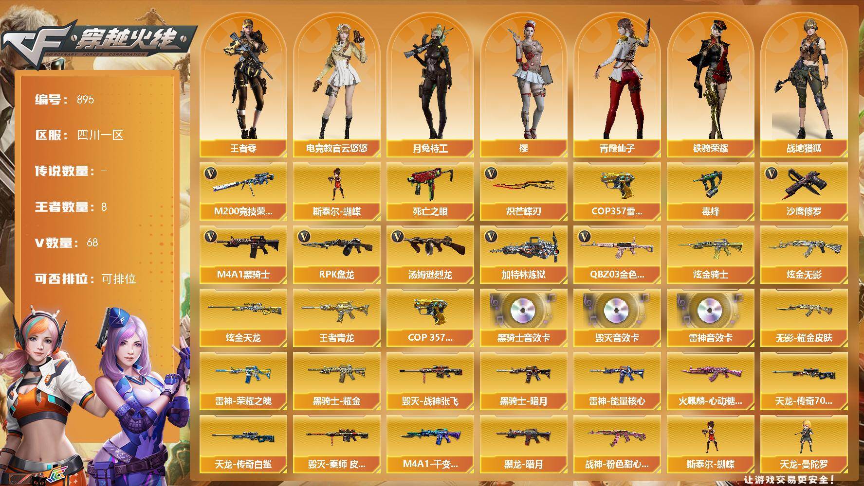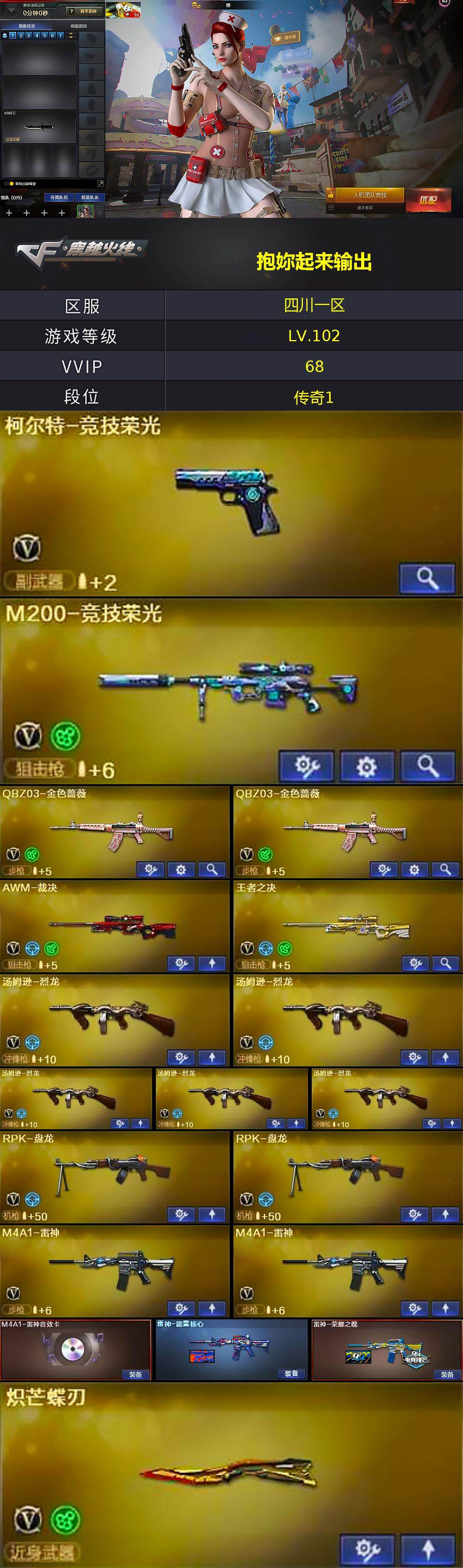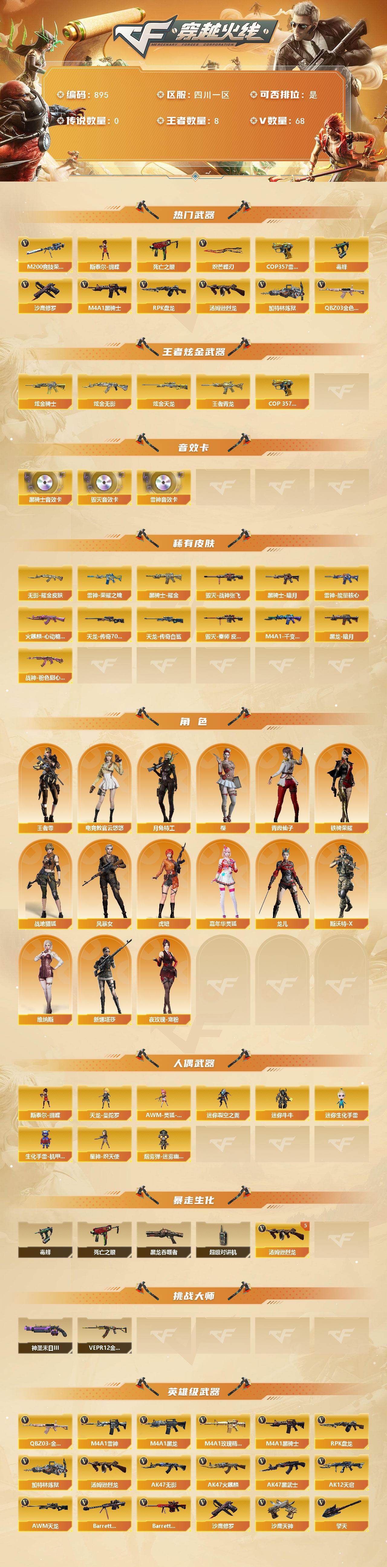 [15632370]四川一区-68V-8王者-3炫金 【热门武器】:QBZ03-金色蔷薇*2,M200-竞技荣光,死亡之眼,毒蜂,M4A1-黑骑士,汤姆逊-烈龙*5,RPK-盘龙*2,加特林-炼狱*2,斯泰尔-蝴蝶,COP 357-雷霆王者,沙鹰-修罗*4,炽芒蝶刃 【王者炫金武器】:王者青龙,COP 357-雷霆王者,炫金骑士,炫金无影,炫金天龙 【音效卡】:M4A1-雷神音效卡,M4A1-黑骑士音效卡,Barrett-毁灭音效卡 【皮肤】:雷神-能量核心,雷神-荣耀之魄,火麒麟-心动糖果,毁灭-战神张飞,毁灭-秦师 皮肤,M4A1-千变-孔明皮肤,黑龙-暗月,黑骑士-暗月,黑骑士耀金皮肤,无影耀金皮肤,战神-粉色甜心皮肤,AWM-天龙-传奇70KG,AWM-天龙-传奇白鲨*2 【角色】:樱,电竞教官-云悠悠,月兔特工,战地猎狐,王者-零,风暴女*2,虎妞,嘉年华灵狐,龙儿,青霞仙子,斯沃特-X,铁骑荣耀,维纳斯,新娜塔莎,夜玫瑰-宠粉 【人偶武器】:星神-炽天使,天龙-曼陀罗*2,斯泰尔-蝴蝶,AWM-灵狐-15周年嘉年华,迷你裂空之翼,迷你牛牛,迷你生化手雷,生化手雷-机甲核心,烟雾弹-迷雾幽灵 【暴走生化】:毒蜂,黑龙吞噬者,死亡之眼,超级对讲机 【挑战大师】:VEPR-12-金魔,神圣爆裂者-末日III 【英雄级武器】:AK47-火麒麟*2,M4A1-黑龙,M4A1-雷神*2,M4A1-黑骑士,AK47-无影,AK47-黑武士,AK12-天启,M4A1-武圣,AK47-黑鲨*2,M4A1-龙血,无影-神兵利器,黑武士-锦绣游龙,M4A1-玫瑰精灵,QBZ03-金色蔷薇*2,AK-47-猩红传说,王者炎心-觉醒版,AWM-天龙*2,Barrett-毁灭,Barrett-极光,AWM-裁决,Barrett-朱雀,M200-竞技荣光,王者之怒-觉醒版,王者之决-觉醒版,RPK-盘龙*2,加特林-炼狱*2,汤姆逊-烈龙*5,AA-12-雷霆,沙鹰-修罗*4,沙鹰-天神*2,柯尔特-竞技荣光,屠龙*2,龙啸,擎天,麒麟刺*2,幻灵之锋,炽芒蝶刃,高爆手雷-竞技荣光*5,高爆手雷-神工天巧,闪光弹-竞技荣光,闪光弹-神工天巧,闪光弹-雷霆王者-觉醒版*2,烟雾弹-幻灵,烟雾弹-竞技荣光,烟雾弹-神工天巧,烟雾弹-雷霆王者-觉醒版,M4A1-赤狱骑士 【道具】:R.LGD炫彩背包,全能枪