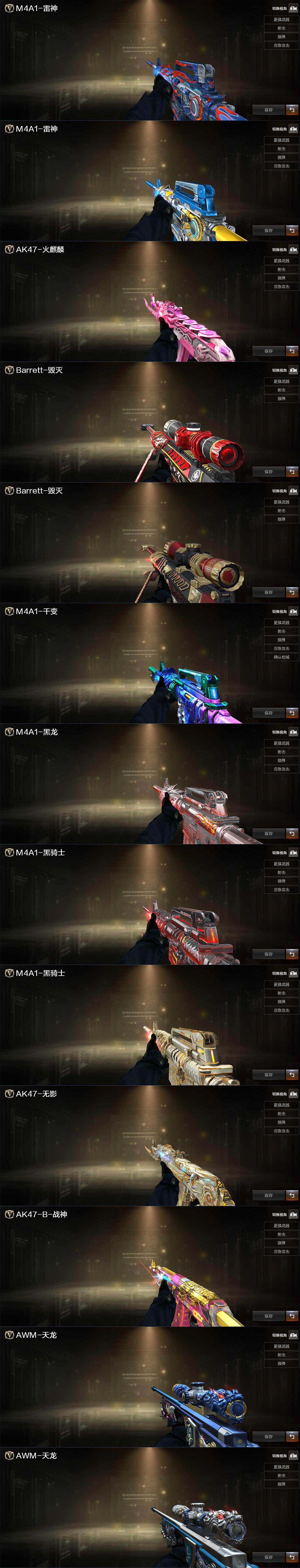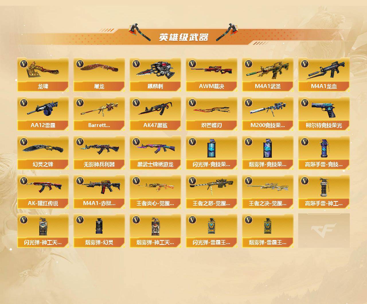 【英雄级武器】:AK47-火麒麟*2,M4A1-黑龙,M4A1-雷神*2,M4A1-黑骑士,AK47-无影,AK47-黑武士,AK12-天启,M4A1-武圣,AK47-黑鲨*2,M4A1-龙血,无影-神兵利器,黑武士-锦绣游龙,M4A1-玫瑰精灵,QBZ03-金色蔷薇*2,AK-47-猩红传说,王者炎心-觉醒版,AWM-天龙*2,Barrett-毁灭,Barrett-极光,AWM-裁决,Barrett-朱雀,M200-竞技荣光,王者之怒-觉醒版,王者之决-觉醒版,RPK-盘龙*2,加特林-炼狱*2,汤姆逊-烈龙*5,AA-12-雷霆,沙鹰-修罗*4,沙鹰-天神*2,柯尔特-竞技荣光,屠龙*2,龙啸,擎天,麒麟刺*2,幻灵之锋,炽芒蝶刃,高爆手雷-竞技荣光*5,高爆手雷-神工天巧,闪光弹-竞技荣光,闪光弹-神工天巧,闪光弹-雷霆王者-觉醒版*2,烟雾弹-幻灵,烟雾弹-竞技荣光,烟雾弹-神工天巧,烟雾弹-雷霆王者-觉醒版,M4A1-赤狱骑士