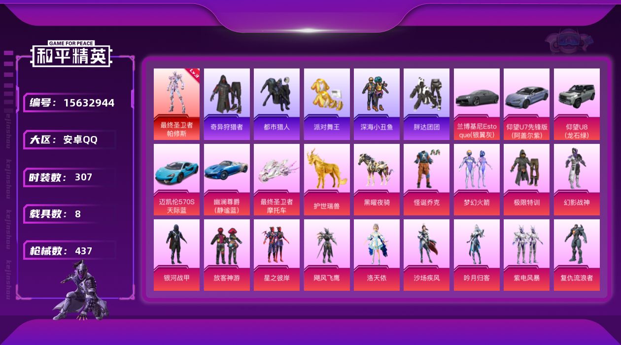 [15632944]【身法素材号-特价急出】连体安卓王者V10-508皮肤-6水4无双7珍品3星传75传说2天幕-3级帕修斯-怪诞乔克-都市猎人-奇异狩猎者-2螳螂-安卓 手Q-1神装-36粉装-27特效枪-8载具-21粉色飞行器-165305热力值-16王牌印记-307套装-437枪皮