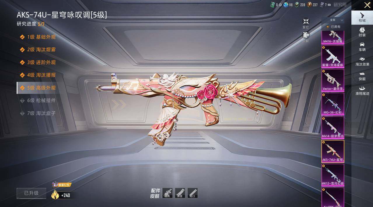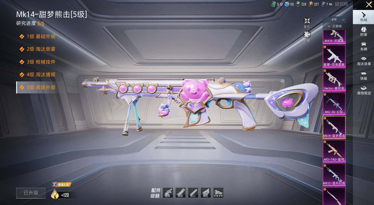 【粉色枪皮等级】:AKM-梦之光华(五级),SCAR-L-纯梦嫁纱(五级),M416-风花雪月(六级),M416-灵猫魔法师(三级),GROZA-镜光银凌(五级),AUG-星之彼岸(五级),M762-青锋波束(五级),蜜獾-荧海星豚(二级),UMP45-量子极限(五级),UMP45-宇宙意志(三级),Vector-环太平洋(一级),Vector-最终圣卫者(三级),Vector-绯穹魔姬(四级),AKS-74U-星穹咏叹调(五级),P90-金丰海韵(五级),Kar98K-创世·救赎(四级),Kar98K-巳巳如意(五级),M24-魔法神域(四级),Mk14-甜梦熊击(五级),AMR-炫光之旅(四级),M417-第五大道(四级),MK12-雪月幻音(四级),DP-28-暗夜鎏金(一级),DP-28-圣堂之誓(五级),DP-28-豹影疾电(五级),PKM-江南烟雨(五级),MG-3
