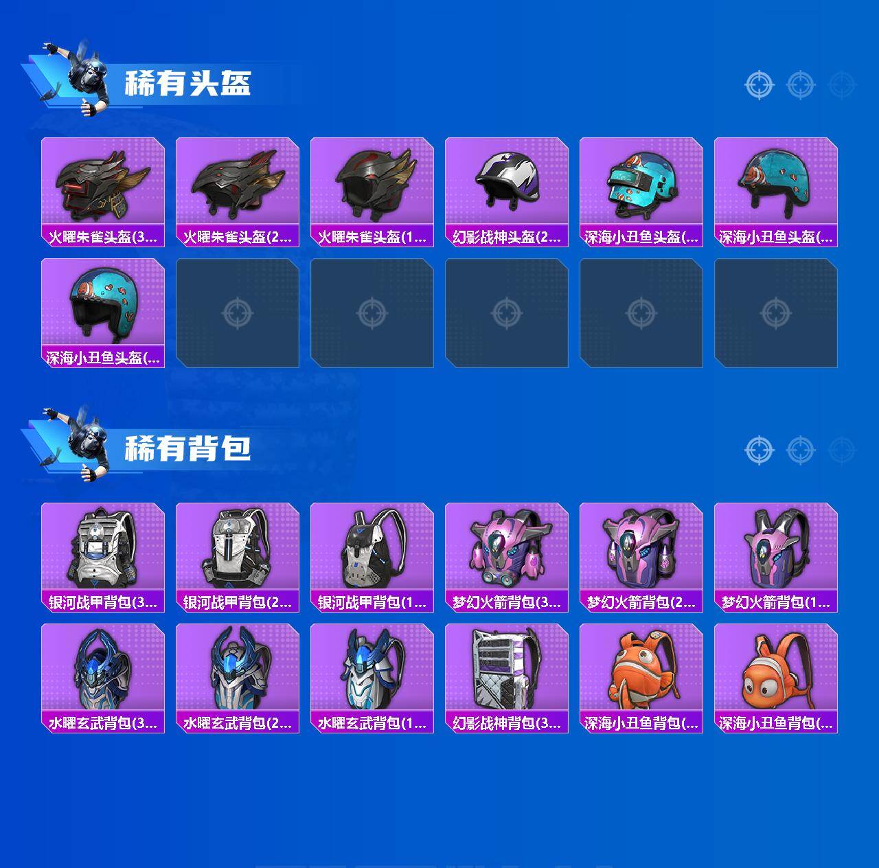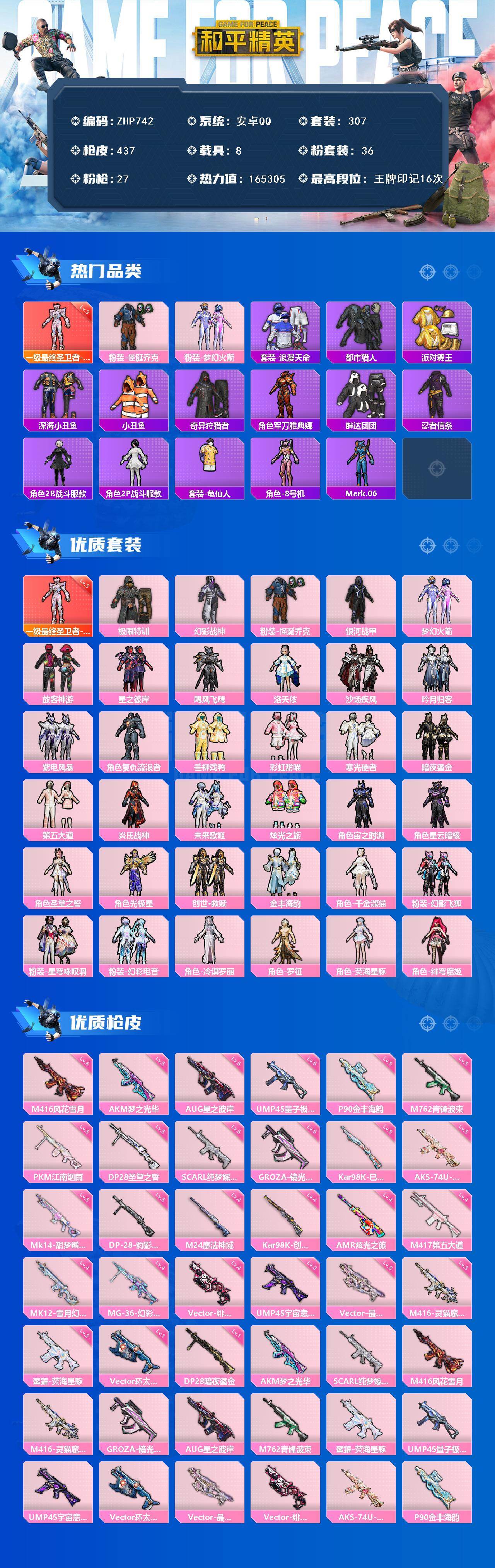 - [11789543]3粉装 4特效枪 8印记 可二次 可修改实名 优质装备:M416风花雪月,七级M416-风花雪月,AUG-暖羊咩咩,Kar98K-巳巳如意 热门装扮:恐龙拽拽,鸾凤武仙,暗夜鎏金,鹰眼刺客,暗夜魅影 稀有枪皮:DP-28-豹影疾电 五级特效枪:五级Kar98K-巳巳如意,五级DP-28-豹影疾电,五级AUG-暖羊咩咩 紫色装扮:田园牧歌,轻风白浪,和煦暖阳,SS22特训,SS23特训,幻彩翩翩,妙红点点,香榭午后,白兰地假日,娇憨猪猪,酸甜橘柚,萌趣咩咩,SS21特训,SS31特训套装,冰川特警,冷焰舞者,旭日情侣,青涩时光,SS20特训,时空追击者,暴风机械师,SS16特训,冰爽风暴,萌趣颜团子,特种颜团子,飞驰魅影,音速流光,SS19特训,军刀雅典娜,豚鼠丹丹,甜心亚梦,虚音幻奏,瑞龙福将,团圆交子,SS17特训,异彩先驱,SS18特训,都市魅力,长空猛禽,雨林探路者,霓虹极客,迎春赐吉,风暴特警,缤纷果语,耀眼新星,虎虎生威吉莉,风行保卫者,蜜露汐语,魅力单车,鹤鸣,麻辣教官,黄色运动,黎明保卫者,龟仙人,龙魂突击队,沙漠毒蛇,极地朋克,柠萌假日,沙漠兵团,暗金炫舞,沙漠雄狮,海岛探路者,涂山之恋,滨海假日,夏日音浪,幻世战舞者,探宝勇士,湖蓝色名流,滨海厨神,白熊同盟,白色伏地魔,破晓战魂,破蛋小黄鸡,福星高照,空投萌叽,突袭者,红色运动,王牌教练,牛气冲天,炫蓝之夏,燃烧卡路里,猛禽,狂战萌兔,狂沙舞者,SS29特训,光矢逐梦,鱼渊荷华,玉兔迎春,燕燕于飞,巳巳如意,竞技名士,惊鸿侠骨,SS24特训(SS24特训套装),SS25特训,锦衣飞扬,SS27特训,浪漫天命,SS26特训,智谋强哥,人鱼之吻,耀粉歌者,绯格组合,漫步者,贵族骑装,冰冻风暴 优质战备:幻星舰长降落伞,太空嘟嘟飞行器,彩虹甜喵降落伞,垂柳戏鸭降落伞,百万伏特降落伞,神秘黑猫降落伞,烈焰拳霸降落伞