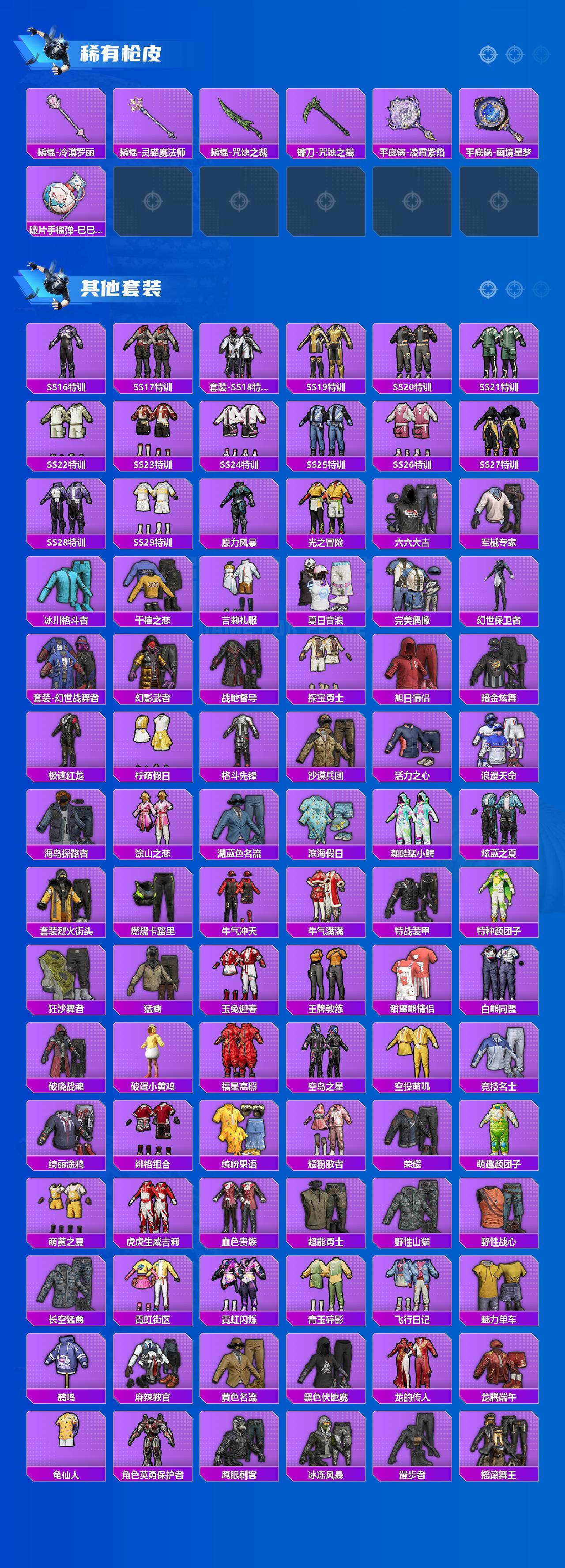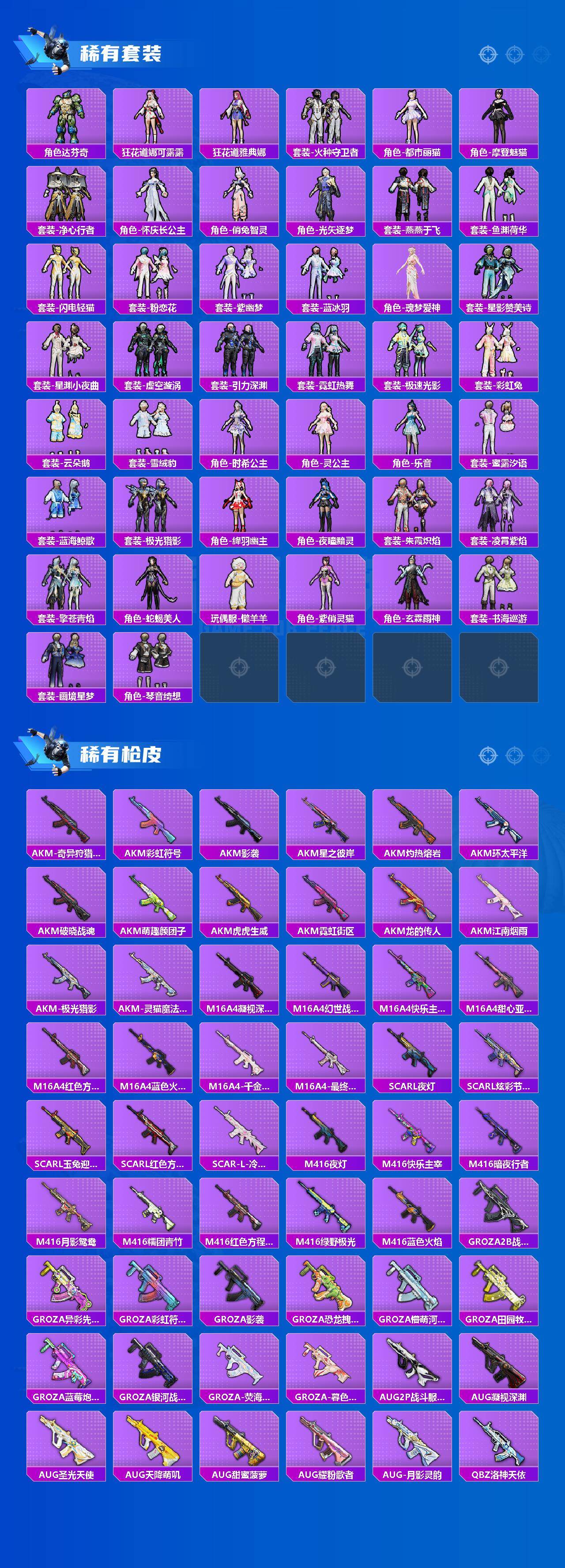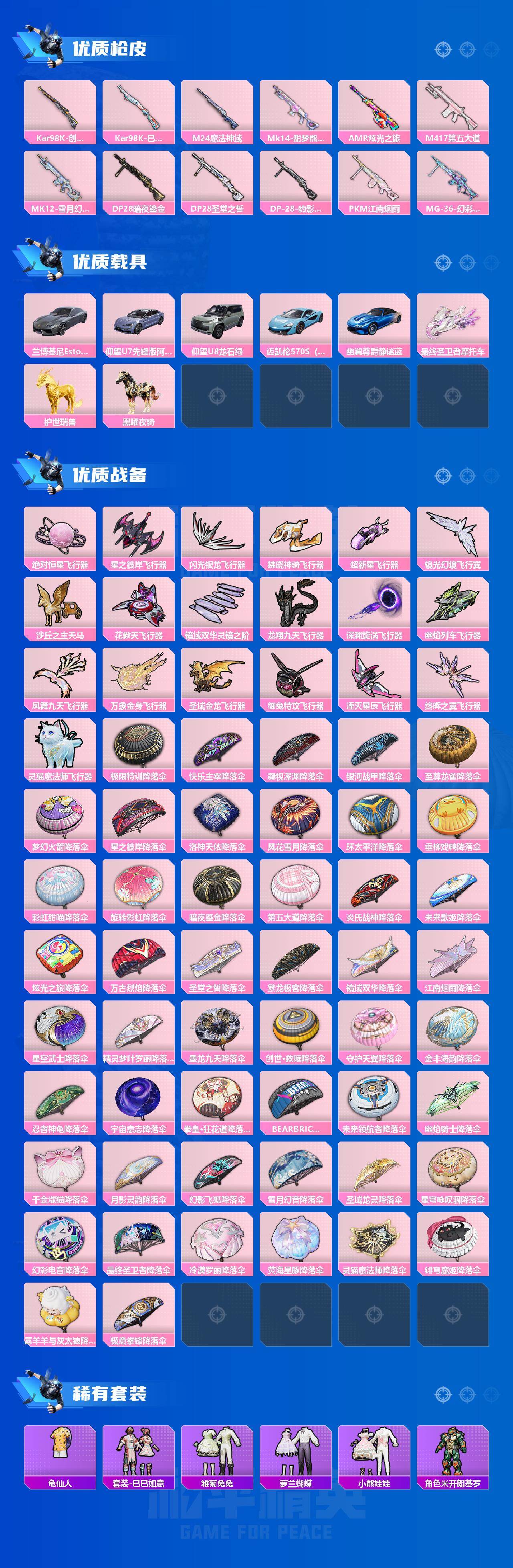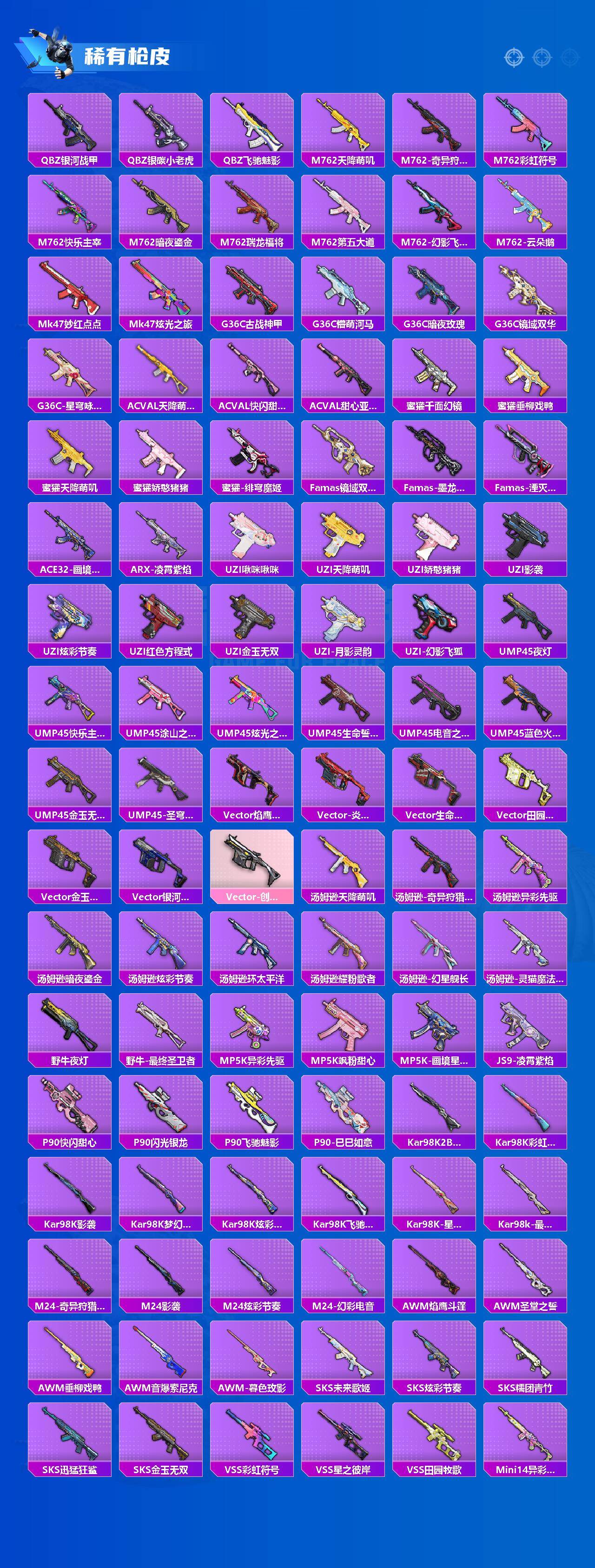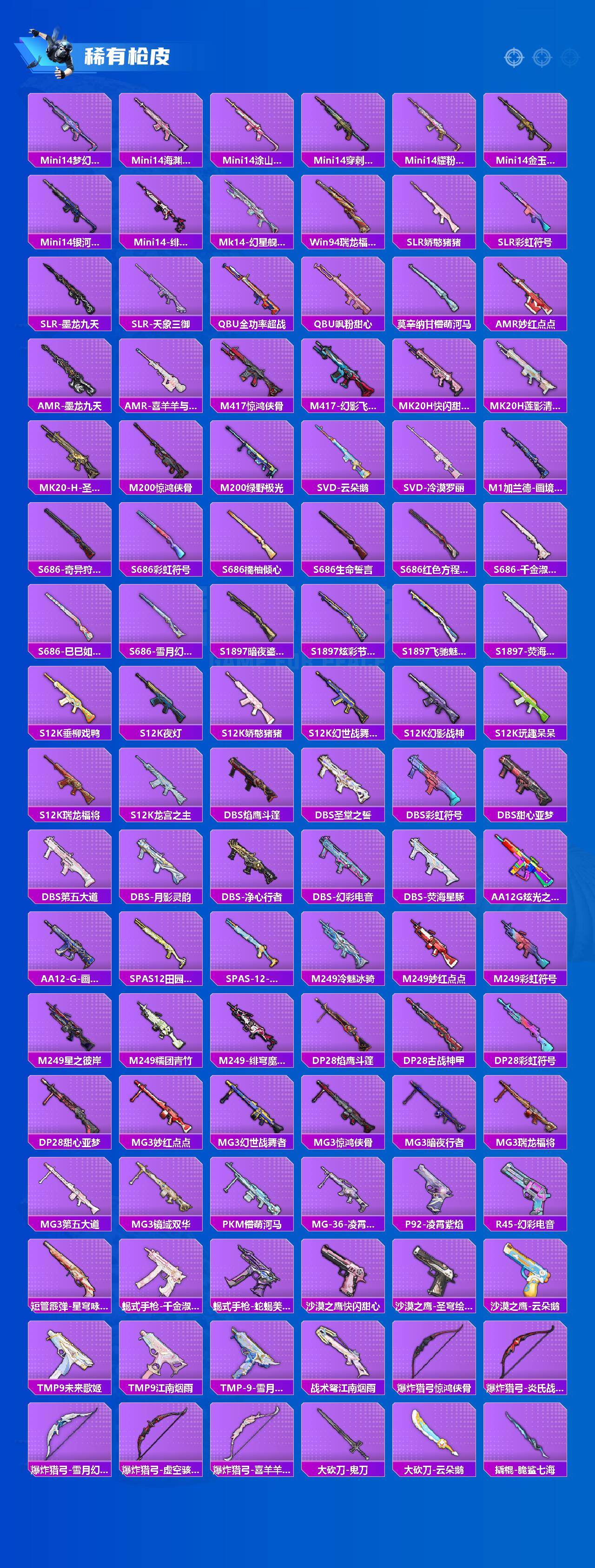AKM-梦之光华,SCAR-L-纯梦嫁纱,M416-风花雪月,GROZA-镜光银凌,AUG-星之彼岸,M762-青锋波束,UMP45-量子极限,UMP45-宇宙意志,Vector-环太平洋,P90-金丰海韵,Kar98K-创世·救赎,Kar98K-巳巳如意,M24-魔法神域,AMR-炫光之旅,M417-第五大道,MK12-雪月幻音,DP-28-暗夜鎏金,DP-28-圣堂之誓,PKM-江南烟雨