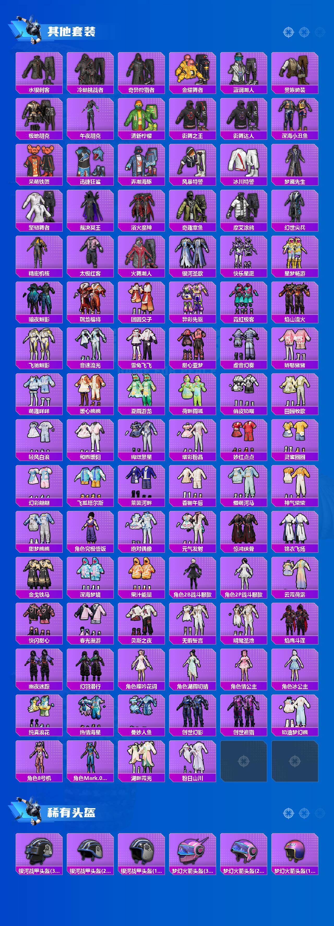 套装-怪诞乔克,套装-梦幻火箭,套装-都市猎人,套装-派对舞王,套装-深海小丑鱼,套装-奇异狩猎者,套装-胖达团团,套装-极限特训,套装-幻影战神,套装-银河战甲,套装-放客神游,套装-星之彼岸,套装-飓风飞鹰,角色-洛天依,套装-沙场疾风,套装-吟月归客,套装-紫电风暴,角色-复仇流浪者,套装-垂柳戏鸭,套装-彩虹甜喵,套装-寒光使者,套装-暗夜鎏金,套装-第五大道,套装-炎氏战神,套装-未来歌姬,套装-炫光之旅,角色-宙之时溯,角色-星云暗核,角色-圣堂之誓,角色-光极星,套装-创世·救赎,套装-金丰海韵,角色-千金淑猫,套装-幻影飞狐,套装-鹰眼刺客,套装-呆萌铁蟹,套装-迅捷狂鲨,套装-梦魇先生