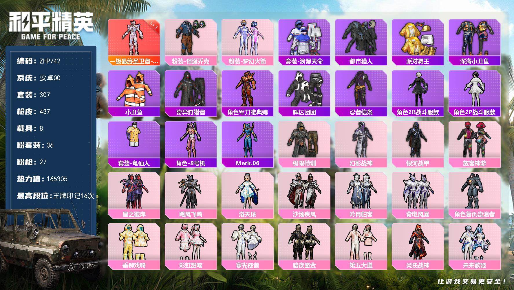 - PX_2103302- 安卓手Q-15王牌印记-7粉装-10特效枪-0载具-81861热力值-177套装-243枪皮-5卓越印记-2传奇印记 【7粉装】,第五大道,冷漠罗丽,沙场疾风,小可学妹,炫光之旅,莲影清波,香水柠檬 【10特效枪】AKM-绿萝繁花-5级 SCAR-L-锦绣绵绵-5级 M416-五爪金龙-6级 GROZA-镜光银凌-5级 AUG-超新星-7级 M762-青锋波束-5级 Kar