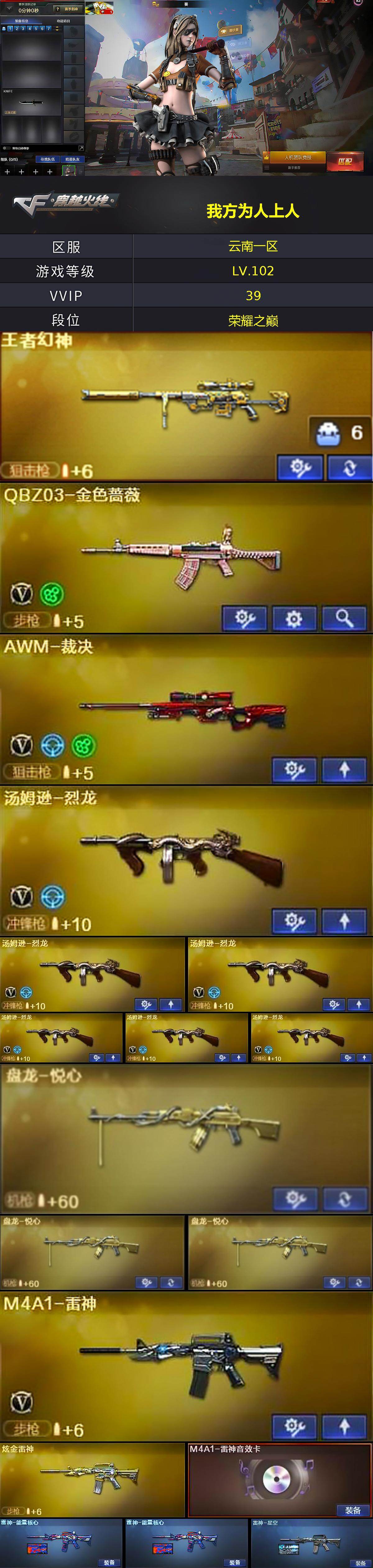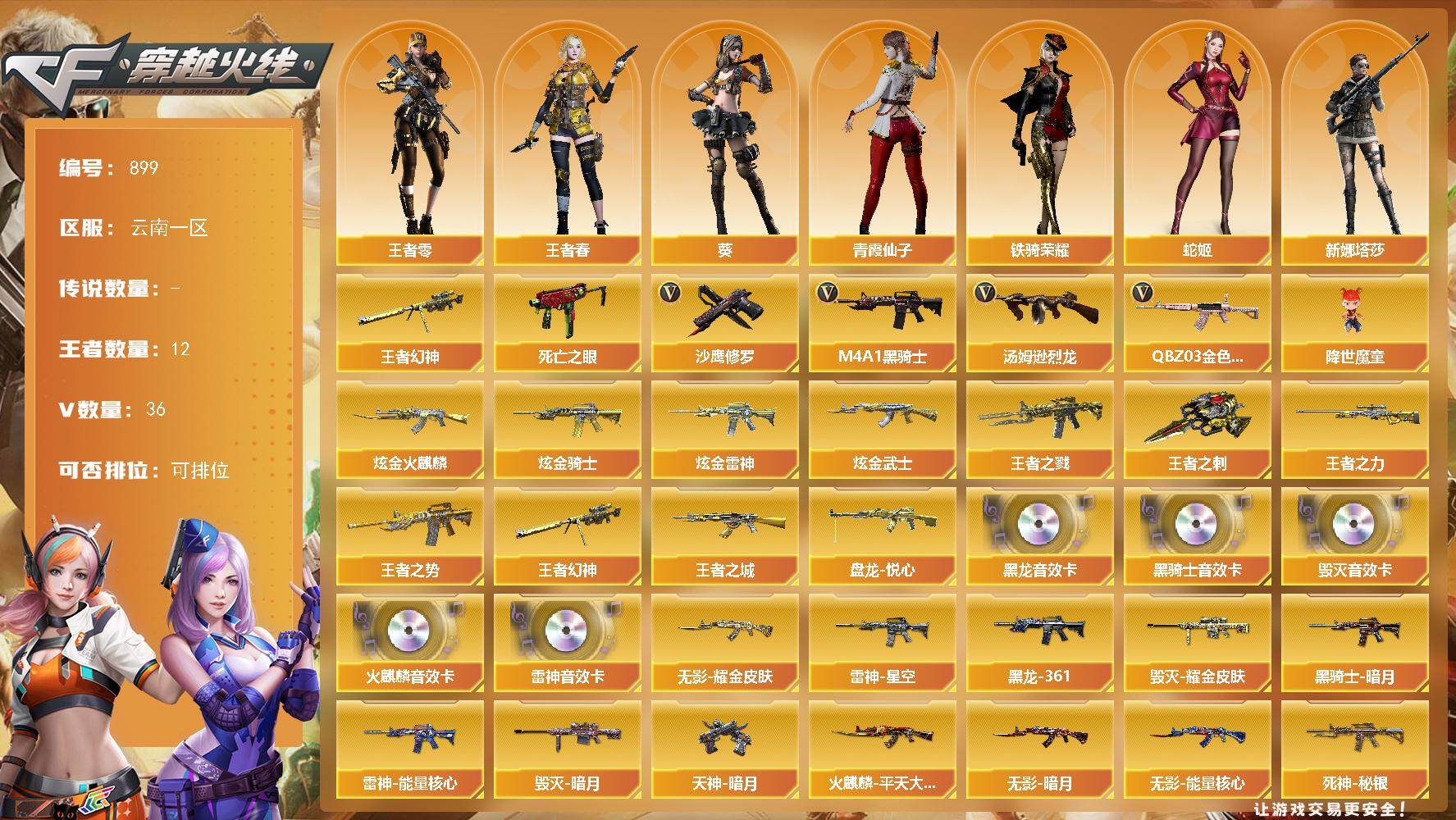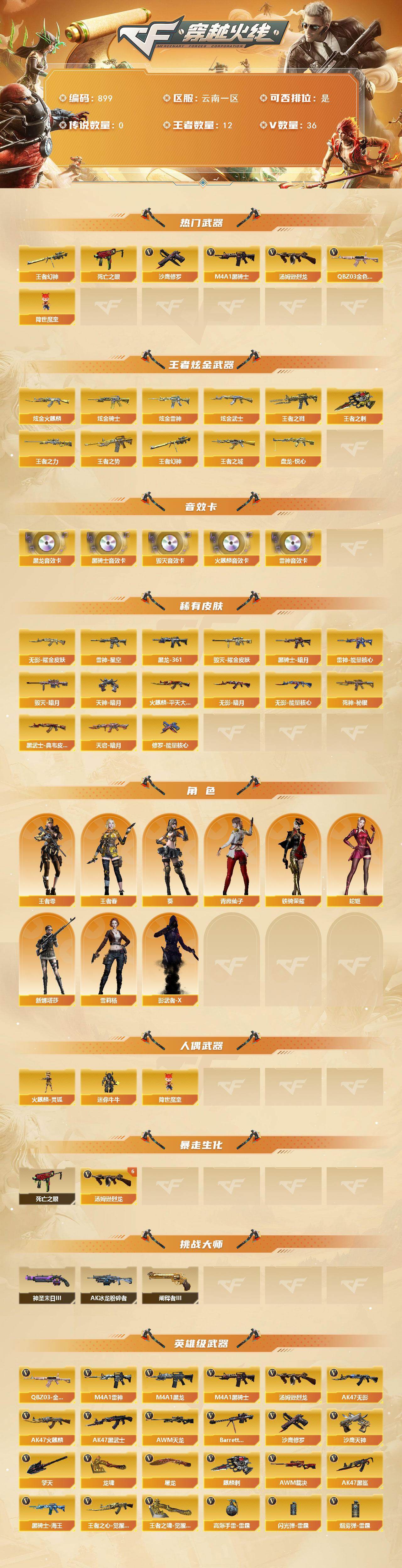 [15633384]云南一区-36V-12王者-4炫金 【热门武器】:王者幻神,QBZ03-金色蔷薇,死亡之眼,M4A1-黑骑士,汤姆逊-烈龙*6,降世魔童,沙鹰-修罗*2 【王者炫金武器】:王者之城,王者之戮,王者之势,王者幻神,王者之力*2,盘龙-悦心*3,王者之刺,炫金火麒麟,炫金骑士,炫金雷神,炫金武士 【音效卡】:AK47-火麒麟音效卡,M4A1-雷神音效卡,M4A1-黑龙音效卡,M4A1-黑骑士音效卡,Barrett-毁灭音效卡 【皮肤】:雷神-能量核心*2,雷神-星空,火麒麟-平天大圣,毁灭-暗月,毁灭耀金皮肤,M4A1-黑龙-361,黑骑士-暗月,无影-暗月*4,无影-能量核心,无影耀金皮肤,死神-秘银,黑武士-典韦皮肤,天启-暗月,修罗-能量核心*2,天神-暗月*2 【角色】:葵,王者-零,王者春,青霞仙子,蛇姬,铁骑荣耀,新娜塔莎,雪莉杨,影武者-X 【人偶武器】:火麒麟-灵狐,迷你牛牛,降世魔童 【暴走生化】:死亡之眼 【挑战大师】:AK47-冰龙粉碎者,神圣爆裂者-末日III*2,阐释者III 【英雄级武器】:AK47-火麒麟*2,M4A1-黑龙,M4A1-雷神,M4A1-黑骑士,AK47-无影,AK47-黑武士,AK47-黑鲨,QBZ03-金色蔷薇,王者之心-觉醒版,黑骑士-海王,AWM-天龙*2,Barrett-毁灭,AWM-裁决,汤姆逊-烈龙*6,沙鹰-修罗*2,沙鹰-天神,屠龙*4,龙啸,擎天,麒麟刺,王者之啸-觉醒版,高爆手雷-雷霆,闪光弹-雷霆,烟雾弹-雷霆 【道具】:战舰背包,绿色巨人,灵魂忍者,迷雾幽灵,生化弹匣,夺命之镰,防化服*2,枪王排位29赛季金色流光,防弹头盔*8,防弹衣*8,C4工具钳*4,手雷包*2 【特殊枪械】:1黑骑士,6烈龙
