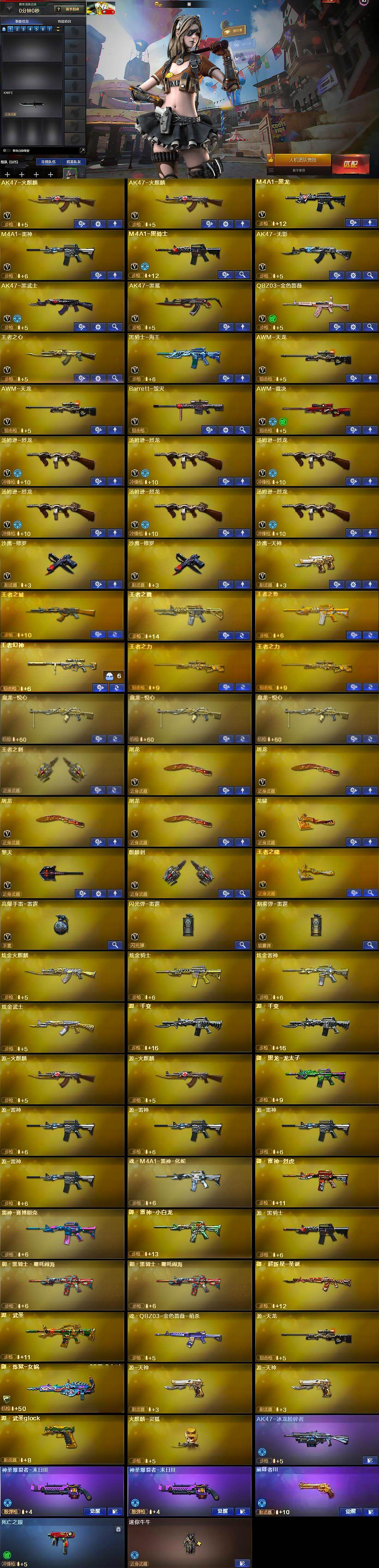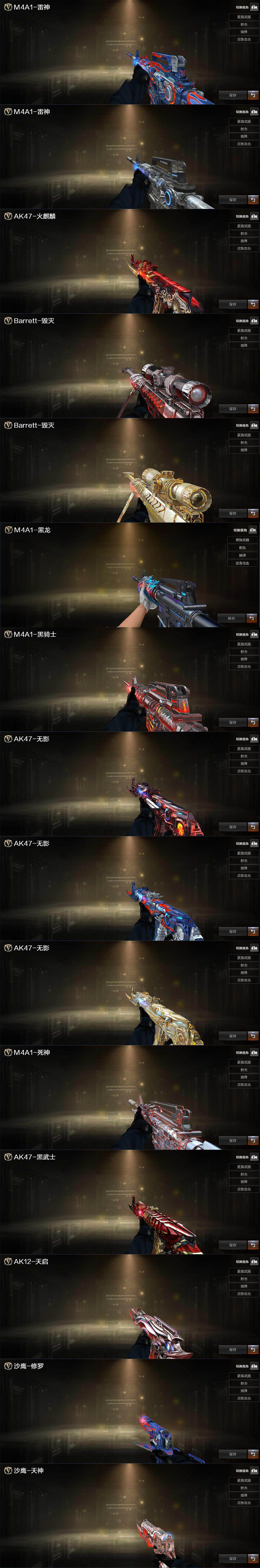 【英雄级武器】:AK47-火麒麟*2,M4A1-黑龙,M4A1-雷神,M4A1-黑骑士,AK47-无影,AK47-黑武士,AK47-黑鲨,QBZ03-金色蔷薇,王者之心-觉醒版,黑骑士-海王,AWM-天龙*2,Barrett-毁灭,AWM-裁决,汤姆逊-烈龙*6,沙鹰-修罗*2,沙鹰-天神,屠龙*4,龙啸,擎天,麒麟刺,王者之啸-觉醒版,高爆手雷-雷霆,闪光弹-雷霆,烟雾弹-雷霆