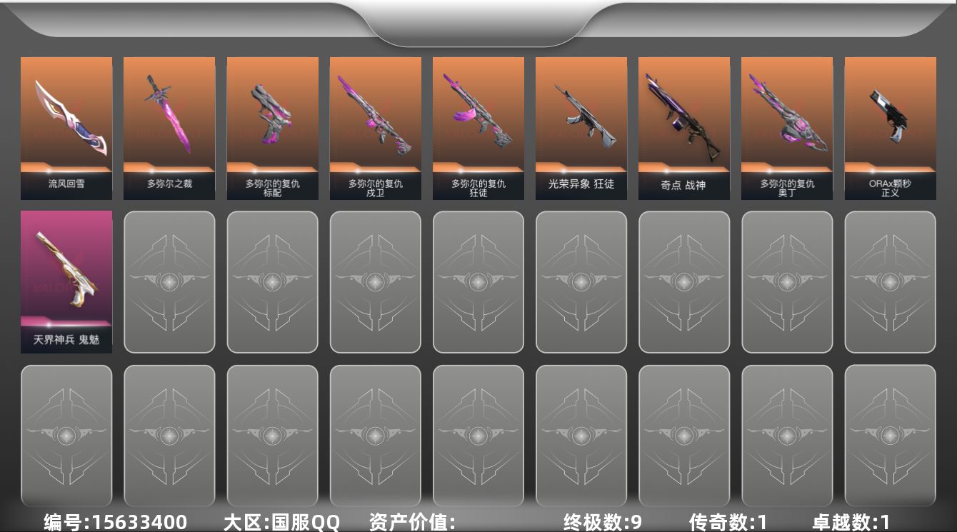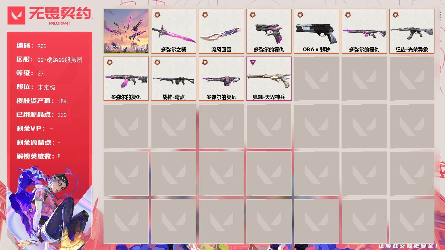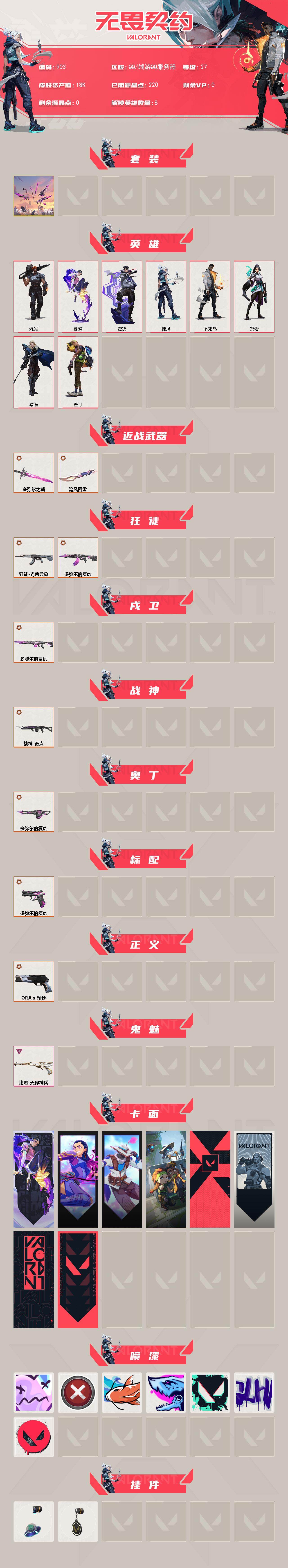 [15633400]【套装】:多弥尔的复仇套装 【英雄】:炼狱,暮蝶,壹决,捷风,不死鸟,贤者,猎枭,盖可 【近战武器】:近战武器-流风回雪,近战武器-多弥尔之裁 【狂徒】:狂徒-光荣异象,狂徒-多弥尔的复仇 【戍卫】:戍卫-多弥尔的复仇 【战神】:战神-奇点 【奥丁】:奥丁-多弥尔的复仇 【标配】:标配-多弥尔的复仇 【正义】:正义-ORA x 颗秒 【鬼魅】:鬼魅-天界神兵 【卡面】:无畏契约:暮蝶 卡面,无畏契约GO!第一卷:芮娜 卡面,无畏契约GO!第一卷:零 卡面,别冒尖 卡面,代号红色 卡面,新兵报到 卡面,V契约 卡面,无畏契约 卡面 【喷漆】:伤心心 喷漆,买装还是存钱 喷漆,红鳞 喷漆,暴走萝莉 喷漆,胜利属于无畏契约 喷漆,GLHF 喷漆,无畏契约 喷漆 【挂饰】:天外飞客 挂饰,无畏契约 纪念币 挂饰