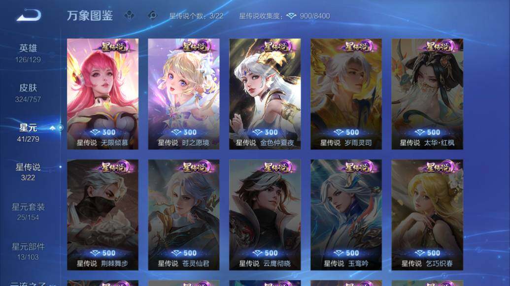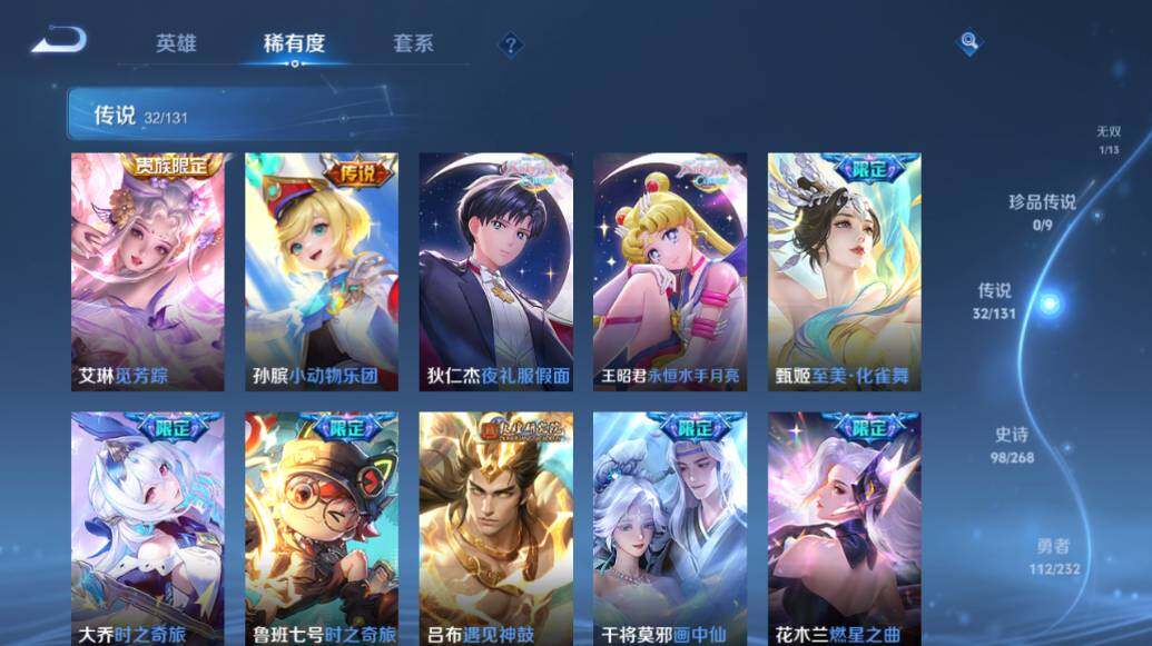 【荣耀典藏】:武则天英雄,孙悟空全息碎影,武则天倪克斯神谕,小乔天鹅之梦,孙尚香杀手不太冷,鲁班七号星空梦想,李白鸣剑曳影,诸葛亮星域神启,花木兰九霄神辉,铠银白咏叹调