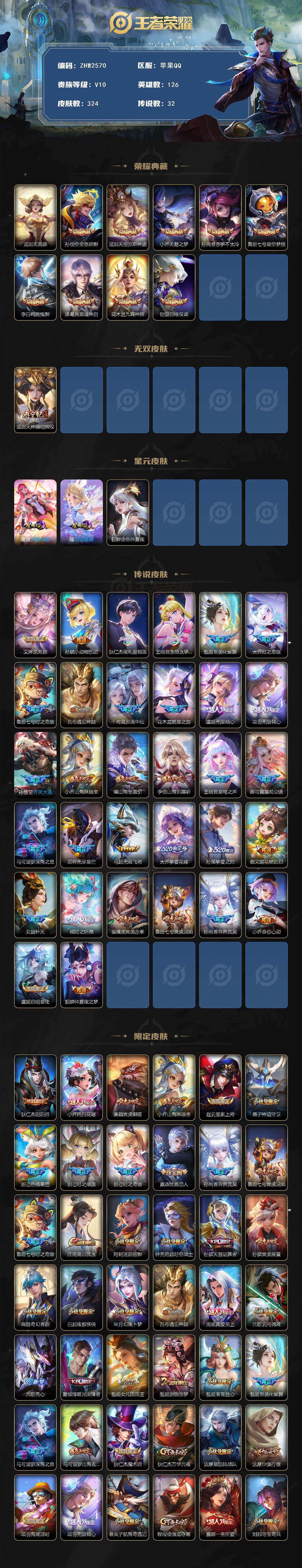 [15633616]苹果Q-V10-荣耀黄金IV段位-126英雄-324皮肤-9典藏皮肤-1典藏英雄-1无双-32传说-98史诗-3星元