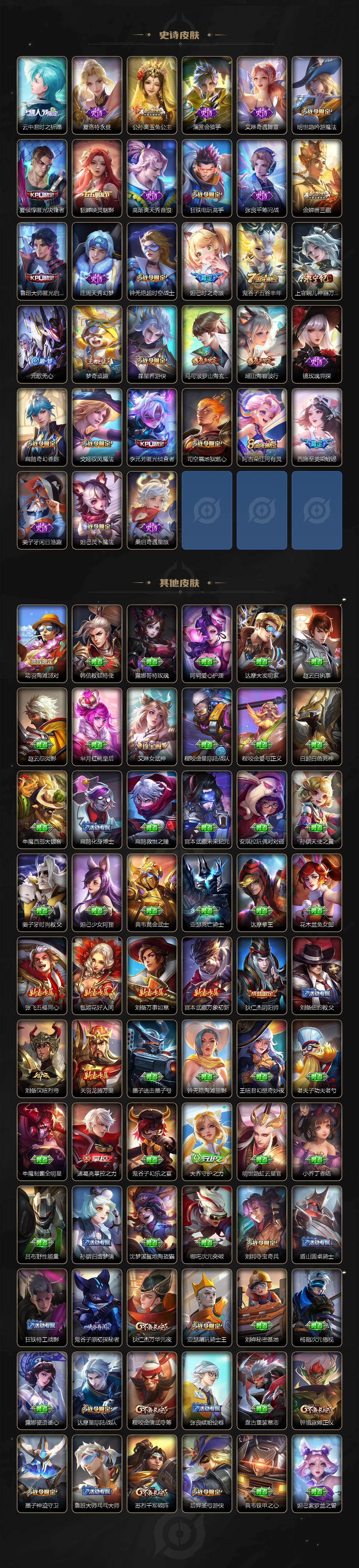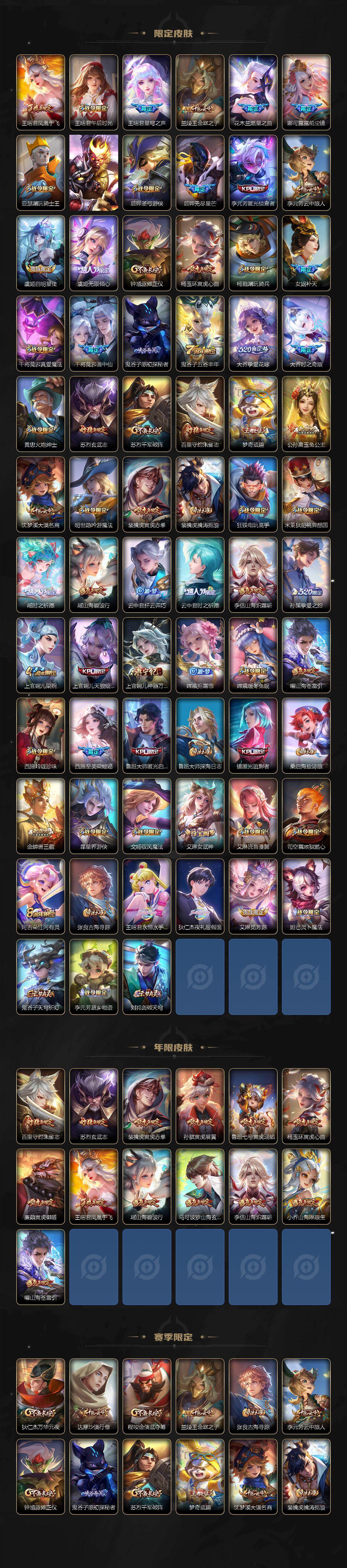 【限定皮肤】:狄仁杰阴阳师,小乔纯白花嫁,廉颇寅虎御盾,小乔山海琳琅生,赵云皇家上将,墨子神迹守卫,妲己热情桑巴,妲己时之彼端,妲己时之奇旅,嬴政优雅恋人,孙尚香异界灵契,鲁班七号寅虎瑞焰,鲁班七号时之奇旅,庄周高山流水,阿轲迷踪丽影,钟无艳超时空战士,孙膑天狼运算者,孙膑寅虎展翼,扁鹊奇幻香踪,白起夜都怪侠,芈月幻夜卜梦,吕布遇见神鼓,周瑜真爱至上,元歌云间偶戏,元歌无心,夏侯惇匿光决锋者,甄姬女儿国国王,甄姬游园惊梦,甄姬落雪兰心,甄姬至美化雀舞,马可波罗深海之息,马可波罗山海玄木吟,狄仁杰魔术师,狄仁杰万华元夜,达摩星际陆战队,达摩沙漠行僧,项羽海滩派对,项羽无限倾心,老夫子航海奇遇记,程咬金演武夺筹,露娜一生所爱,刘邦夺宝奇兵,王昭君凤凰于飞,王昭君午后时光,王昭君星穹之声,兰陵王金庭之子,花木兰燃星之曲,娜可露露前尘镜,亚瑟潮玩骑士王,孙悟空齐天大圣,后羿圣弓游侠,后羿无尽星芒,李元芳匿光侦查者,李元芳云中旅人,虞姬启明星使,虞姬无限倾心,钟馗驱傩正仪,杨玉环寅虎心曲,杨戬潮玩骑兵,女娲补天,干将莫邪真爱魔法,干将莫邪画中仙,鬼谷子原初探秘者,鬼谷子五谷丰年,大乔挚爱花嫁,大乔时之奇旅,黄忠火炮绅士,苏烈玄武志,苏烈千军破阵,百里守约朱雀志,梦奇顽趣,公孙离玉兔公主,沈梦溪大漠名商,明世隐吟游魔法