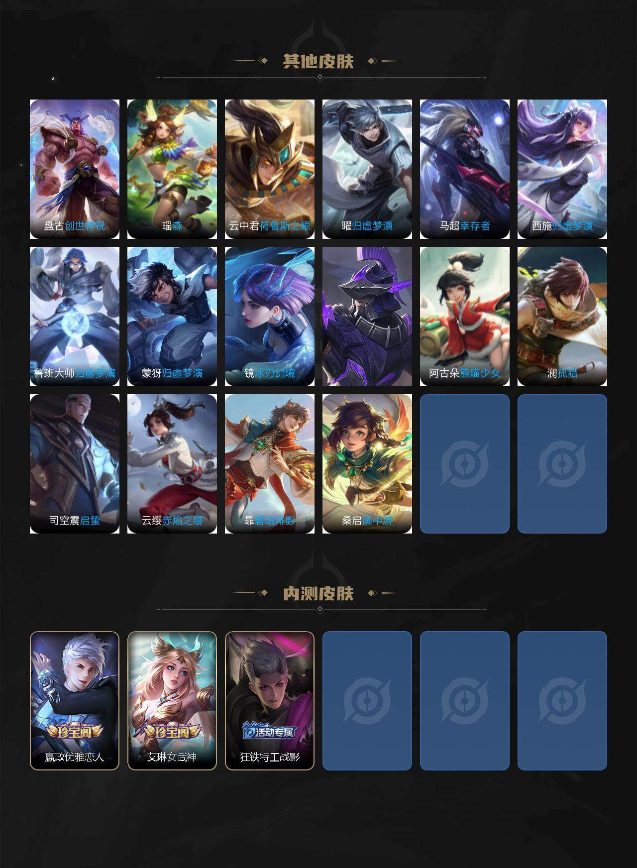 瑶遇见神鹿,娜可露露晚萤,李元芳逐浪之夏,大乔猫狗日记,阿轲节奏热浪,诸葛亮黄金分割率,王昭君偶像歌手,项羽苍穹之光,雅典娜冰冠公主,吕布末日机甲,鲁班七号电玩小子,墨子龙骑士,刘禅天才门将,白起星夜王子,安琪拉心灵骇客,安琪拉时之奇旅,程咬金功夫厨神,刘邦德古拉伯爵,兰陵王暗隐猎兽者,曹操幽灵船长,宫本武藏鬼剑武藏,亚瑟心灵战警,蔡文姬舞动绿茵,廉颇地狱岩魂,小乔缤纷独角兽,花木兰水晶猎龙者,墨子金属风暴,吕布圣诞狂欢,貂蝉圣诞恋歌,百里守约特工魅影,嫦娥拒霜思,李白千年之狐,夏洛特永昼,澜赏金猎手,艾琳奇遇舞章,貂蝉唤灵魅影,高渐离天秀·音浪,张良千筹问战,庄周天秀·幻梦,镜玫瑰异探,李元芳匿光侦查者,姜子牙闲日渔趣,桑启奇遇星旅