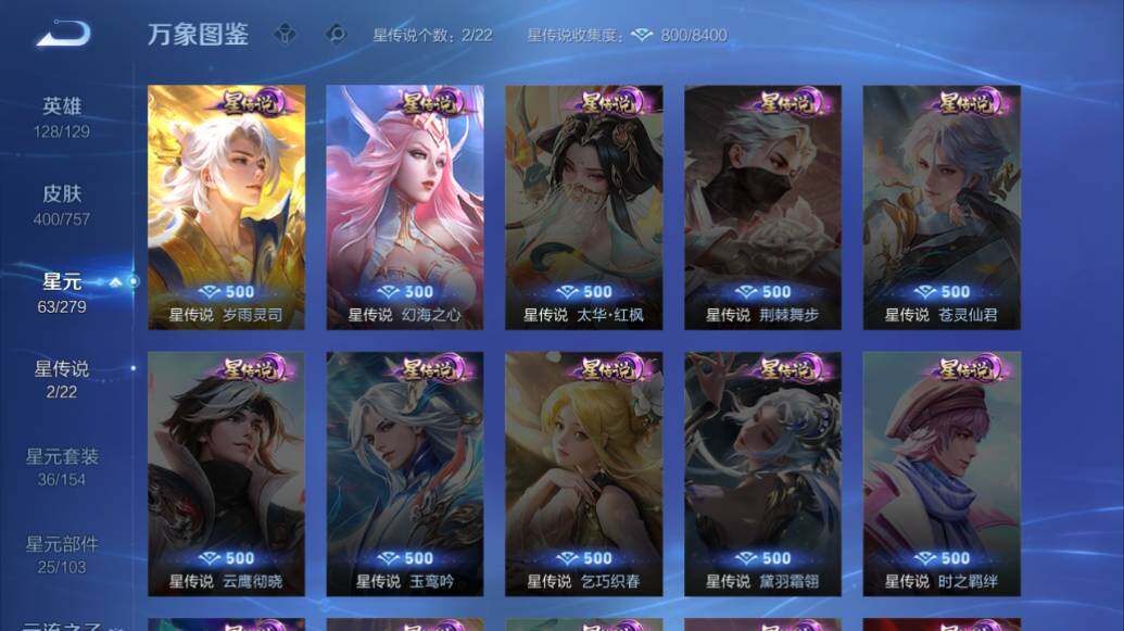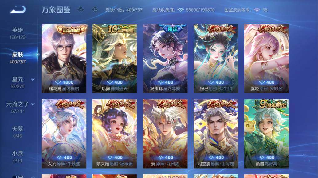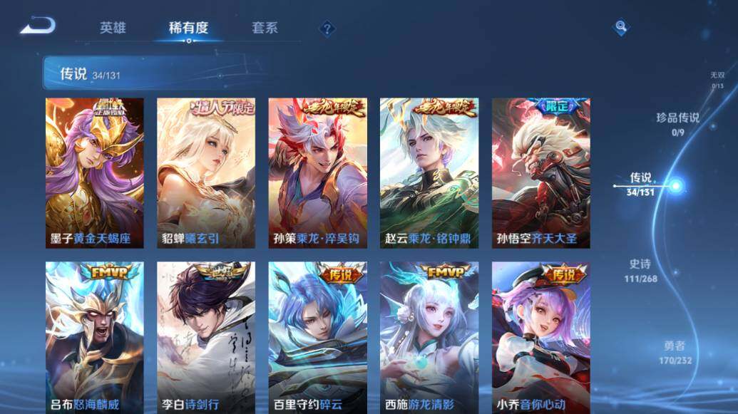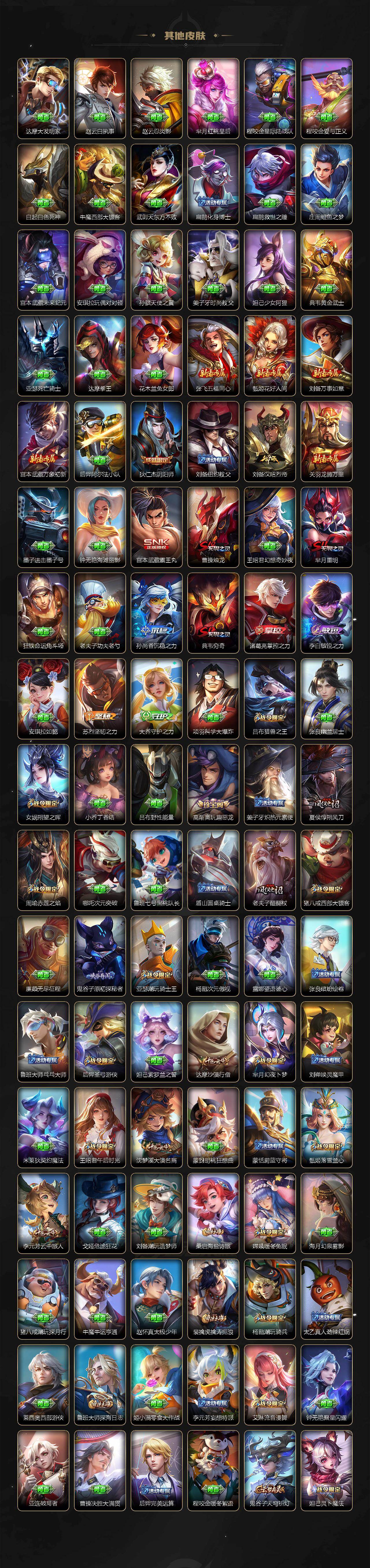 【限定皮肤】:铠冥王哈迪斯,蒙犽顽岩魄,蔡文姬夏日便利店,大乔绒语心约,虞姬夏日便利店,狄仁杰阴阳师,赵云皇家上将,赵云龙胆,墨子降魔,嬴政白昼王子,高渐离玩趣恶龙,钟无艳超时空战士,扁鹊奇幻香踪,芈月重明,芈月幻夜卜梦,吕布猎兽之王,周瑜赤莲之焰,元歌云间偶戏,元歌无心,夏侯惇朔风刀,甄姬游园惊梦,甄姬落雪兰心,曹操烛龙,典韦穷奇,典韦蓝屏警告,典韦岱宗,马可波罗暗影游猎,马可波罗山海玄木吟,狄仁杰魔术师,达摩沙漠行僧,项羽海滩派对,老夫子醍醐杖,王昭君午后时光,兰陵王驯魔猎人,亚瑟潮玩骑士王,孙悟空零号赤焰,孙悟空孙行者,孙悟空齐天大圣,后羿圣弓游侠,李元芳云中旅人,虞姬启明星使,杨戬潮玩骑兵,女娲朔望之晖,蔡文姬繁星吟游,鬼谷子原初探秘者,鬼谷子五谷丰年,黄忠烈魂,黄忠火炮绅士,铠青龙志,沈梦溪大漠名商,裴擒虎李小龙,裴擒虎擒涛扼浪,狂铁电玩高手,云中君纤云弄巧,猪八戒西部大镖客,上官婉儿梁祝,嫦娥拒霜思,嫦娥暖冬兔眠,鲁班大师探海日志,桑启海盐诗旅,艾琳流音漫舞,司空震地狱燃心,阿古朵江河有灵,高渐离燃音魔法,妲己灵卜魔法,鬼谷子天穹祈灯,伽罗琥珀纪元,大乔乘龙忆丹青,安琪拉乘龙聚宝船,孙策乘龙淬吴钩,赵云乘龙铭钟鼎,貂蝉曦玄引,沈梦溪龙舞盛年,鲁班七号蔬乡物语,李元芳蔬乡物语,程咬金群星魔术团,项羽苍威无极,刘备异域游侠