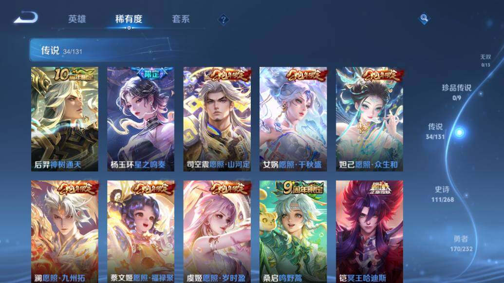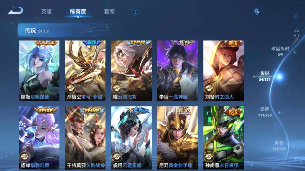 【传说皮肤】:后羿神树通天,杨玉环星之鸣奏,司空震愿照山河定,女娲愿照千秋盛,妲己愿照众生和,澜愿照九州拓,蔡文姬愿照福禄聚,虞姬愿照岁时盈,桑启鸣野蒿,铠冥王哈迪斯,墨子黄金天蝎座,貂蝉曦玄引,孙策乘龙淬吴钩,赵云乘龙铭钟鼎,孙悟空齐天大圣,吕布怒海麟威,李白诗剑行,百里守约碎云,西施游龙清影,小乔音你心动,虞姬启明星使,孙悟空零号赤焰,曜云鹰飞将,李信一念神魔,刘备时之恋人,貂蝉猫影幻舞,干将莫邪久胜战神,虞姬云霓雀翎,后羿黄金射手座,孙尚香末日机甲,宫本武藏地狱之眼,孙悟空地狱火,武则天海洋之心,狄仁杰超时空战士