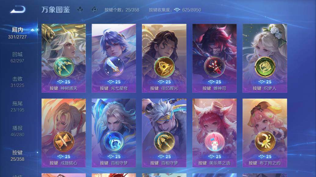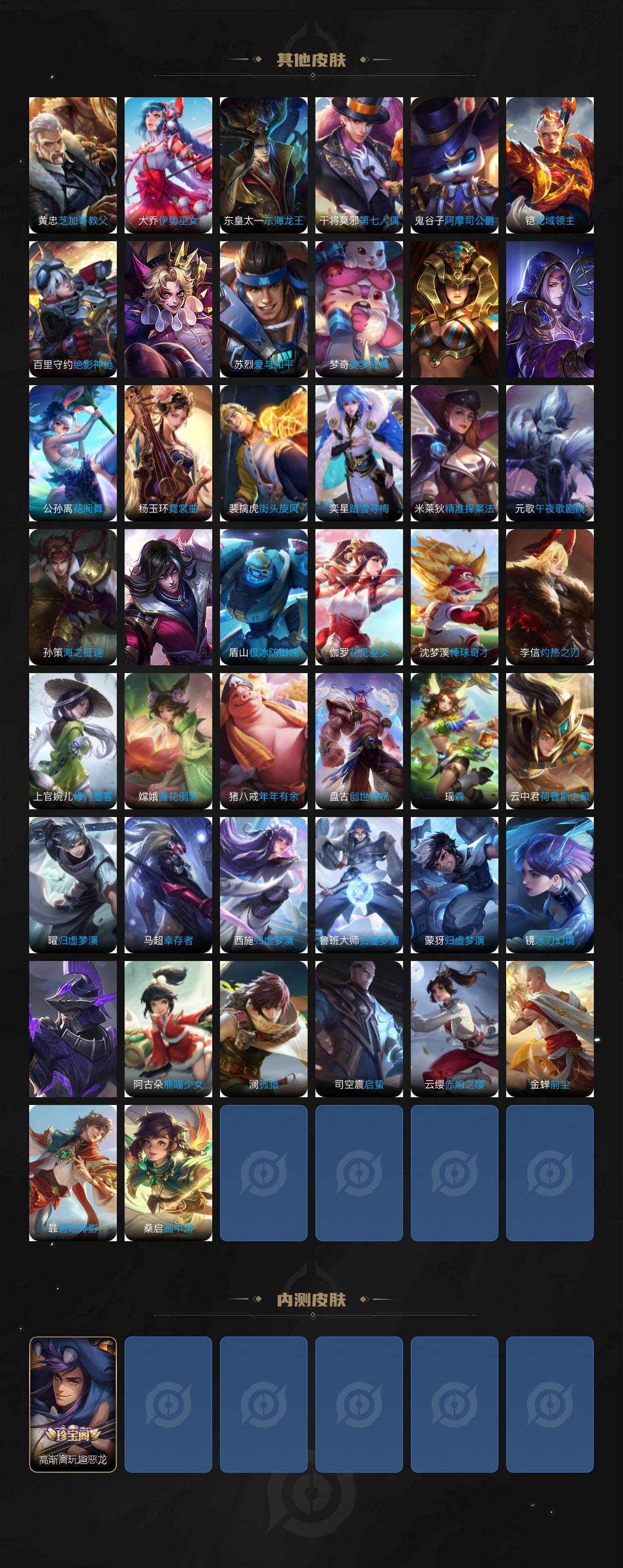 裴擒虎李小龙,上官婉儿梁祝,赵云龙胆,黄忠烈魂,典韦岱宗,铠青龙志,孙悟空孙行者,墨子降魔,李白诗剑行,马可波罗山海·玄木吟,桑启鸣野蒿,澜愿照·九州拓,蔡文姬愿照·福禄聚,虞姬愿照·岁时盈,司空震愿照·山河定,妲己愿照·众生和,女娲愿照·千秋盛