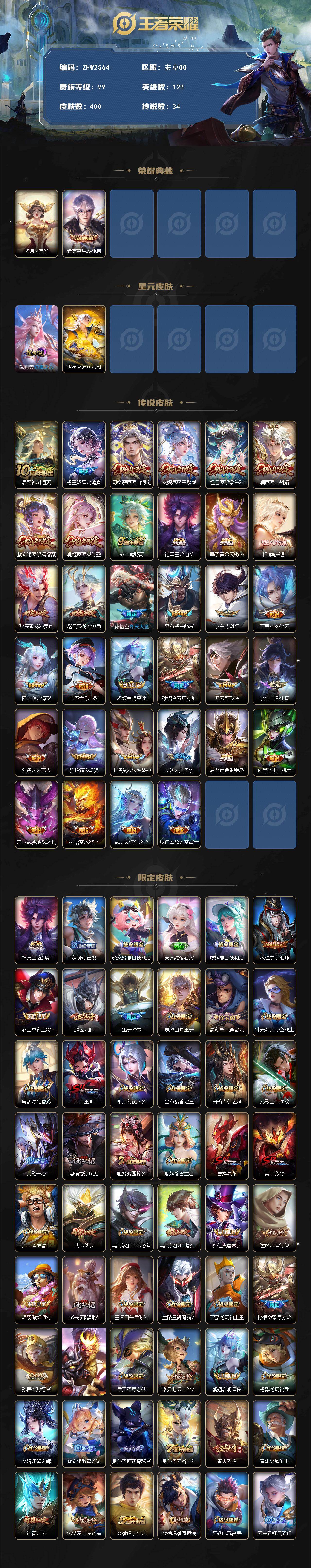 [15633713]安卓Q-V9-荣耀黄金I段位-128英雄-400皮肤-1典藏皮肤-1典藏英雄-34传说-111史诗-2星传