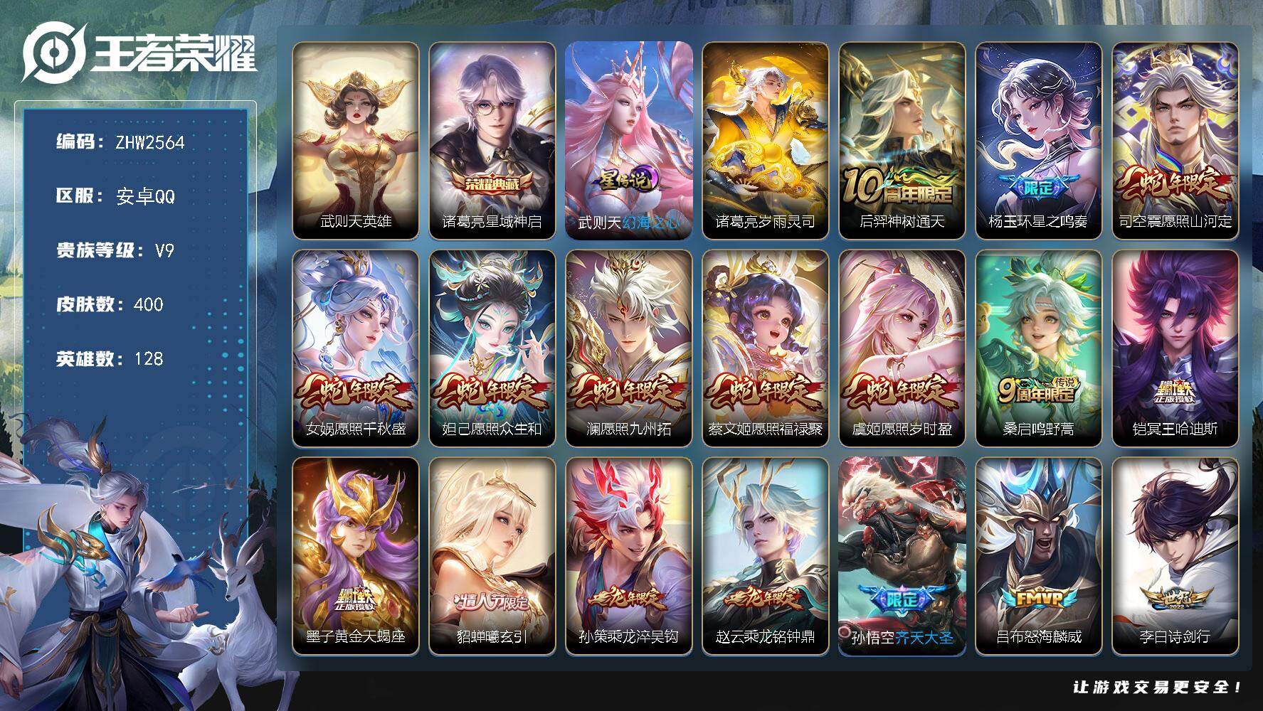 [15633713]安卓Q-V9-荣耀黄金I段位-128英雄-400皮肤-1典藏皮肤-1典藏英雄-34传说-111史诗-2星传 【英雄全皮】:孙权全皮,司空震全皮,空空儿全皮,影全皮 【荣耀典藏】:武则天英雄,诸葛亮星域神启 【传说皮肤】:后羿神树通天,杨玉环星之鸣奏,司空震愿照山河定,女娲愿照千秋盛,妲己愿照众生和,澜愿照九州拓,蔡文姬愿照福禄聚,虞姬愿照岁时盈,桑启鸣野蒿,铠冥王哈迪斯,墨子黄金天蝎座,貂蝉曦玄引,孙策乘龙淬吴钩,赵云乘龙铭钟鼎,孙悟空齐天大圣,吕布怒海麟威,李白诗剑行,百里守约碎云,西施游龙清影,小乔音你心动,虞姬启明星使,孙悟空零号赤焰,曜云鹰飞将,李信一念神魔,刘备时之恋人,貂蝉猫影幻舞,干将莫邪久胜战神,虞姬云霓雀翎,后羿黄金射手座,孙尚香末日机甲,宫本武藏地狱之眼,孙悟空地狱火,武则天海洋之心,狄仁杰超时空战士 【限定皮肤】:铠冥王哈迪斯,蒙犽顽岩魄,蔡文姬夏日便利店,大乔绒语心约,虞姬夏日便利店,狄仁杰阴阳师,赵云皇家上将,赵云龙胆,墨子降魔,嬴政白昼王子,高渐离玩趣恶龙,钟无艳超时空战士,扁鹊奇幻香踪,芈月重明,芈月幻夜卜梦,吕布猎兽之王,周瑜赤莲之焰,元歌云间偶戏,元歌无心,夏侯惇朔风刀,甄姬游园惊梦,甄姬落雪兰心,曹操烛龙,典韦穷奇,典韦蓝屏警告,典韦岱宗,马可波罗暗影游猎,马可波罗山海玄木吟,狄仁杰魔术师,达摩沙漠行僧,项羽海滩派对,老夫子醍醐杖,王昭君午后时光,兰陵王驯魔猎人,亚瑟潮玩骑士王,孙悟空零号赤焰,孙悟空孙行者,孙悟空齐天大圣,后羿圣弓游侠,李元芳云中旅人,虞姬启明星使,杨戬潮玩骑兵,女娲朔望之晖,蔡文姬繁星吟游,鬼谷子原初探秘者,鬼谷子五谷丰年,黄忠烈魂,黄忠火炮绅士,铠青龙志,沈梦溪大漠名商,裴擒虎李小龙,裴擒虎擒涛扼浪,狂铁电玩高手,云中君纤云弄巧,猪八戒西部大镖客,上官婉儿梁祝,嫦娥拒霜思,嫦娥暖冬兔眠,鲁班大师探海日志,桑启海盐诗旅,艾琳流音漫舞,司空震地狱燃心,阿古朵江河有灵,高渐离燃音魔法,妲己灵卜魔法,鬼谷子天穹祈灯,伽罗琥珀纪元,大乔乘龙忆丹青,安琪拉乘龙聚宝船,孙策乘龙淬吴钩,赵云乘龙铭钟鼎,貂蝉曦玄引,沈梦溪龙舞盛年,鲁班七号蔬乡物语,李元芳蔬乡物语,程咬金群星魔术团,项羽苍威无极,刘备异域游侠 【年限皮肤】:铠青龙志,典韦岱宗,黄忠烈魂,赵云龙胆,马可波罗山海玄木吟,大乔乘龙忆丹青,安琪拉乘龙聚宝船,孙策乘龙
