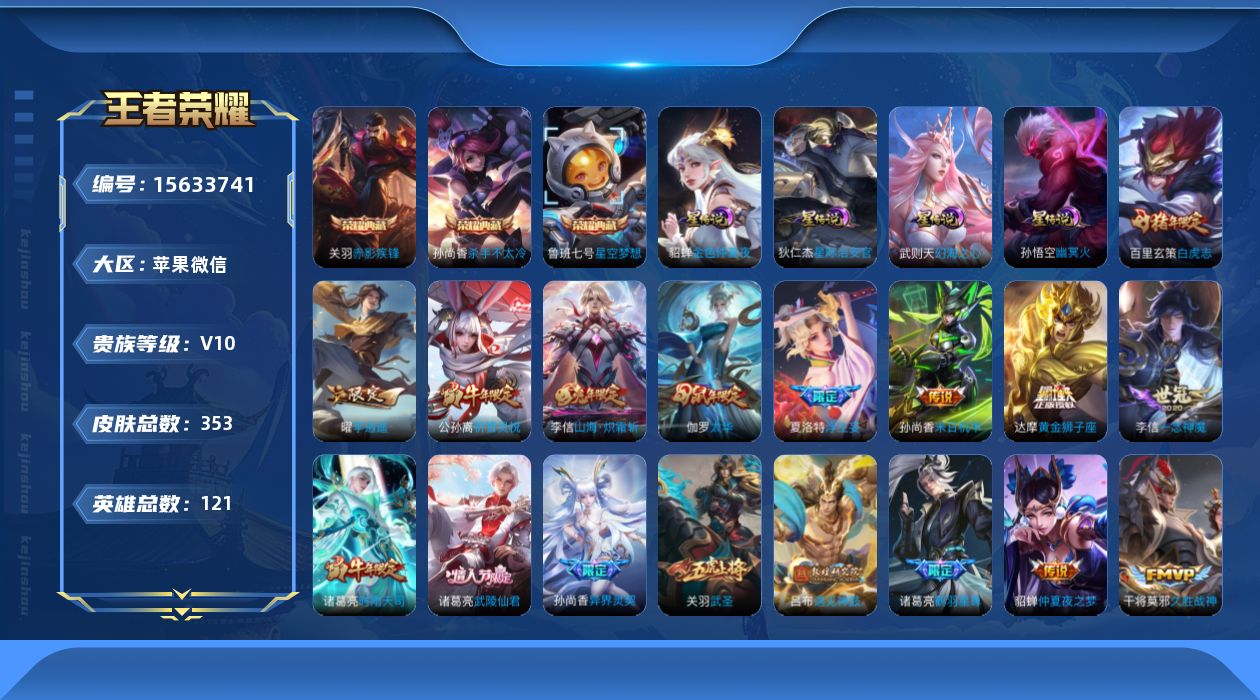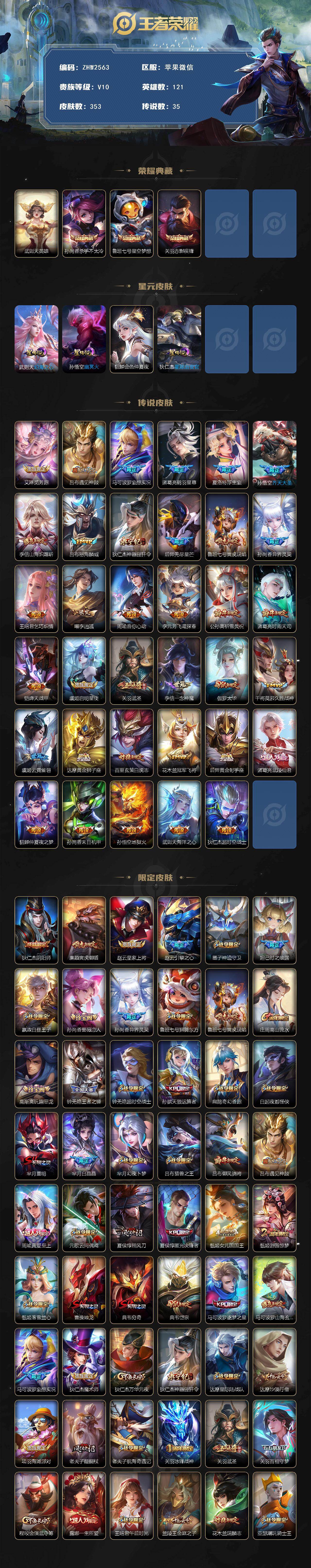 [15633741]苹果WX-V10-荣耀黄金IV段位-121英雄-353皮肤-4典藏-35传说-114史诗-4星传