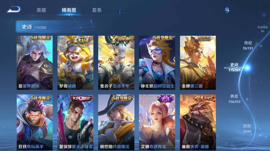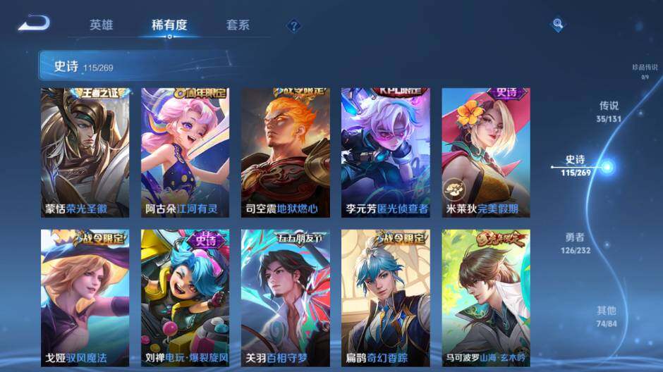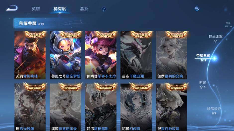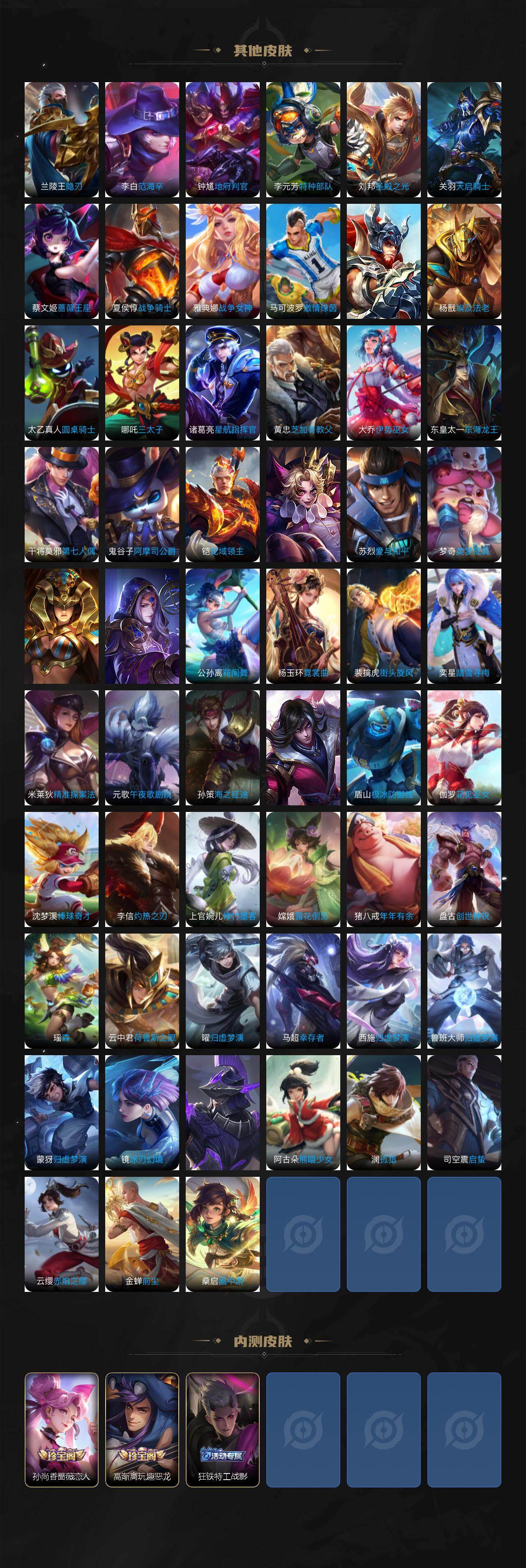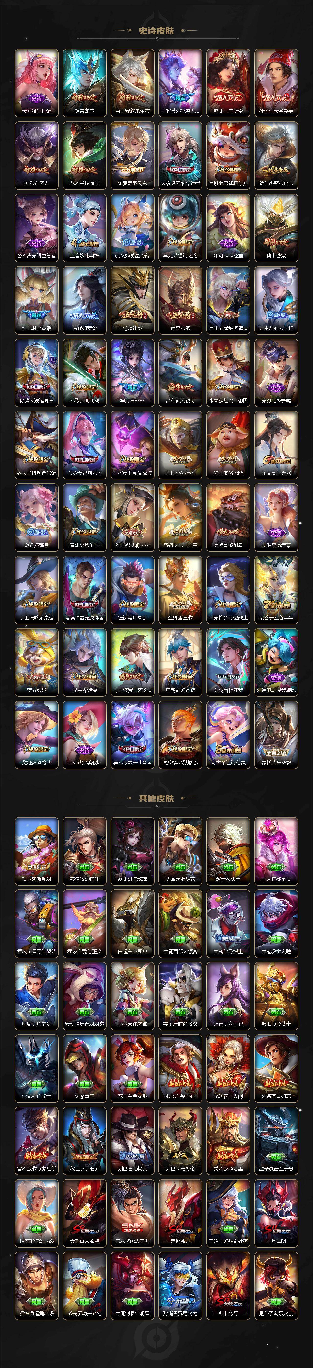 关羽冰锋战神,上官婉儿梁祝,公孙离祈雪灵祝,吕布御风骁将,诸葛亮时雨天司,关羽武圣,黄忠烈魂,马超神威,典韦岱宗,伽罗太华,裴擒虎天狼狩猎者,孙膑天狼运算者,伽罗天狼溯光者,马可波罗逐梦之星,东皇太一逐梦之光,铠青龙志,百里玄策白虎志,花木兰瑞麟志,苏烈玄武志,百里守约朱雀志,周瑜真爱至上,孙悟空大圣娶亲,露娜一生所爱,后羿如梦令,雅典娜神奇女侠,干将莫邪冰霜恋舞曲,妲己时之彼端,芈月白晶晶,赵云引擎之心,猪八戒猪悟能,廉颇寅虎·御盾,孙尚香异界灵契,孙悟空孙行者,甄姬女儿国国王,鲁班七号寅虎·瑞焰,夏侯惇匿光决锋者,后羿无尽星芒,金蝉唐三藏,马可波罗山海·玄木吟