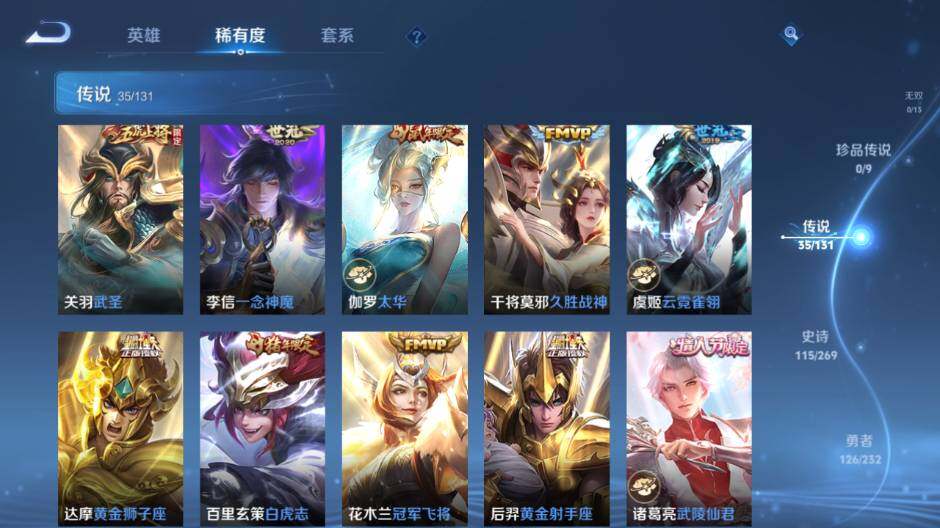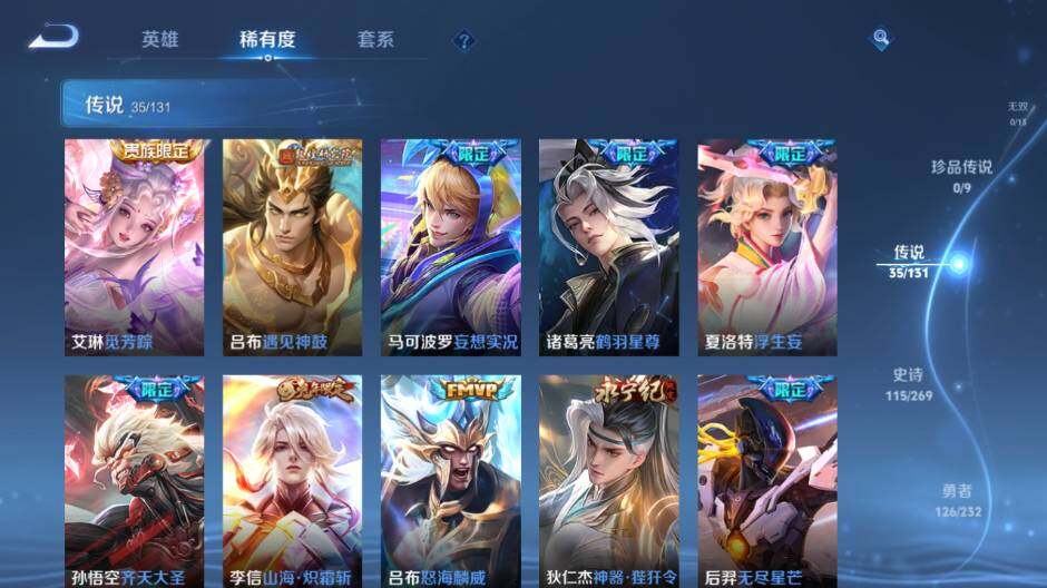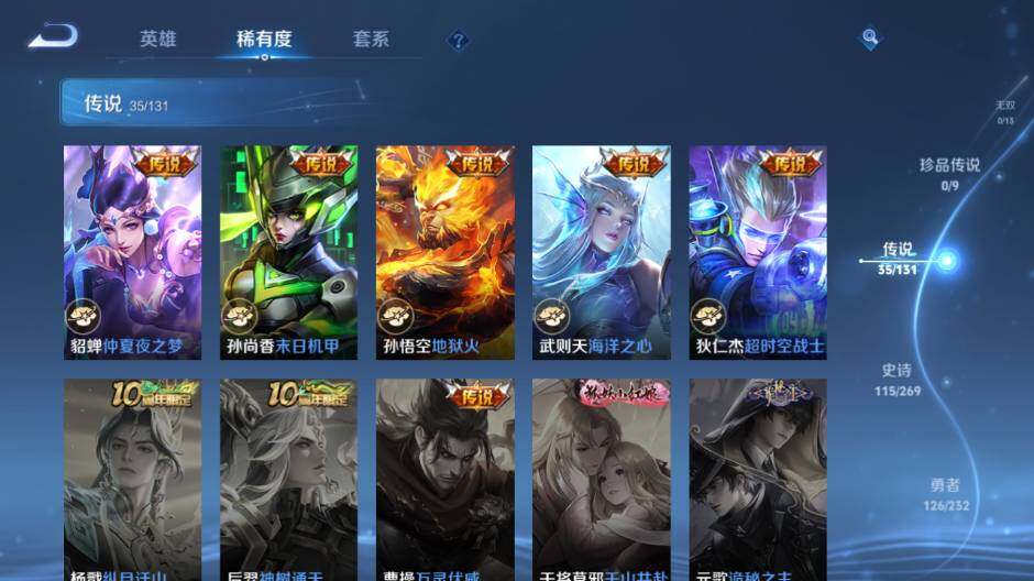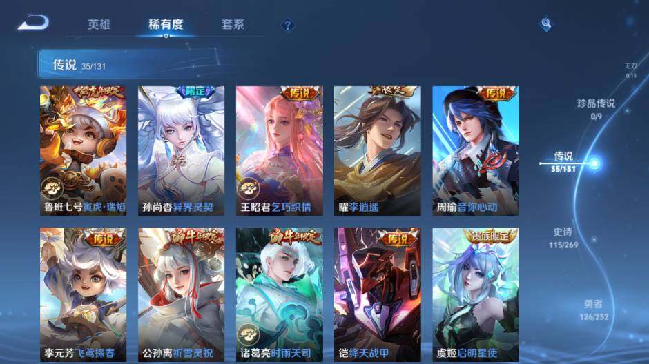 【传说皮肤】:艾琳觅芳踪,吕布遇见神鼓,马可波罗妄想实况,诸葛亮鹤羽星尊,夏洛特浮生妄,孙悟空齐天大圣,李信山海炽霜斩,吕布怒海麟威,狄仁杰神器狴犴令,后羿无尽星芒,鲁班七号寅虎瑞焰,孙尚香异界灵契,王昭君乞巧织情,曜李逍遥 ,周瑜音你心动,李元芳飞鸢探春,公孙离祈雪灵祝,诸葛亮时雨天司,铠绛天战甲,虞姬启明星使,关羽武圣,李信一念神魔,伽罗太华,干将莫邪久胜战神,虞姬云霓雀翎,达摩黄金狮子座,百里玄策白虎志,花木兰冠军飞将,后羿黄金射手座,诸葛亮武陵仙君,貂蝉仲夏夜之梦,孙尚香末日机甲,孙悟空地狱火,武则天海洋之心,狄仁杰超时空战士