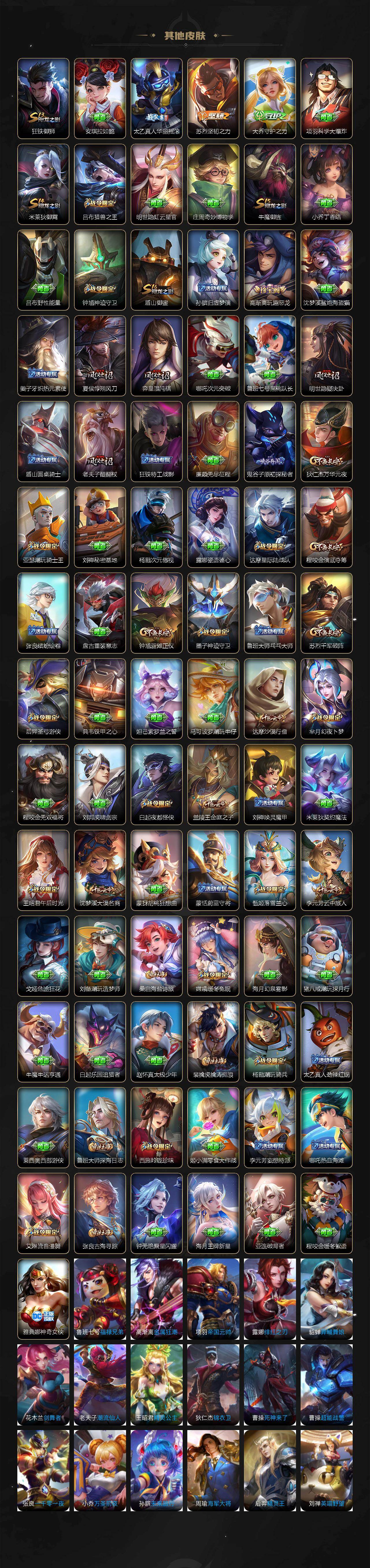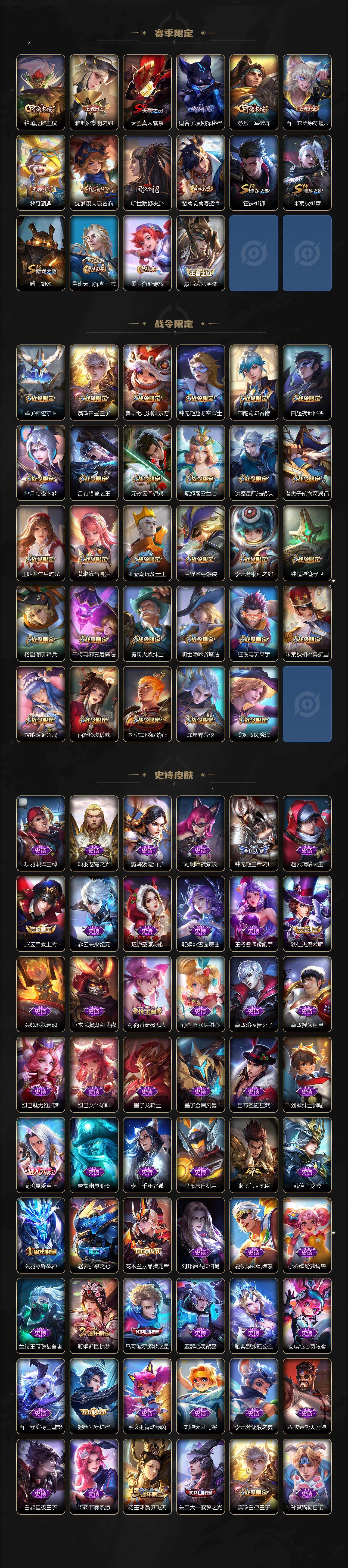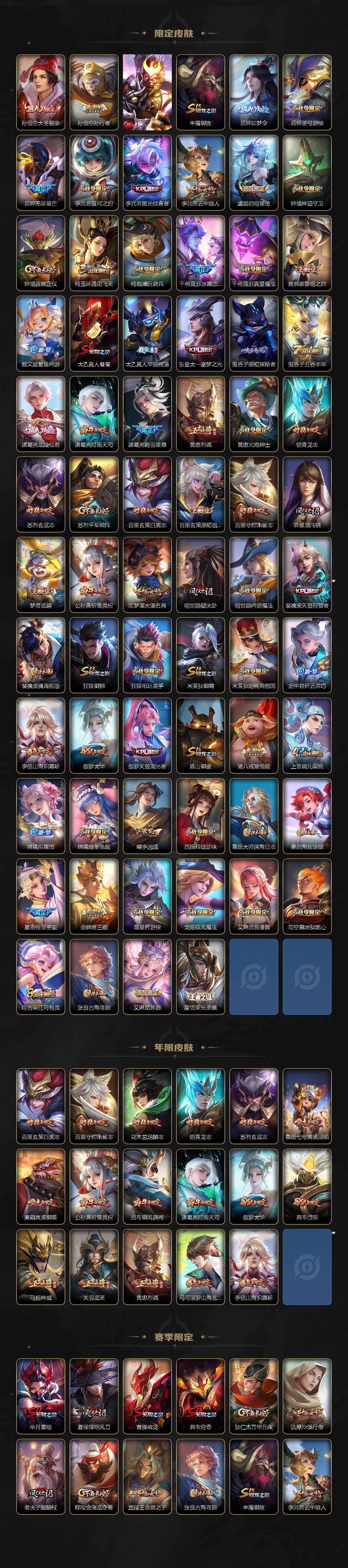 【限定皮肤】:狄仁杰阴阳师,廉颇寅虎御盾,赵云皇家上将,赵云引擎之心,墨子神迹守卫,妲己时之彼端,嬴政白昼王子,孙尚香蔷薇恋人,孙尚香异界灵契,鲁班七号狮舞东方,鲁班七号寅虎瑞焰,庄周高山流水,高渐离玩趣恶龙,钟无艳王者之锤,钟无艳超时空战士,孙膑天狼运算者,扁鹊奇幻香踪,白起夜都怪侠,芈月重明,芈月白晶晶,芈月幻夜卜梦,吕布猎兽之王,吕布御风骁将,吕布遇见神鼓,周瑜真爱至上,元歌云间偶戏,夏侯惇朔风刀,夏侯惇匿光决锋者,甄姬女儿国国王,甄姬游园惊梦,甄姬落雪兰心,曹操烛龙,典韦穷奇,典韦岱宗,马可波罗逐梦之星,马可波罗山海玄木吟,马可波罗妄想实况,狄仁杰魔术师,狄仁杰万华元夜,狄仁杰神器狴犴令,达摩星际陆战队,达摩沙漠行僧,项羽海滩派对,老夫子醍醐杖,老夫子航海奇遇记,关羽冰锋战神,关羽武圣,关羽百相守梦,程咬金演武夺筹,露娜一生所爱,王昭君午后时光,兰陵王金庭之子,花木兰瑞麟志,亚瑟潮玩骑士王,孙悟空大圣娶亲,孙悟空孙行者,孙悟空齐天大圣,牛魔御旌,后羿如梦令,后羿圣弓游侠,后羿无尽星芒,李元芳银河之约,李元芳匿光侦查者,李元芳云中旅人,虞姬启明星使,钟馗神迹守卫,钟馗驱傩正仪,杨玉环遇见飞天,杨戬潮玩骑兵,干将莫邪冰霜恋舞曲,干将莫邪真爱魔法,雅典娜黎明之约,蔡文姬繁星吟游,太乙真人饕餮,太乙真人华丽摇滚,东皇太一逐梦之光,鬼谷子原初探秘者,鬼谷子五谷丰年,诸葛亮武陵仙君,诸葛亮时雨天司,诸葛亮鹤羽星尊,黄忠烈魂,黄忠火炮