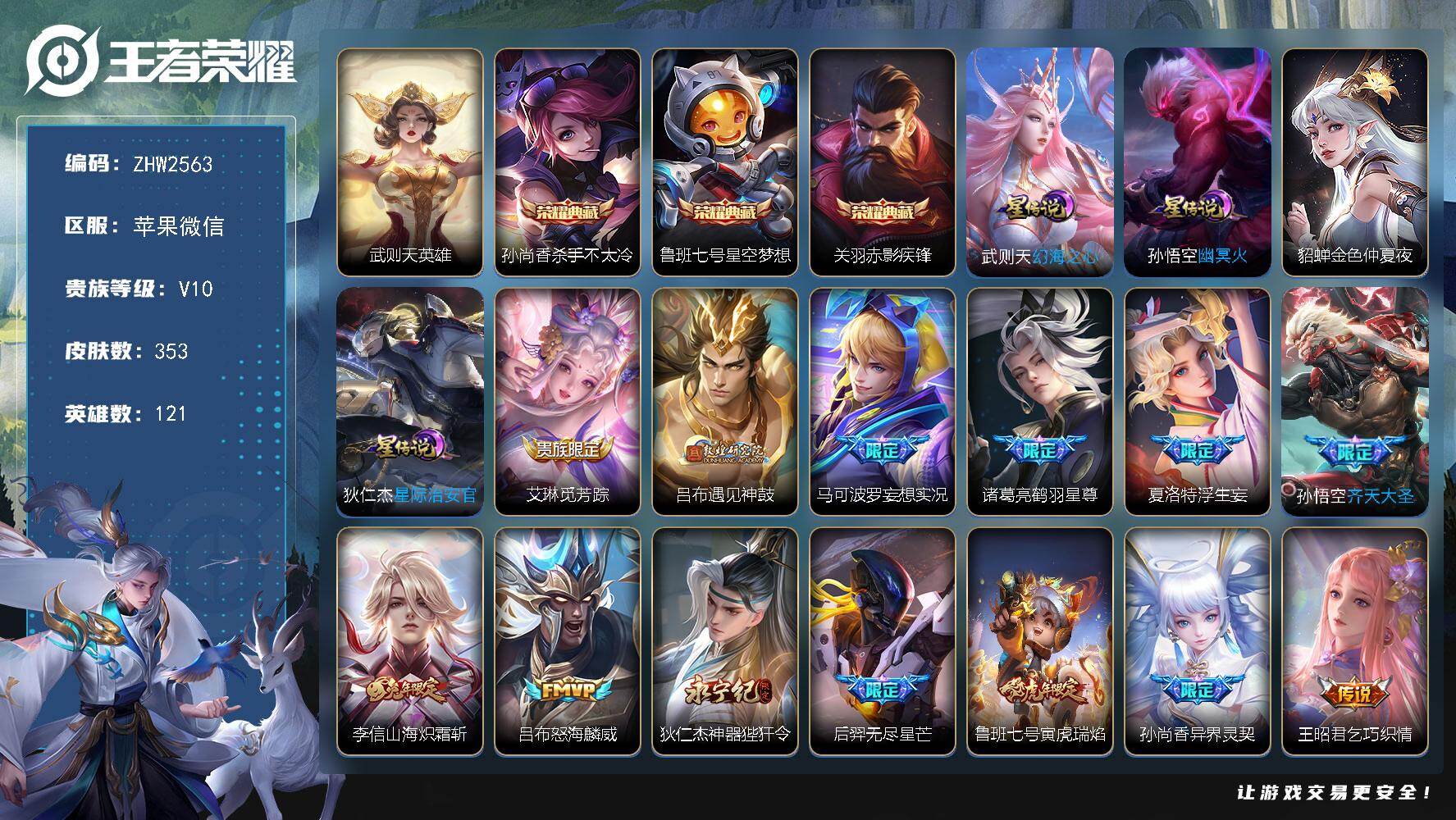 [15633741]苹果WX-V10-荣耀黄金IV段位-121英雄-353皮肤-4典藏-35传说-114史诗-4星传 【英雄全皮】:李信全皮,金蝉全皮 【荣耀典藏】:武则天英雄,孙尚香杀手不太冷,鲁班七号星空梦想,关羽赤影疾锋 【传说皮肤】:艾琳觅芳踪,吕布遇见神鼓,马可波罗妄想实况,诸葛亮鹤羽星尊,夏洛特浮生妄,孙悟空齐天大圣,李信山海炽霜斩,吕布怒海麟威,狄仁杰神器狴犴令,后羿无尽星芒,鲁班七号寅虎瑞焰,孙尚香异界灵契,王昭君乞巧织情,曜李逍遥 ,周瑜音你心动,李元芳飞鸢探春,公孙离祈雪灵祝,诸葛亮时雨天司,铠绛天战甲,虞姬启明星使,关羽武圣,李信一念神魔,伽罗太华,干将莫邪久胜战神,虞姬云霓雀翎,达摩黄金狮子座,百里玄策白虎志,花木兰冠军飞将,后羿黄金射手座,诸葛亮武陵仙君,貂蝉仲夏夜之梦,孙尚香末日机甲,孙悟空地狱火,武则天海洋之心,狄仁杰超时空战士 【限定皮肤】:狄仁杰阴阳师,廉颇寅虎御盾,赵云皇家上将,赵云引擎之心,墨子神迹守卫,妲己时之彼端,嬴政白昼王子,孙尚香蔷薇恋人,孙尚香异界灵契,鲁班七号狮舞东方,鲁班七号寅虎瑞焰,庄周高山流水,高渐离玩趣恶龙,钟无艳王者之锤,钟无艳超时空战士,孙膑天狼运算者,扁鹊奇幻香踪,白起夜都怪侠,芈月重明,芈月白晶晶,芈月幻夜卜梦,吕布猎兽之王,吕布御风骁将,吕布遇见神鼓,周瑜真爱至上,元歌云间偶戏,夏侯惇朔风刀,夏侯惇匿光决锋者,甄姬女儿国国王,甄姬游园惊梦,甄姬落雪兰心,曹操烛龙,典韦穷奇,典韦岱宗,马可波罗逐梦之星,马可波罗山海玄木吟,马可波罗妄想实况,狄仁杰魔术师,狄仁杰万华元夜,狄仁杰神器狴犴令,达摩星际陆战队,达摩沙漠行僧,项羽海滩派对,老夫子醍醐杖,老夫子航海奇遇记,关羽冰锋战神,关羽武圣,关羽百相守梦,程咬金演武夺筹,露娜一生所爱,王昭君午后时光,兰陵王金庭之子,花木兰瑞麟志,亚瑟潮玩骑士王,孙悟空大圣娶亲,孙悟空孙行者,孙悟空齐天大圣,牛魔御旌,后羿如梦令,后羿圣弓游侠,后羿无尽星芒,李元芳银河之约,李元芳匿光侦查者,李元芳云中旅人,虞姬启明星使,钟馗神迹守卫,钟馗驱傩正仪,杨玉环遇见飞天,杨戬潮玩骑兵,干将莫邪冰霜恋舞曲,干将莫邪真爱魔法,雅典娜黎明之约,蔡文姬繁星吟游,太乙真人饕餮,太乙真人华丽摇滚,东皇太一逐梦之光,鬼谷子原初探秘者,鬼谷子五谷丰年,诸葛亮武陵仙君,诸葛亮时雨天司,诸葛亮鹤羽星尊,黄忠烈魂,黄忠火炮