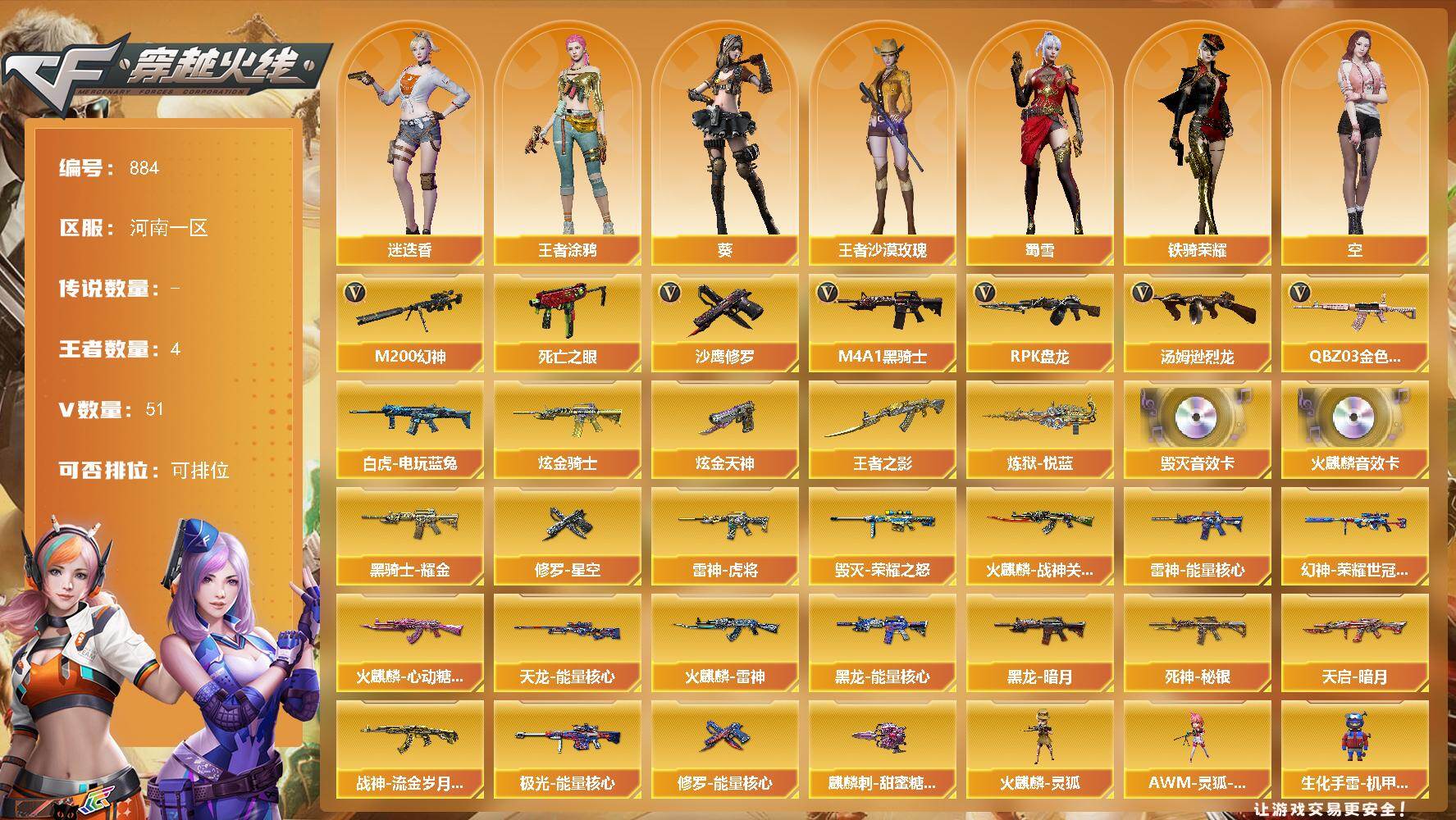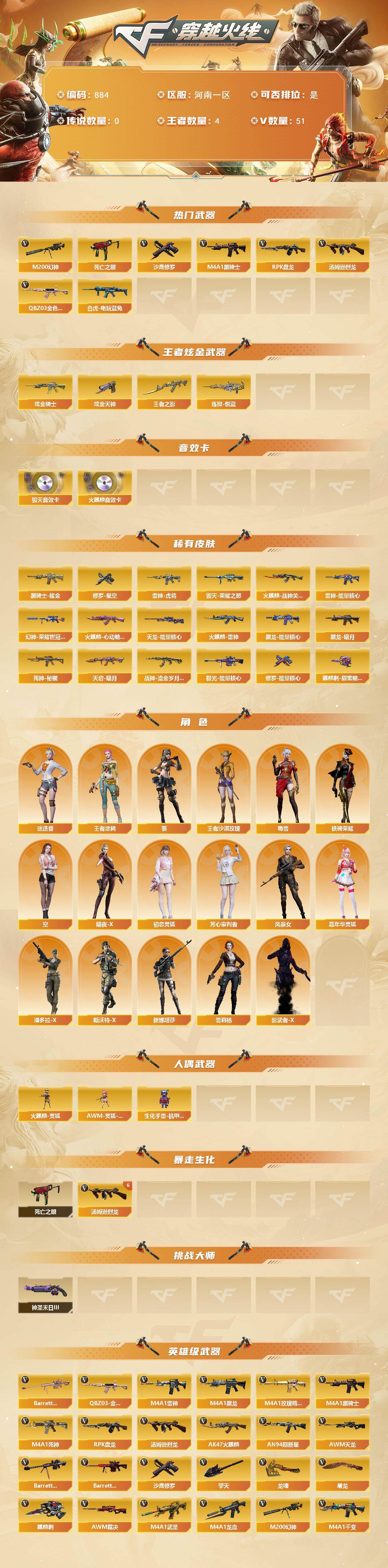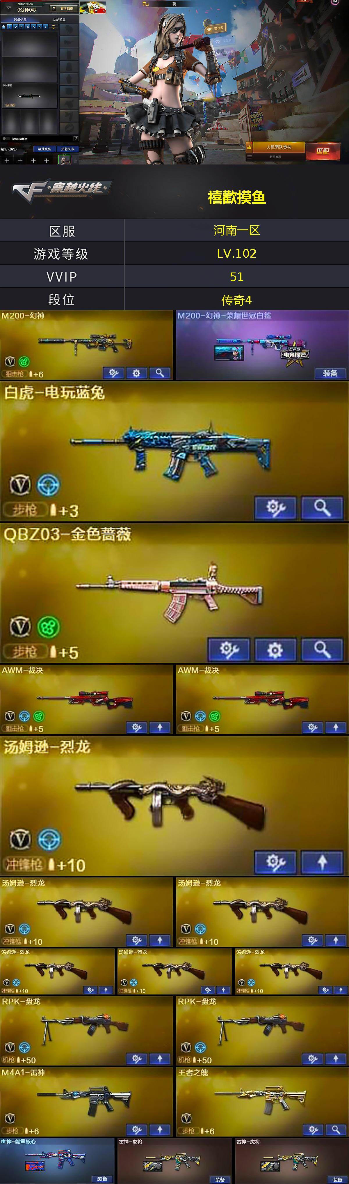 [15634629]河南一区-51V-4王者-2炫金 【热门武器】:QBZ03-金色蔷薇,M200-幻神,死亡之眼,白虎-电玩蓝兔,M4A1-黑骑士,汤姆逊-烈龙*6,RPK-盘龙*2,沙鹰-修罗*2 【王者炫金武器】:王者之影,炼狱-悦蓝,炫金骑士,炫金天神 【音效卡】:AK47-火麒麟音效卡,Barrett-毁灭音效卡 【皮肤】:M200-幻神-荣耀世冠白鲨,雷神-能量核心,雷神-虎将*2,火麒麟-雷神,火麒麟-战神关羽,火麒麟-心动糖果,毁灭-荣耀之怒,黑龙-能量核心,黑龙-暗月,黑骑士耀金皮肤,死神-秘银,天启-暗月*2,战神-流金岁月皮肤,天龙-能量核心,极光-能量核心,修罗-能量核心,修罗-星空,麒麟刺-甜蜜糖果 皮肤 【角色】:葵,迷迭香,王者涂鸦,王者沙漠玫瑰,空,暗夜-X,初恋灵狐,芳心审判者,风暴女,嘉年华灵狐,潘多拉-X,斯沃特-X,蜀雪,铁骑荣耀,新娜塔莎,雪莉杨,影武者-X 【人偶武器】:火麒麟-灵狐,AWM-灵狐-15周年嘉年华,生化手雷-机甲核心 【暴走生化】:死亡之眼 【挑战大师】:神圣爆裂者-末日III 【英雄级武器】:M4A1-千变,AK47-火麒麟*2,M4A1-黑龙,M4A1-雷神,M4A1-黑骑士,M4A1-死神,AN94-超新星,M4A1-武圣,M4A1-龙血*2,无影-神兵利器,M4A1-玫瑰精灵,QBZ03-金色蔷薇,王者之魄-觉醒版,黑骑士-海王,白虎-电玩蓝兔,AWM-天龙*3,Barrett-毁灭*3,Barrett-极光,AWM-裁决*2,M200-幻神,Barrett-金色蔷薇*2,王者之力-觉醒版,RPK-盘龙*2,汤姆逊-烈龙*6,沙鹰-修罗*2,屠龙*6,龙啸,擎天*2,麒麟刺,高爆手雷-竞技荣光 【道具】:KZ战队炫彩背包,超级背包,救世主-黑桃战神,绿色巨人,灵魂忍者,迷雾幽灵,夺命之镰,防化服*2,枪王排位29赛季金色流光,电玩兔兔表情,防弹头盔*2,防弹衣*2,C4工具钳*2,手雷包*2 【特殊枪械】:1黑骑士,6烈龙,2盘龙