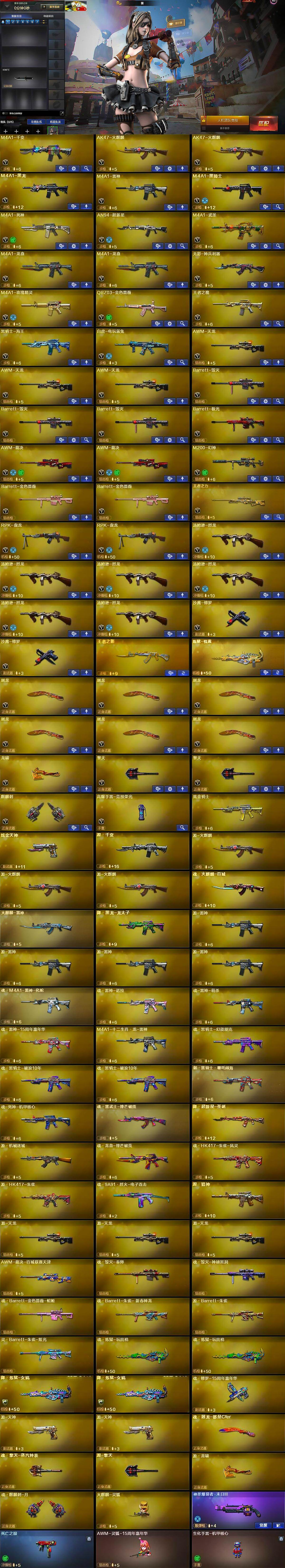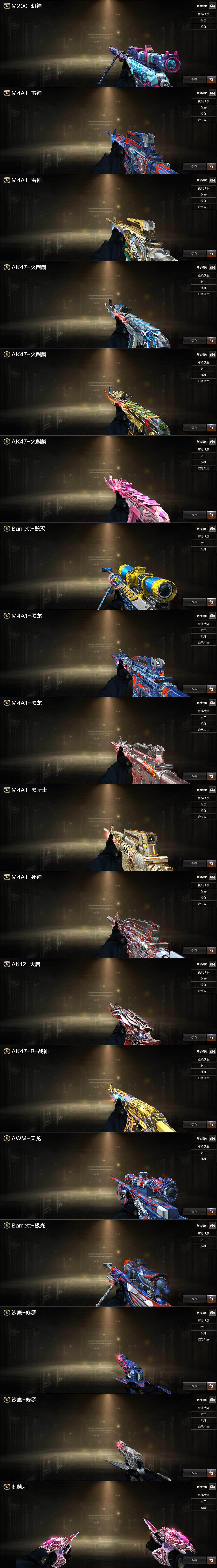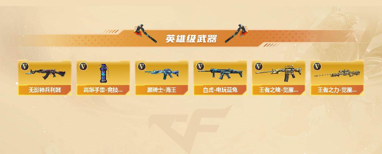 【英雄级武器】:M4A1-千变,AK47-火麒麟*2,M4A1-黑龙,M4A1-雷神,M4A1-黑骑士,M4A1-死神,AN94-超新星,M4A1-武圣,M4A1-龙血*2,无影-神兵利器,M4A1-玫瑰精灵,QBZ03-金色蔷薇,王者之魄-觉醒版,黑骑士-海王,白虎-电玩蓝兔,AWM-天龙*3,Barrett-毁灭*3,Barrett-极光,AWM-裁决*2,M200-幻神,Barrett-金色蔷薇*2,王者之力-觉醒版,RPK-盘龙*2,汤姆逊-烈龙*6,沙鹰-修罗*2,屠龙*6,龙啸,擎天*2,麒麟刺,高爆手雷-竞技荣光
