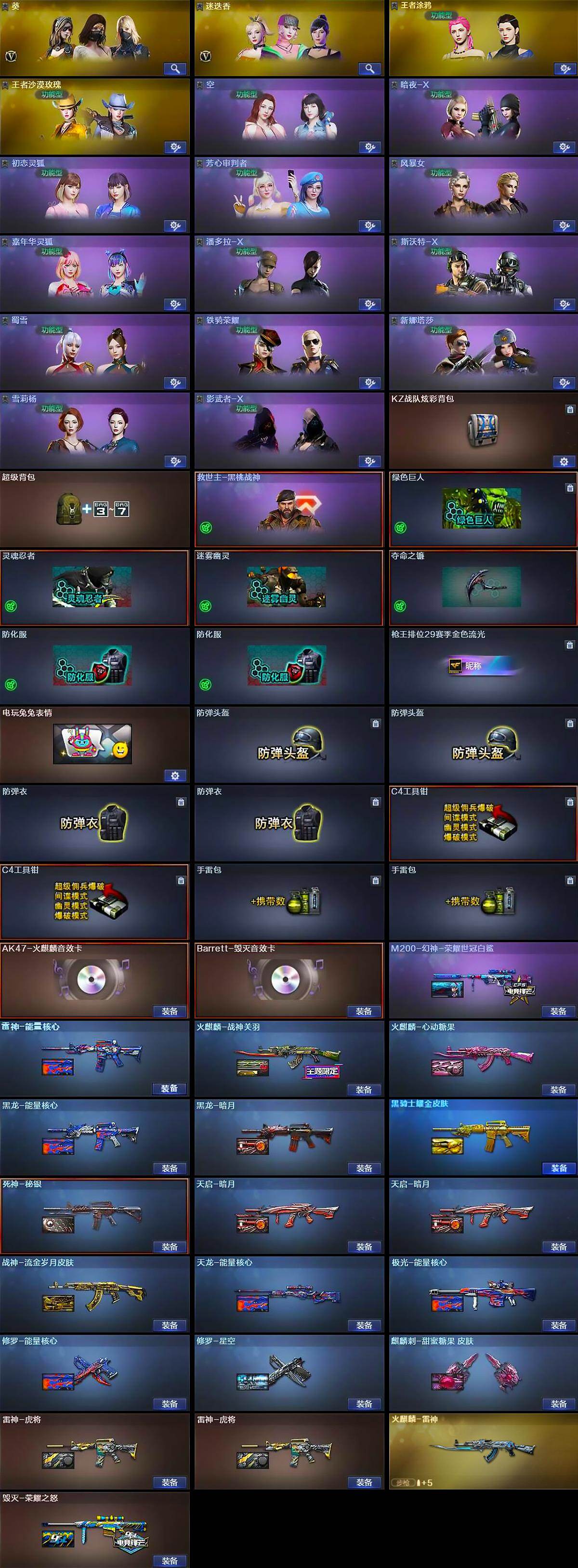 【道具】:KZ战队炫彩背包,超级背包,救世主-黑桃战神,绿色巨人,灵魂忍者,迷雾幽灵,夺命之镰,防化服*2,枪王排位29赛季金色流光,电玩兔兔表情,防弹头盔*2,防弹衣*2,C4工具钳*2,手雷包*2