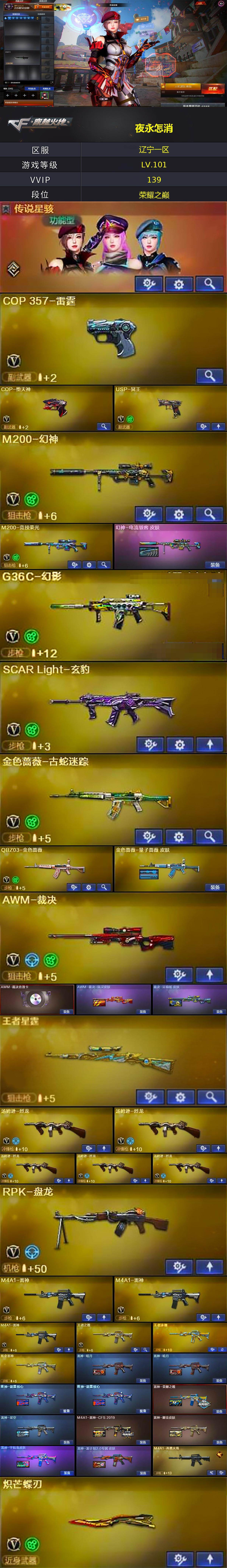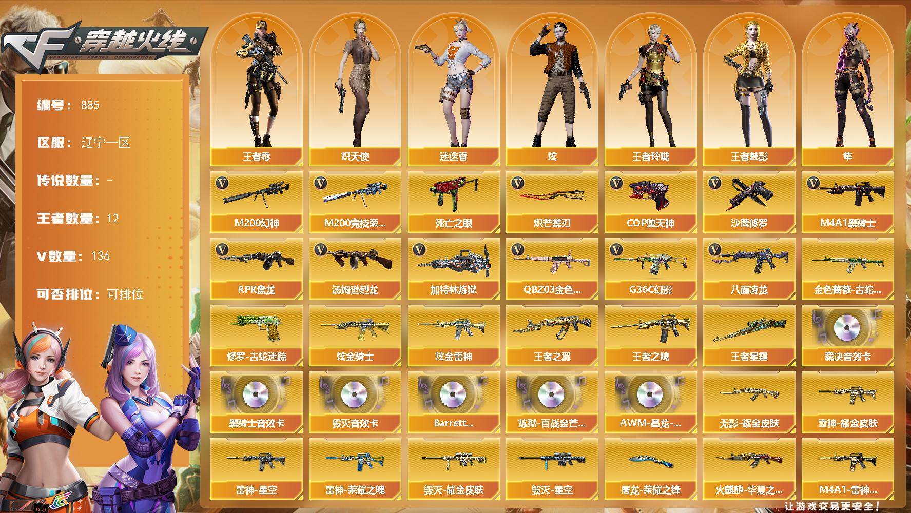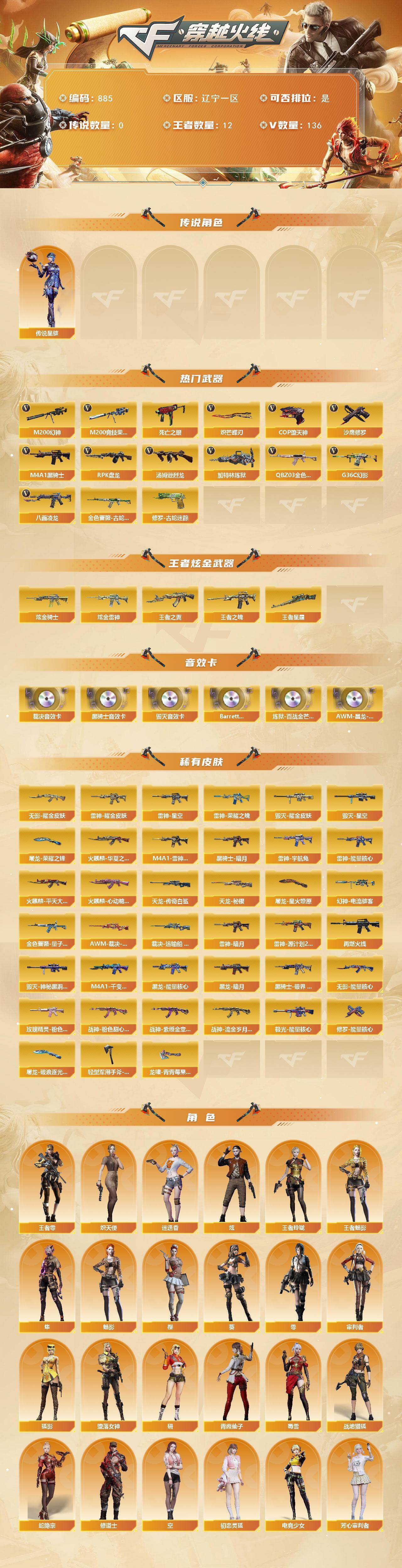 [15634793]辽宁一区-136V-12王者-2炫金 【传说角色】:传说星骇 【热门武器】:G36C-幻影,QBZ03-金色蔷薇,M200-幻神,金色蔷薇-古蛇迷踪,修罗-古蛇迷踪,M200-竞技荣光,八面凌龙,死亡之眼,M4A1-黑骑士,汤姆逊-烈龙*5,RPK-盘龙,加特林-炼狱*2,COP-堕天神,沙鹰-修罗*2,炽芒蝶刃 【王者炫金武器】:王者之翼,王者之魄,王者星霆,炫金骑士,炫金雷神 【音效卡】:M4A1-黑骑士音效卡,Barrett-毁灭音效卡,AWM-裁决音效卡,Barrett-碧霄极光音效卡,炼狱-百战金芒-庆典舞曲音效卡,AWM-昌龙-怀旧音效卡 【皮肤】:幻神-电流骇客 皮肤,金色蔷薇-量子蔷薇 皮肤,AWM-裁决-凤灵皮肤,裁决-运输船 皮肤,雷神-暗月*2,雷神-能量核心*2,雷神-荣耀之魄,雷神-星空,M4A1-雷神-CFS 2019,雷神-耀金皮肤,雷神-宇航兔皮肤,雷神-源计划2.0专属 皮肤,M4A1-再燃火线,火麒麟-华夏之心,火麒麟-平天大圣*2,火麒麟-心动糖果,毁灭耀金皮肤*2,毁灭-星空,毁灭-神秘黑洞皮肤,M4A1-千变-孔明皮肤,黑龙-能量核心,黑龙-暗月,黑骑士-暗月,黑骑士-破界 皮肤,无影-能量核心,无影耀金皮肤,玫瑰精灵-粉色浪漫 皮肤,战神-粉色甜心皮肤,战神-紫绶金章皮肤,战神-流金岁月皮肤,天龙-秘银*2,AWM-天龙-传奇白鲨,极光-能量核心,修罗-能量核心,屠龙-荣耀之锋,屠龙-星火燎原,屠龙-破浪逐光 皮肤,轻型军用手斧-再燃火线,龙啸-青青莓果 皮肤 【角色】:零,葵,樱,魅影,炫,迷迭香,隼,研,审判者,战地猎狐,王者-零,王者玲珑,王者-魅影,堕落女神,狐影,蛇隐宗,修道士,炽天使,空,初恋灵狐,电竞少女,芳心审判者,飞虎队-X,风暴女*2,嘉年华灵狐,娟娟,猎狐者-追月,灵狐-花神,灵狐者-X,灵狐者-黄金海岸,龙儿-小淘气,玫瑰花神,潘多拉-X,潘多拉-甜心教官,青霞仙子,蛇姬,斯沃特-X,蜀雪,兔囡囡,雪莉杨,樱-缤纷夏日,影武者-X 【人偶武器】:M4A1-雷神-精英刀锋,巴雷特-零-水下丽影,AWM-灵狐-15周年嘉年华*2,M37-葵,COP-旗袍,迷你深渊冰龙,迷你波特博士,夺魂,生化手雷-机甲核心*3,闪光弹-小乔 【暴走生化】:死亡之眼,超级对讲机 【挑战大师】:冰龙粉碎者-白马银枪,激光