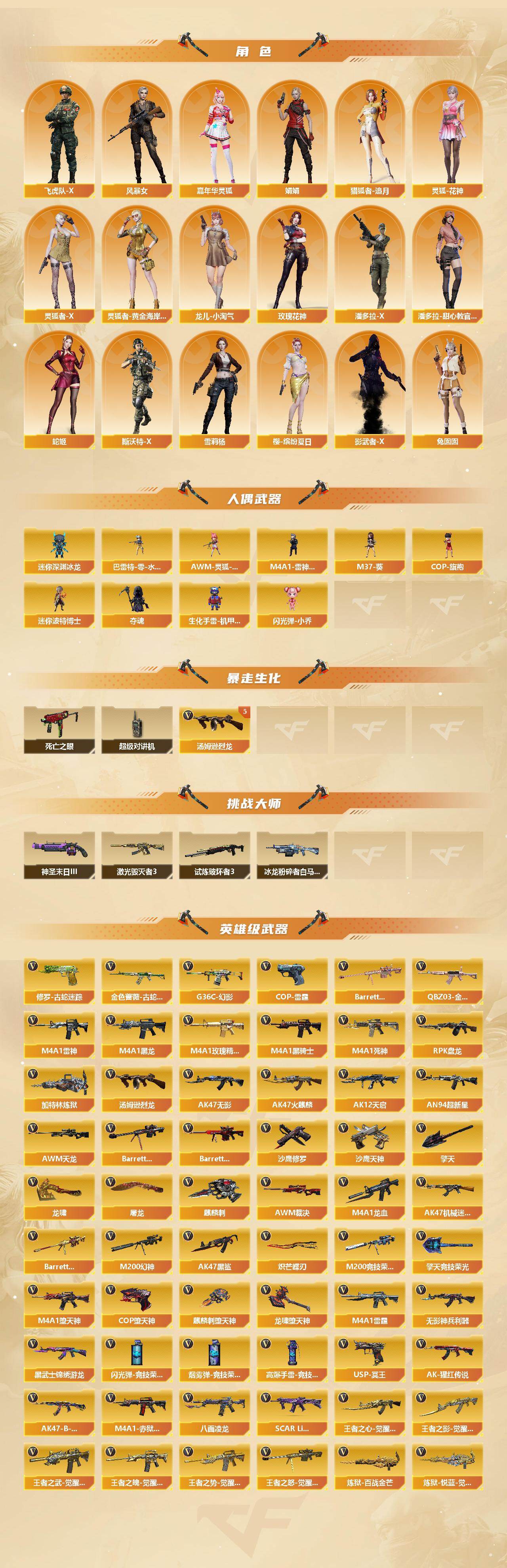 【角色】:零,葵,樱,魅影,炫,迷迭香,隼,研,审判者,战地猎狐,王者-零,王者玲珑,王者-魅影,堕落女神,狐影,蛇隐宗,修道士,炽天使,空,初恋灵狐,电竞少女,芳心审判者,飞虎队-X,风暴女*2,嘉年华灵狐,娟娟,猎狐者-追月,灵狐-花神,灵狐者-X,灵狐者-黄金海岸,龙儿-小淘气,玫瑰花神,潘多拉-X,潘多拉-甜心教官,青霞仙子,蛇姬,斯沃特-X,蜀雪,兔囡囡,雪莉杨,樱-缤纷夏日,影武者-X
