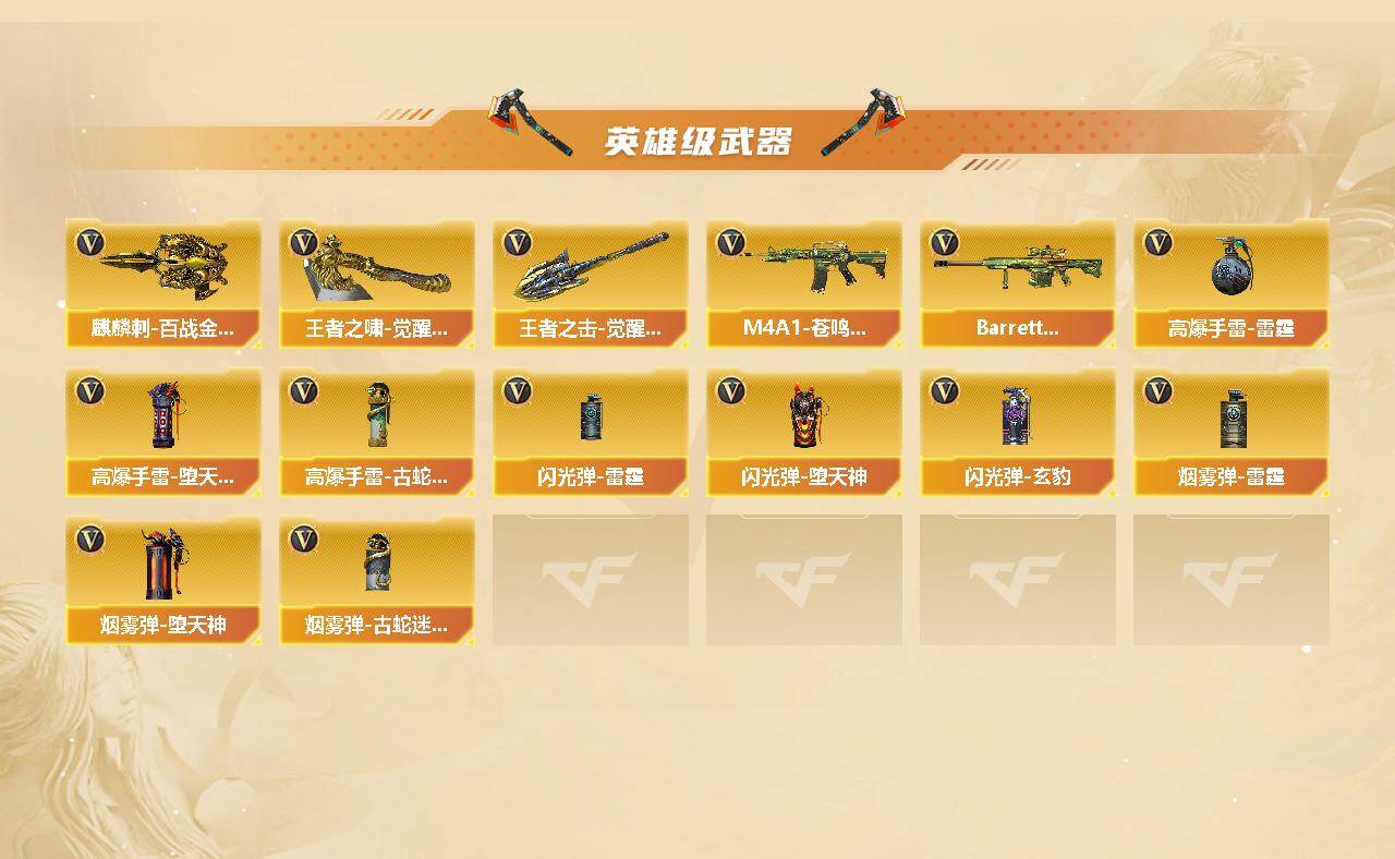 【热门武器】:G36C-幻影,QBZ03-金色蔷薇,M200-幻神,金色蔷薇-古蛇迷踪,修罗-古蛇迷踪,M200-竞技荣光,八面凌龙,死亡之眼,M4A1-黑骑士,汤姆逊-烈龙*5,RPK-盘龙,加特林-炼狱*2,COP-堕天神,沙鹰-修罗*2,炽芒蝶刃