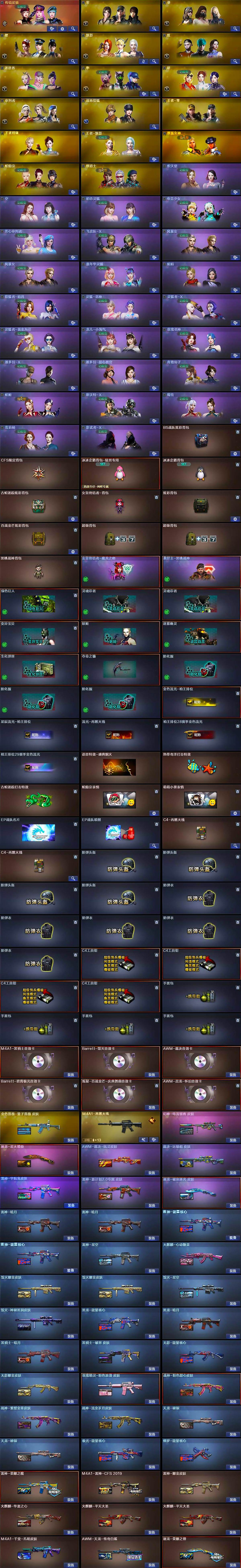 【皮肤】:幻神-电流骇客 皮肤,金色蔷薇-量子蔷薇 皮肤,AWM-裁决-凤灵皮肤,裁决-运输船 皮肤,雷神-暗月*2,雷神-能量核心*2,雷神-荣耀之魄,雷神-星空,M4A1-雷神-CFS 2019,雷神-耀金皮肤,雷神-宇航兔皮肤,雷神-源计划2.0专属 皮肤,M4A1-再燃火线,火麒麟-华夏之心,火麒麟-平天大圣*2,火麒麟-心动糖果,毁灭耀金皮肤*2,毁灭-星空,毁灭-神秘黑洞皮肤,M4A1-千变-孔明皮肤,黑龙-能量核心,黑龙-暗月,黑骑士-暗月,黑骑士-破界 皮肤,无影-能量核心,无影耀金皮肤,玫瑰精灵-粉色浪漫 皮肤,战神-粉色甜心皮肤,战神-紫绶金章皮肤,战神-流金岁月皮肤,天龙-秘银*2,AWM-天龙-传奇白鲨,极光-能量核心,修罗-能量核心,屠龙-荣耀之锋,屠龙-星火燎原,屠龙-破浪逐光 皮肤,轻型军用手斧-再燃火线,龙啸-青青莓果 皮肤