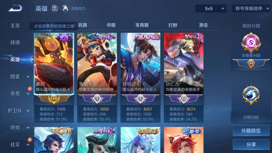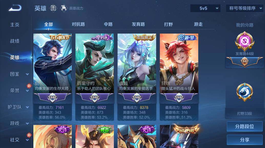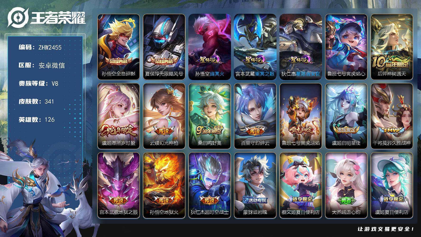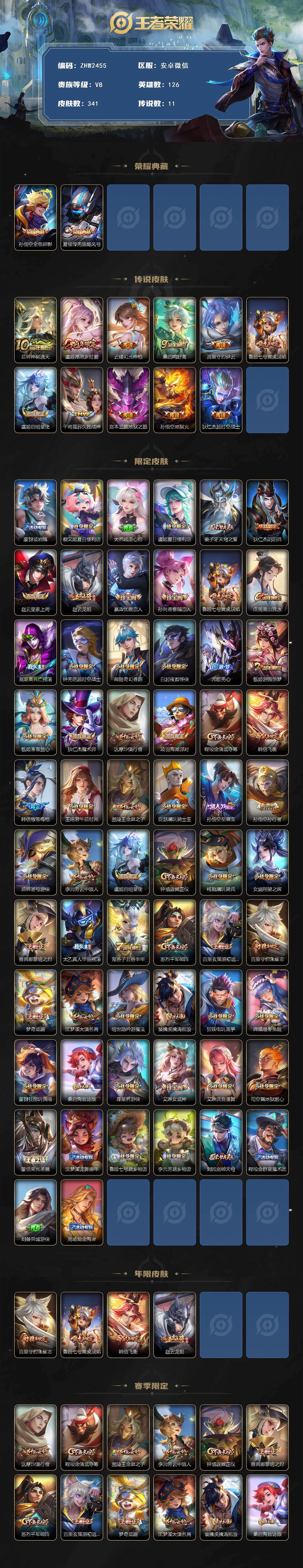 [15634919]安卓WX-V8-最强王者段位-126英雄-341皮肤-2典藏皮肤-11传说-94史诗-3星传-发育路44段