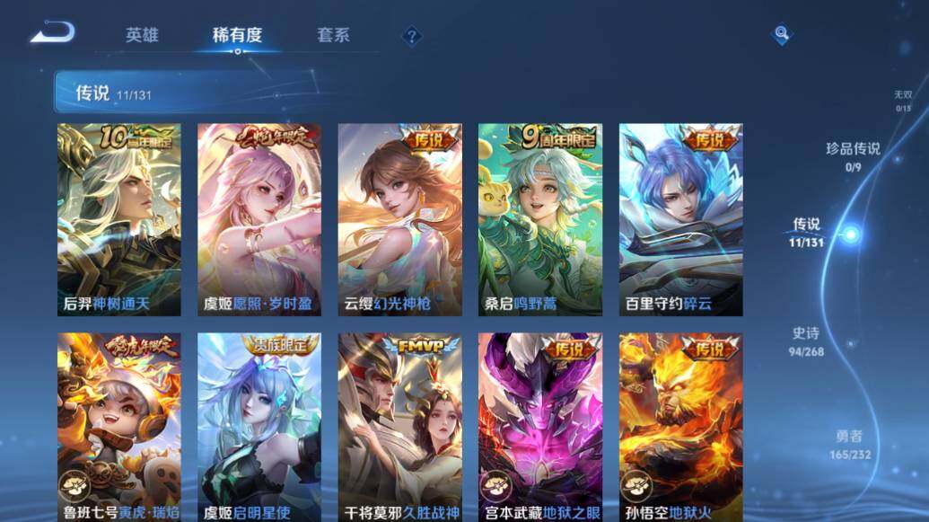【传说皮肤】:后羿神树通天,虞姬愿照岁时盈,云缨幻光神枪,桑启鸣野蒿,百里守约碎云,鲁班七号寅虎瑞焰,虞姬启明星使,干将莫邪久胜战神,宫本武藏地狱之眼,孙悟空地狱火,狄仁杰超时空战士