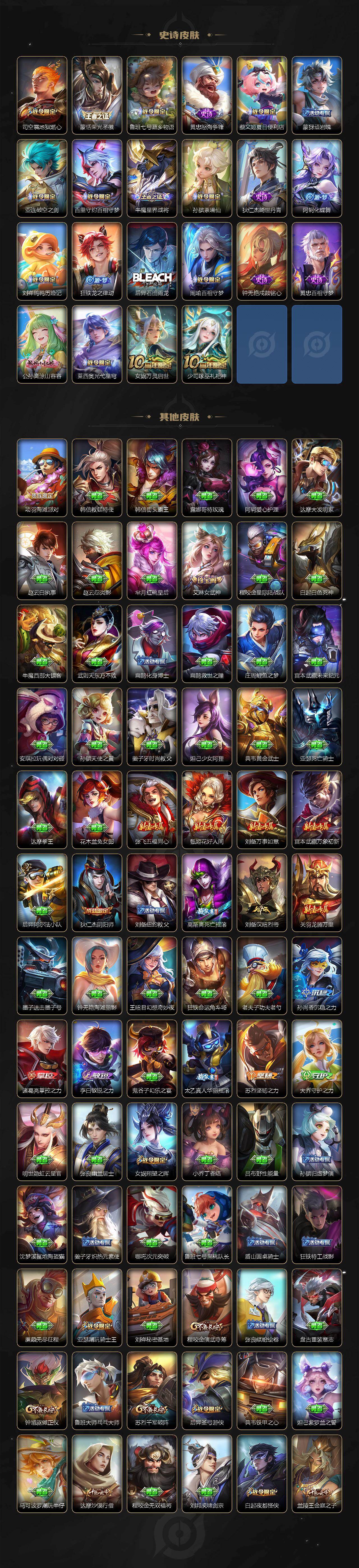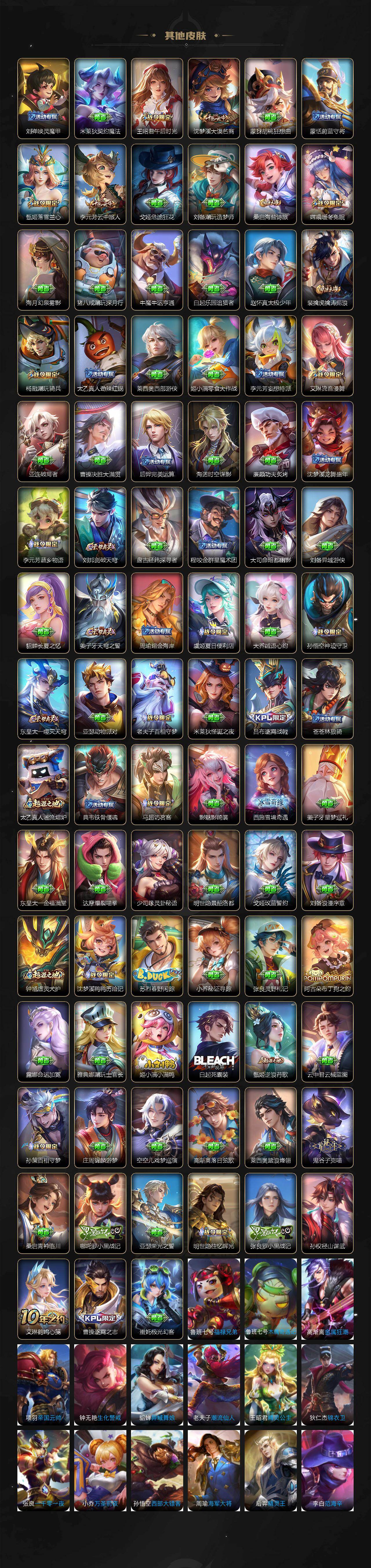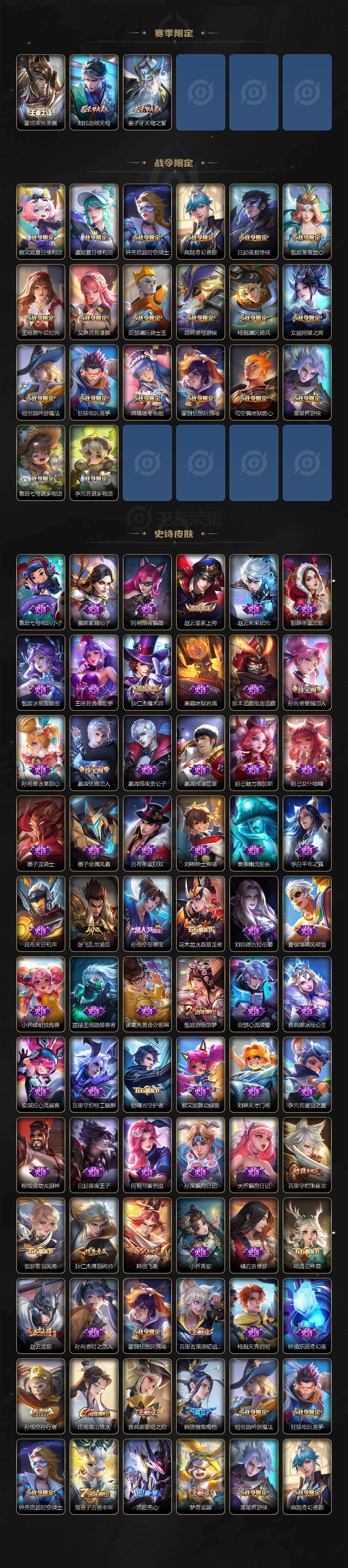 【限定皮肤】:蒙犽顽岩魄,蔡文姬夏日便利店,大乔绒语心约,虞姬夏日便利店,姜子牙天穹之誓,狄仁杰阴阳师,赵云皇家上将,赵云龙胆,嬴政优雅恋人,孙尚香蔷薇恋人,鲁班七号寅虎瑞焰,庄周高山流水,高渐离死亡摇滚,钟无艳超时空战士,扁鹊奇幻香踪,白起夜都怪侠,元歌无心,甄姬游园惊梦,甄姬落雪兰心,狄仁杰魔术师,达摩沙漠行僧,项羽海滩派对,程咬金演武夺筹,韩信飞衡,韩信傲雪梅枪,王昭君午后时光,兰陵王金庭之子,亚瑟潮玩骑士王,孙悟空至尊宝,孙悟空孙行者,后羿圣弓游侠,李元芳云中旅人,虞姬启明星使,钟馗驱傩正仪,杨戬潮玩骑兵,女娲朔望之晖,雅典娜黎明之约,太乙真人华丽摇滚,鬼谷子五谷丰年,苏烈千军破阵,百里玄策原初追逐者,百里守约朱雀志,梦奇顽趣,沈梦溪大漠名商,明世隐吟游魔法,裴擒虎擒涛扼浪,狂铁电玩高手,嫦娥暖冬兔眠,蒙犽狂想玩偶喵,桑启海盐诗旅,暃星界游侠,艾琳女武神,艾琳流音漫舞,司空震地狱燃心,蒙恬荣光圣徽,沈梦溪龙舞盛年,鲁班七号蔬乡物语,李元芳蔬乡物语,刘邦剑破天穹,程咬金群星魔术团,刘备异域游侠,周瑜熔金海岸