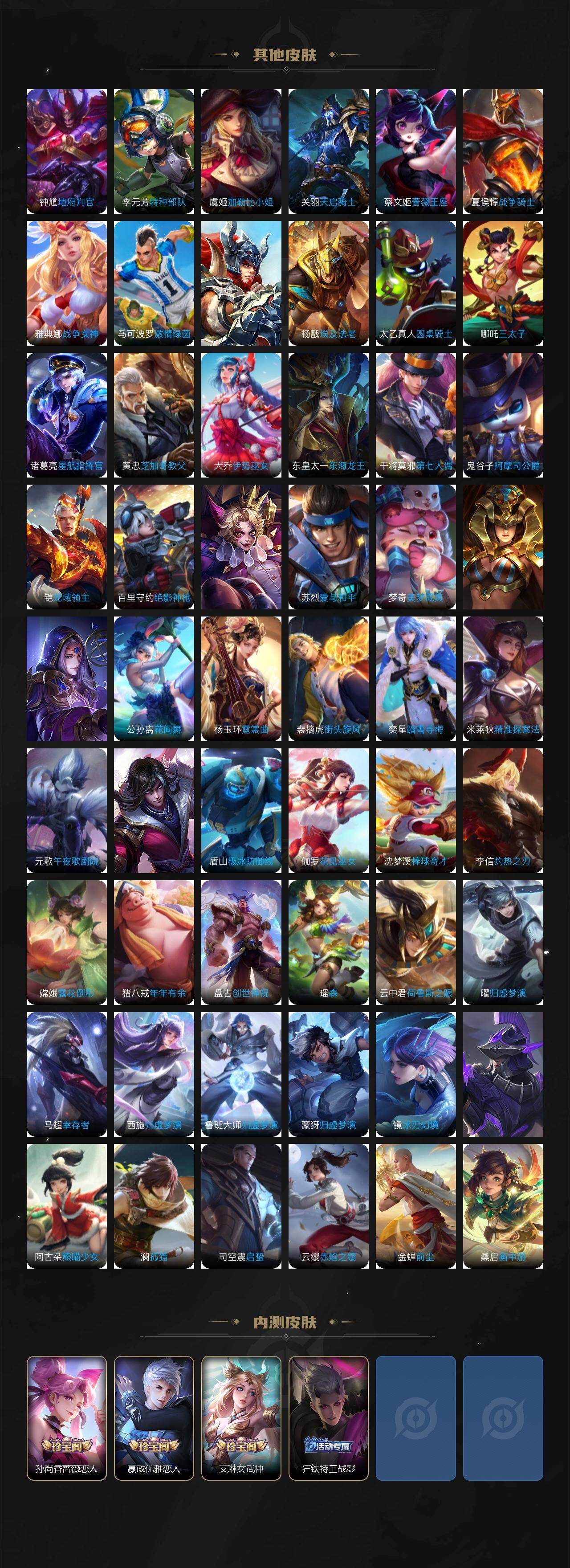 小乔青蛇,瑶遇见神鹿,伽罗箭羽风息,李元芳逐浪之夏,大乔猫狗日记,孙策猫狗日记,阿轲节奏热浪,露娜紫霞仙子,诸葛亮黄金分割率,王昭君偶像歌手,孙尚香时之恋人,阿轲暗夜猫娘,雅典娜冰冠公主,吕布末日机甲,鲁班七号电玩小子,橘右京修罗,墨子龙骑士,嬴政摇滚巨星,刘禅绅士熊喵,刘禅天才门将,白起星夜王子,安琪拉心灵骇客,程咬金功夫厨神,刘邦德古拉伯爵,兰陵王暗隐猎兽者,曹操幽灵船长,宫本武藏鬼剑武藏,亚瑟心灵战警,钟馗乐园奇幻夜,杨戬天秀·启明,蔡文姬舞动绿茵,廉颇地狱岩魂,小乔缤纷独角兽,夏侯惇乘风破浪,花木兰水晶猎龙者,铠曙光守护者,墨子金属风暴,百里玄策原初追逐者,吕布圣诞狂欢,貂蝉圣诞恋歌,百里守约特工魅影,嬴政暗夜贵公子,雅典娜黎明之约,李白千年之狐,狄仁杰绮世丹青