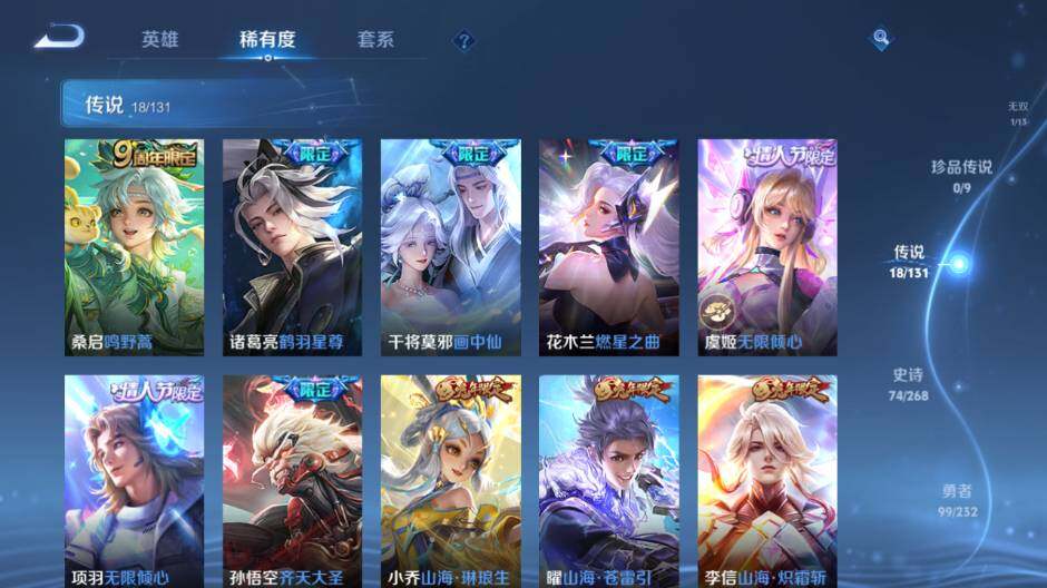 【传说皮肤】:桑启鸣野蒿,诸葛亮鹤羽星尊,干将莫邪画中仙,花木兰燃星之曲,虞姬无限倾心,项羽无限倾心,孙悟空齐天大圣,小乔山海琳琅生,曜山海苍雷引,李信山海炽霜斩,百里守约碎云,镜炽阳神光,虞姬启明星使,孙悟空零号赤焰,刘备时之恋人,李白凤求凰,吕布天魔缭乱,狄仁杰超时空战士