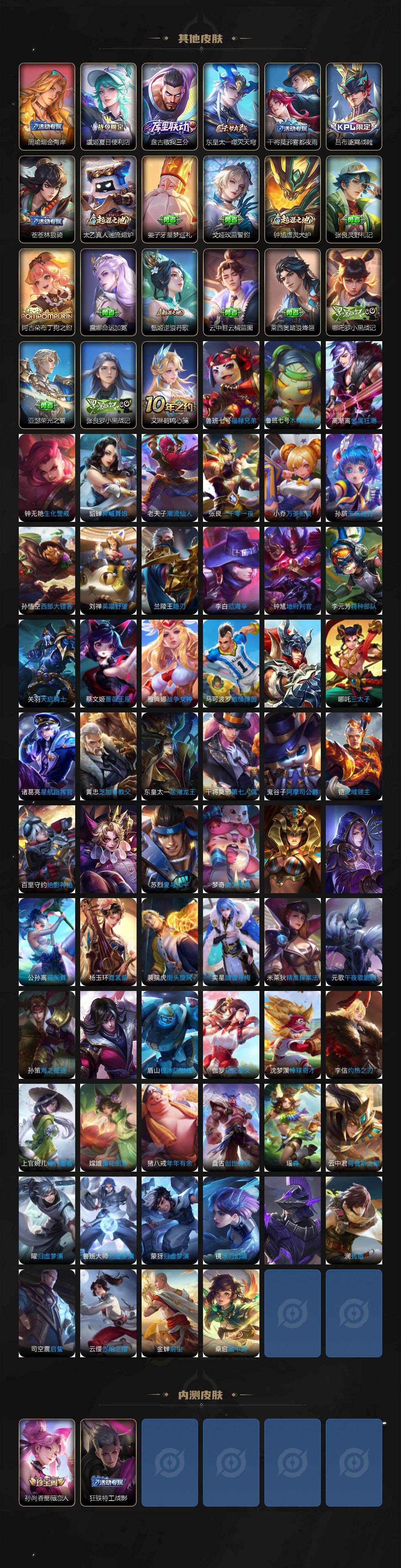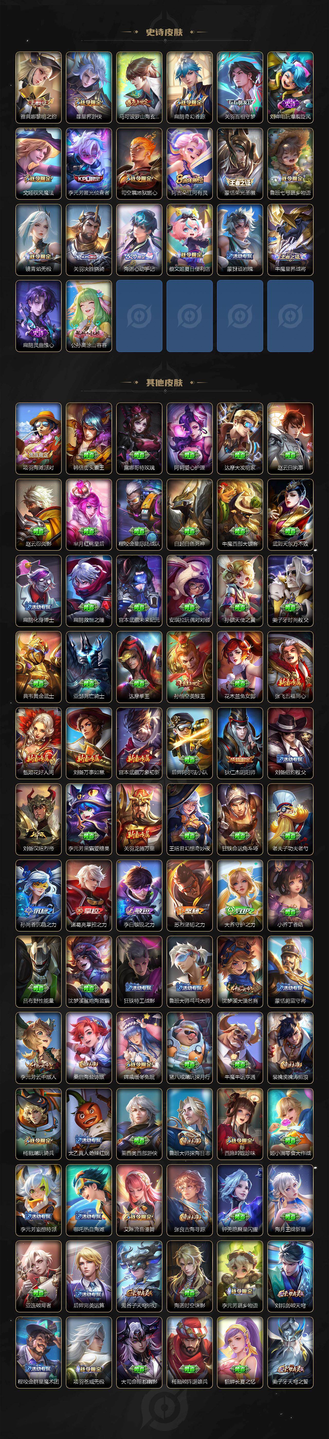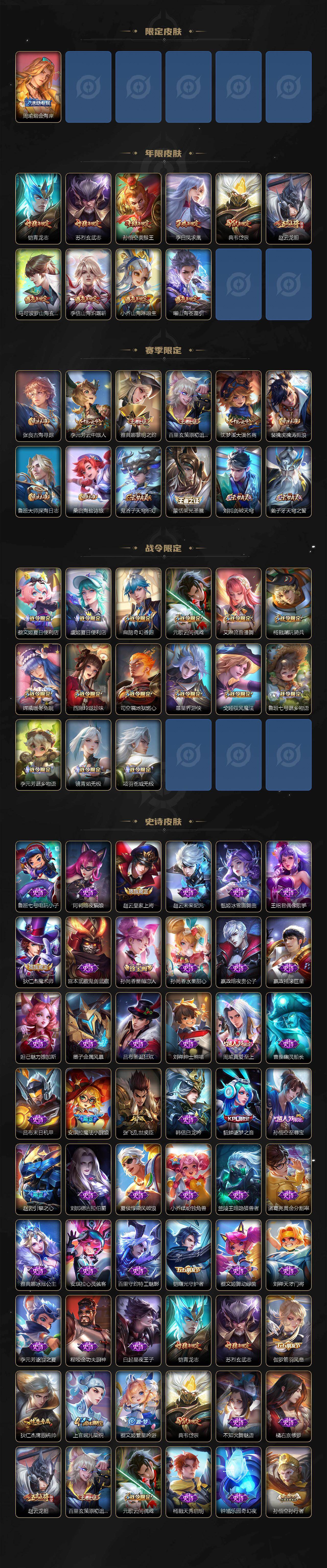 【限定皮肤】:蒙犽顽岩魄,蔡文姬夏日便利店,虞姬夏日便利店,姜子牙天穹之誓,杨戬破阵退雄兵,狄仁杰阴阳师,小乔山海琳琅生,赵云皇家上将,赵云引擎之心,赵云龙胆,孙尚香蔷薇恋人,扁鹊奇幻香踪,吕布天魔缭乱,周瑜真爱至上,元歌云间偶戏,典韦岱宗,马可波罗山海玄木吟,狄仁杰魔术师,项羽海滩派对,项羽无限倾心,关羽百相守梦,貂蝉逐梦之音,安琪拉魔法小厨娘,花木兰燃星之曲,孙悟空美猴王,孙悟空至尊宝,孙悟空零号赤焰,孙悟空孙行者,孙悟空齐天大圣,李元芳匿光侦查者,李元芳云中旅人,虞姬启明星使,虞姬无限倾心,杨戬潮玩骑兵,干将莫邪画中仙,雅典娜黎明之约,蔡文姬繁星吟游,诸葛亮鹤羽星尊,铠青龙志,苏烈玄武志,百里玄策原初追逐者,沈梦溪大漠名商,裴擒虎擒涛扼浪,李信山海炽霜斩,上官婉儿梁祝,嫦娥暖冬兔眠,曜山海苍雷引,西施玲珑珍味,鲁班大师探海日志,桑启海盐诗旅,暃星界游侠,戈娅驭风魔法,艾琳流音漫舞,司空震地狱燃心,阿古朵江河有灵,张良古海寻踪,蒙恬荣光圣徽,鬼谷子天穹祈灯,鲁班七号蔬乡物语,李元芳蔬乡物语,刘邦剑破天穹,程咬金群星魔术团,关羽决胜骁骑,镜青焰无极,项羽苍威无极,海诺心动手记,周瑜熔金海岸