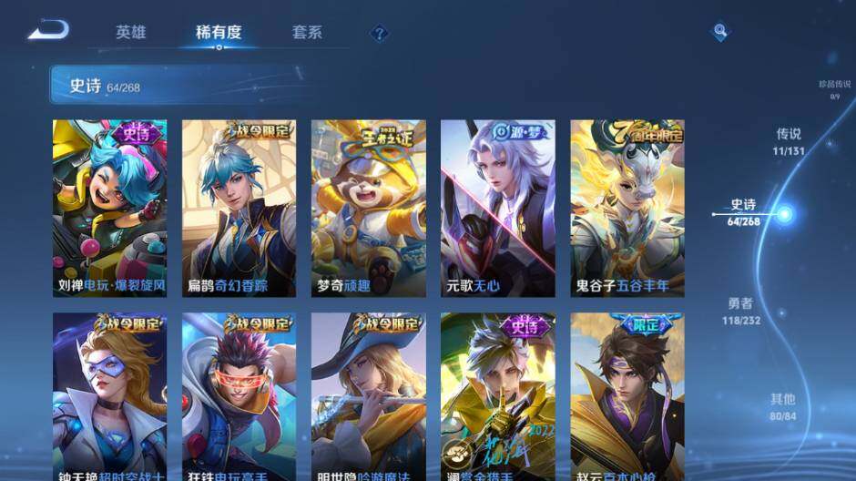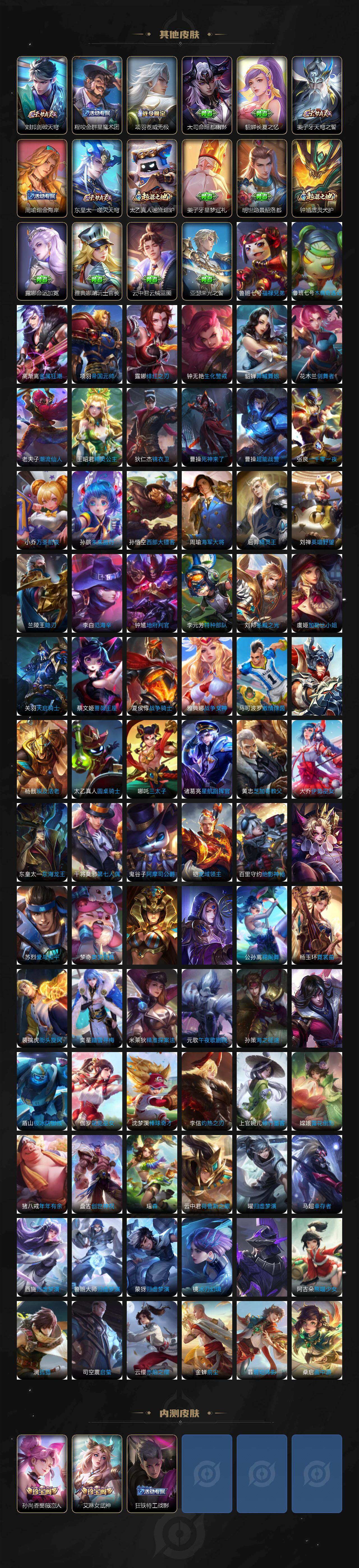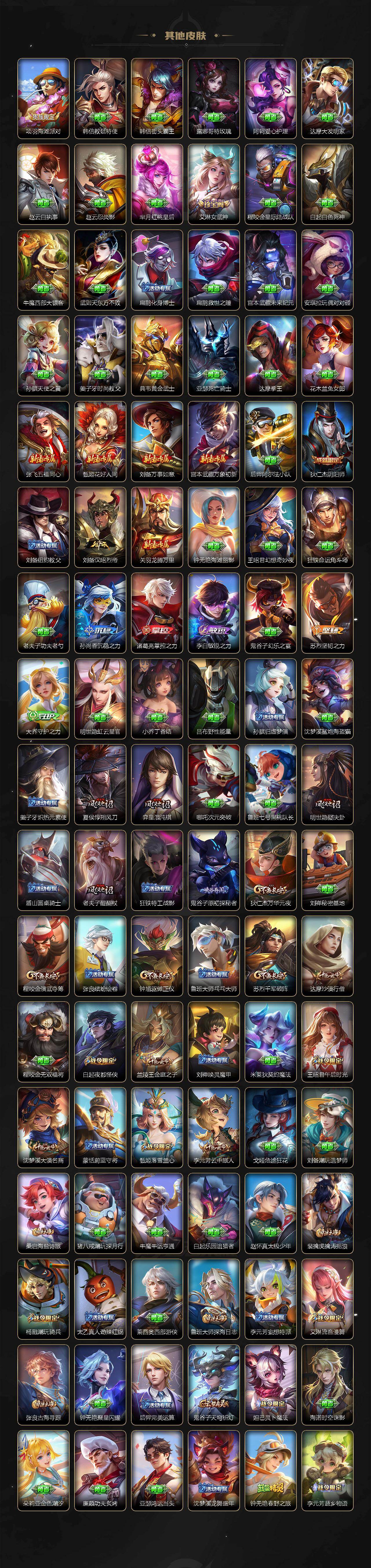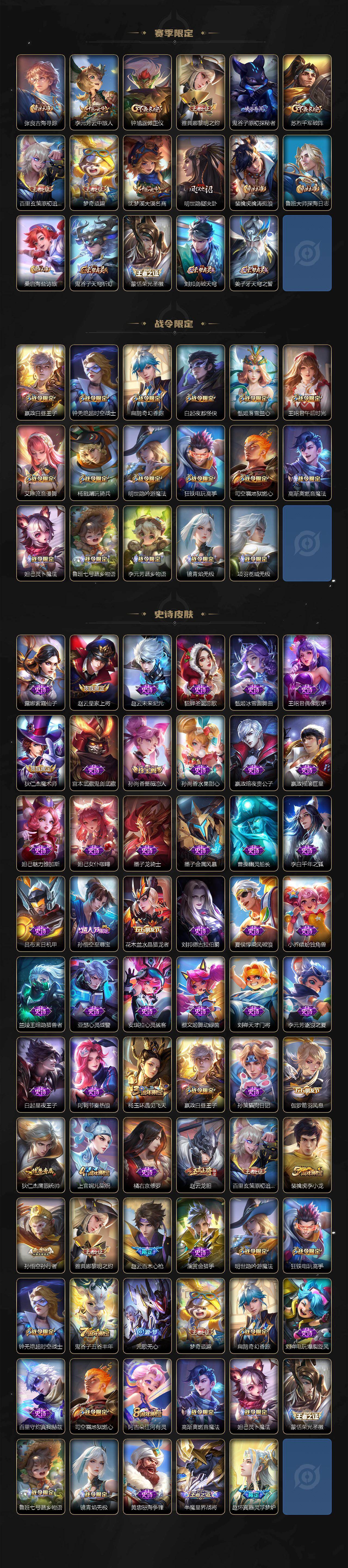 【限定皮肤】:姜子牙天穹之誓,狄仁杰阴阳师,赵云皇家上将,赵云龙胆,赵云百木心枪,嬴政白昼王子,孙尚香蔷薇恋人,钟无艳超时空战士,扁鹊奇幻香踪,白起夜都怪侠,元歌无心,夏侯惇朔风刀,甄姬落雪兰心,狄仁杰魔术师,狄仁杰万华元夜,达摩沙漠行僧,项羽海滩派对,老夫子醍醐杖,程咬金演武夺筹,王昭君午后时光,兰陵王金庭之子,孙悟空至尊宝,孙悟空孙行者,孙悟空齐天大圣,李元芳云中旅人,虞姬启明星使,钟馗驱傩正仪,杨玉环遇见飞天,杨戬潮玩骑兵,雅典娜黎明之约,鬼谷子原初探秘者,鬼谷子五谷丰年,苏烈千军破阵,百里玄策原初追逐者,弈星混沌棋,梦奇顽趣,沈梦溪大漠名商,明世隐疑决卦,明世隐吟游魔法,裴擒虎李小龙,裴擒虎擒涛扼浪,狂铁电玩高手,上官婉儿梁祝,鲁班大师探海日志,桑启海盐诗旅,艾琳女武神,艾琳流音漫舞,司空震地狱燃心,阿古朵江河有灵,张良古海寻踪,蒙恬荣光圣徽,高渐离燃音魔法,妲己灵卜魔法,鬼谷子天穹祈灯,沈梦溪龙舞盛年,鲁班七号蔬乡物语,李元芳蔬乡物语,刘邦剑破天穹,程咬金群星魔术团,镜青焰无极,项羽苍威无极,周瑜熔金海岸