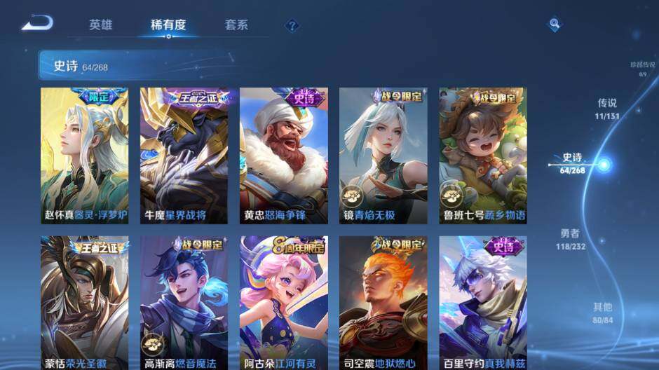 - [12224964]V10 5典藏 64传说 125英雄 526皮肤 可修改实名 优质装备:鸣剑·曳影,银白咏叹调(倪克斯侍卫),幻阙歌(貂蝉典藏),神鉴启示录,拾光映像(瑶典藏),黄金狮子座,黄金射手座,冠军飞将,绛天战甲(鸡嘴战神),猫影幻舞,久胜战神,炽阳神光,一念神魔,仲夏夜之梦(大飞蛾),音你心动-小乔,地狱之眼,胖达荣荣,时之恋人-刘备(电焊工),游龙清影(小青龙),淬星耀世,超时空战士-狄仁杰,花朝如约(花篮子),无双飞将,神器·狴犴令,山海·炽霜斩(李信年限),炽翼辉光(娃娃菜牛角包),浮生妄,追逃游戏(亚瑟),鹤羽星尊,灼幽烈阳,妄想实况,妄想奇谈,鹤归松栖(云缨),惊梅引,遇见神鼓,鲁班七号-时之奇旅,大乔-时之奇旅,永恒水手月亮,夜礼服假面,霜月吟,澜逐花归海,艾琳觅芳踪,琥珀纪元铠,琥珀纪元马超,金乌负日,黄金天蝎座,云中君群星魔术团,朵莉亚心动手记 传说皮:乘龙·问璇玑(孙尚香年限),乘龙·铭钟鼎(赵云年限),乘龙·淬吴钩(孙策年限),貂蝉曦玄引,吕布曦玄引,典韦战鼓燎原,落雪白狼,云诺千山 珍宝阁皮:妄想食味,优雅恋人,蔷薇恋人 限定皮:逐霄战戟,至尊宝,武陵仙君(小桃花),异界灵契(白毛香),傲雪梅枪,补天,寅虎·展翼(孙膑年限),星穹之声,白鹤梁神女,白晶晶,至美·乘鲤谣,至美·化雀舞,影龙天霄,遇见飞天,高山流水,诗剑行,无限倾心-虞姬,匿光决锋者,怒海麟威,降魔,五谷丰年,青龙志(铠年限),冰锋战神,天狼运算者,游园惊梦,梁祝,御风骁将(吕布年限),龙胆,逐梦之翼,逐梦之星,烈魂,岱宗(典韦年限),天狼溯光者,天狼征服者,李小龙,逐梦之影,朱雀志(守约年限),如梦令-后羿,霸王别姬-虞姬,孙行者,猪悟能,一生所爱,大圣娶亲,引擎之心,天魔缭乱,云端筑梦师,乒乒小将,热情桑巴,神奇女侠,美猴王,女儿国国王,寅虎·御盾(廉颇年限),寅虎·心曲(虎婆),百木心枪,玉兔公主,无尽星芒,唐三藏,枫霜尽,匿光启智者,神器·万象笔,梦圆繁星 史诗皮:鸭鸭历险记-刘禅,化蝶舞,灵蛊蚀心,星界战将,龙之律动,雪豹·霜爪,石田雨龙,百相守梦-周瑜,茶境仙,怒海争锋,芈月浮光幕影,海诺心动手记,琥珀纪元伽罗,夜落电台,决胜骁骑,上官婉儿群星魔术团,奇遇星旅,蔬乡物语(鲁班七号),超元猎域,乘龙·聚宝船(安琪拉年限),乘龙·忆丹青(大乔年限),百相守梦-黄忠,遇见神鹿,紫
