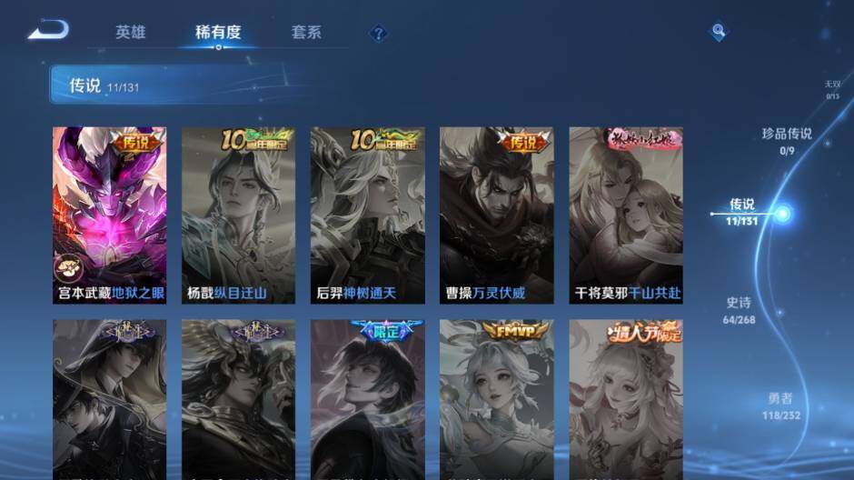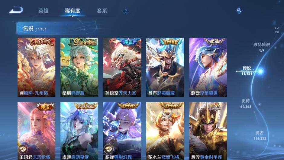 【传说皮肤】:澜愿照九州拓,桑启鸣野蒿,孙悟空齐天大圣,吕布怒海麟威,赵云淬星耀世,王昭君乞巧织情,虞姬启明星使,貂蝉猫影幻舞,花木兰冠军飞将,后羿黄金射手座,宫本武藏地狱之眼