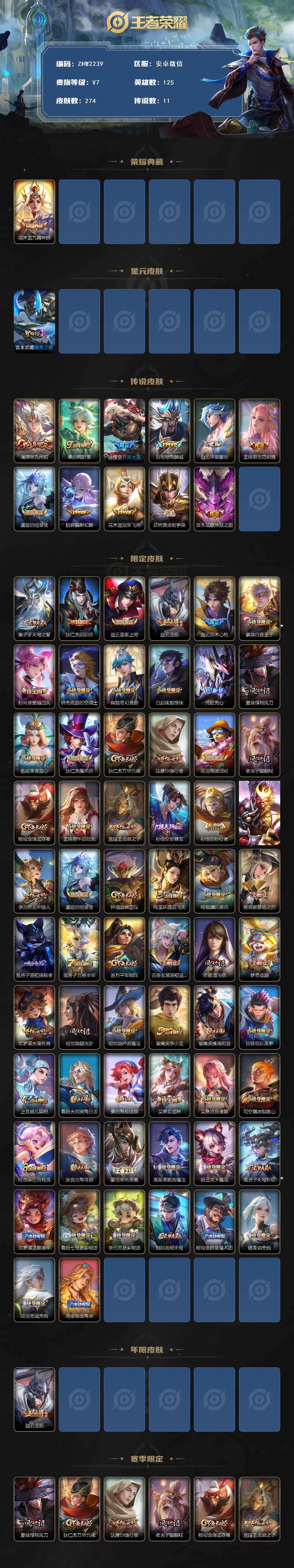 [15634956]微信社交限制介意勿拍!安卓WX-V8-至尊星耀III段位-125英雄-274皮肤-1典藏皮肤-11传说-64史诗-1星传 【荣耀典藏】:花木兰九霄神辉 【传说皮肤】:澜愿照九州拓,桑启鸣野蒿,孙悟空齐天大圣,吕布怒海麟威,赵云淬星耀世,王昭君乞巧织情,虞姬启明星使,貂蝉猫影幻舞,花木兰冠军飞将,后羿黄金射手座,宫本武藏地狱之眼 【限定皮肤】:姜子牙天穹之誓,狄仁杰阴阳师,赵云皇家上将,赵云龙胆,赵云百木心枪,嬴政白昼王子,孙尚香蔷薇恋人,钟无艳超时空战士,扁鹊奇幻香踪,白起夜都怪侠,元歌无心,夏侯惇朔风刀,甄姬落雪兰心,狄仁杰魔术师,狄仁杰万华元夜,达摩沙漠行僧,项羽海滩派对,老夫子醍醐杖,程咬金演武夺筹,王昭君午后时光,兰陵王金庭之子,孙悟空至尊宝,孙悟空孙行者,孙悟空齐天大圣,李元芳云中旅人,虞姬启明星使,钟馗驱傩正仪,杨玉环遇见飞天,杨戬潮玩骑兵,雅典娜黎明之约,鬼谷子原初探秘者,鬼谷子五谷丰年,苏烈千军破阵,百里玄策原初追逐者,弈星混沌棋,梦奇顽趣,沈梦溪大漠名商,明世隐疑决卦,明世隐吟游魔法,裴擒虎李小龙,裴擒虎擒涛扼浪,狂铁电玩高手,上官婉儿梁祝,鲁班大师探海日志,桑启海盐诗旅,艾琳女武神,艾琳流音漫舞,司空震地狱燃心,阿古朵江河有灵,张良古海寻踪,蒙恬荣光圣徽,高渐离燃音魔法,妲己灵卜魔法,鬼谷子天穹祈灯,沈梦溪龙舞盛年,鲁班七号蔬乡物语,李元芳蔬乡物语,刘邦剑破天穹,程咬金群星魔术团,镜青焰无极,项羽苍威无极,周瑜熔金海岸 【年限皮肤】:赵云龙胆 【赛季限定】:夏侯惇朔风刀,狄仁杰万华元夜,达摩沙漠行僧,老夫子醍醐杖,程咬金演武夺筹,兰陵王金庭之子,张良古海寻踪,李元芳云中旅人,钟馗驱傩正仪,雅典娜黎明之约,鬼谷子原初探秘者,苏烈千军破阵,百里玄策原初追逐者,弈星混沌棋,梦奇顽趣,沈梦溪大漠名商,明世隐疑决卦,裴擒虎擒涛扼浪,鲁班大师探海日志,桑启海盐诗旅,鬼谷子天穹祈灯,蒙恬荣光圣徽,刘邦剑破天穹,姜子牙天穹之誓 【战令限定】:嬴政白昼王子,钟无艳超时空战士,扁鹊奇幻香踪,白起夜都怪侠,甄姬落雪兰心,王昭君午后时光,艾琳流音漫舞,杨戬潮玩骑兵,明世隐吟游魔法,狂铁电玩高手,司空震地狱燃心,高渐离燃音魔法,妲己灵卜魔法,鲁班七号蔬乡物语,李元芳蔬乡物语,镜青焰无极,项羽苍威无极 【史诗皮肤】:露娜紫霞仙子,赵云皇家上将,赵云未来纪元,貂蝉圣诞恋歌,