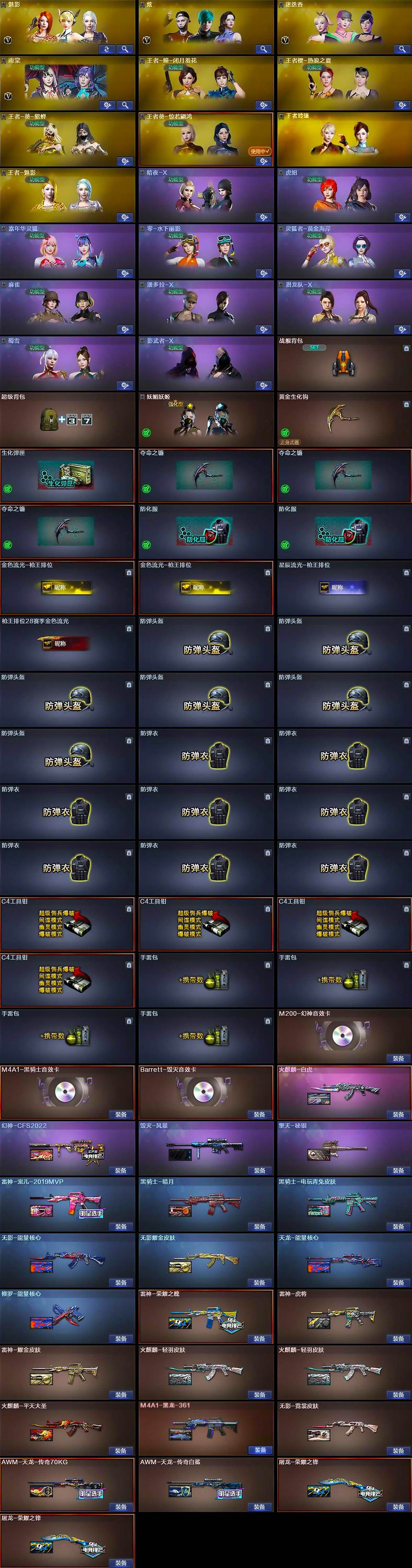 【皮肤】:幻神-CFS2022,雷神-荣耀之魄,雷神-虎将,雷神-耀金皮肤,雷神-宠儿-2019MVP,火麒麟-轻羽皮肤*2,火麒麟-平天大圣,火麒麟-白虎,毁灭-风暴,毁灭-英雄计划 皮肤,M4A1-黑龙-361,黑骑士-暗月,黑骑士-电玩青兔皮肤,无影-能量核心,无影耀金皮肤,无影-霓裳皮肤,天龙-能量核心,AWM-天龙-传奇70KG,AWM-天龙-传奇白鲨,修罗-能量核心,屠龙-荣耀之锋*2,擎天-秘银