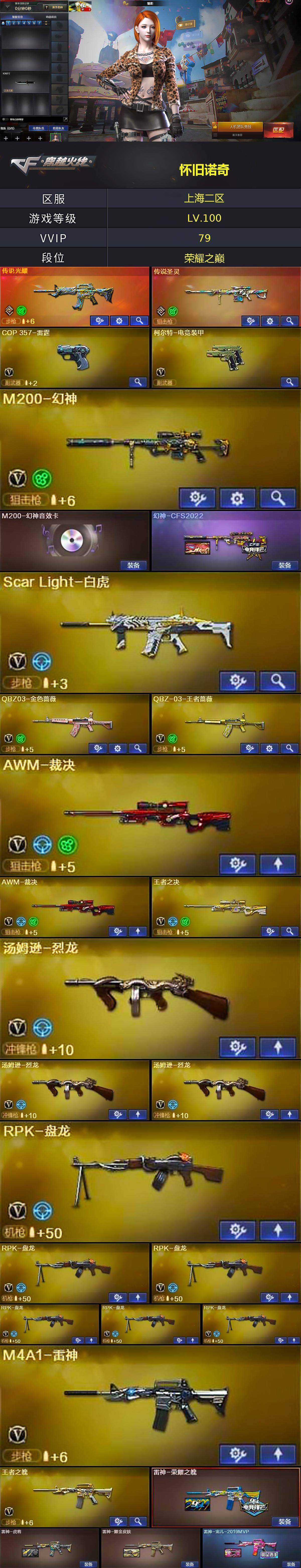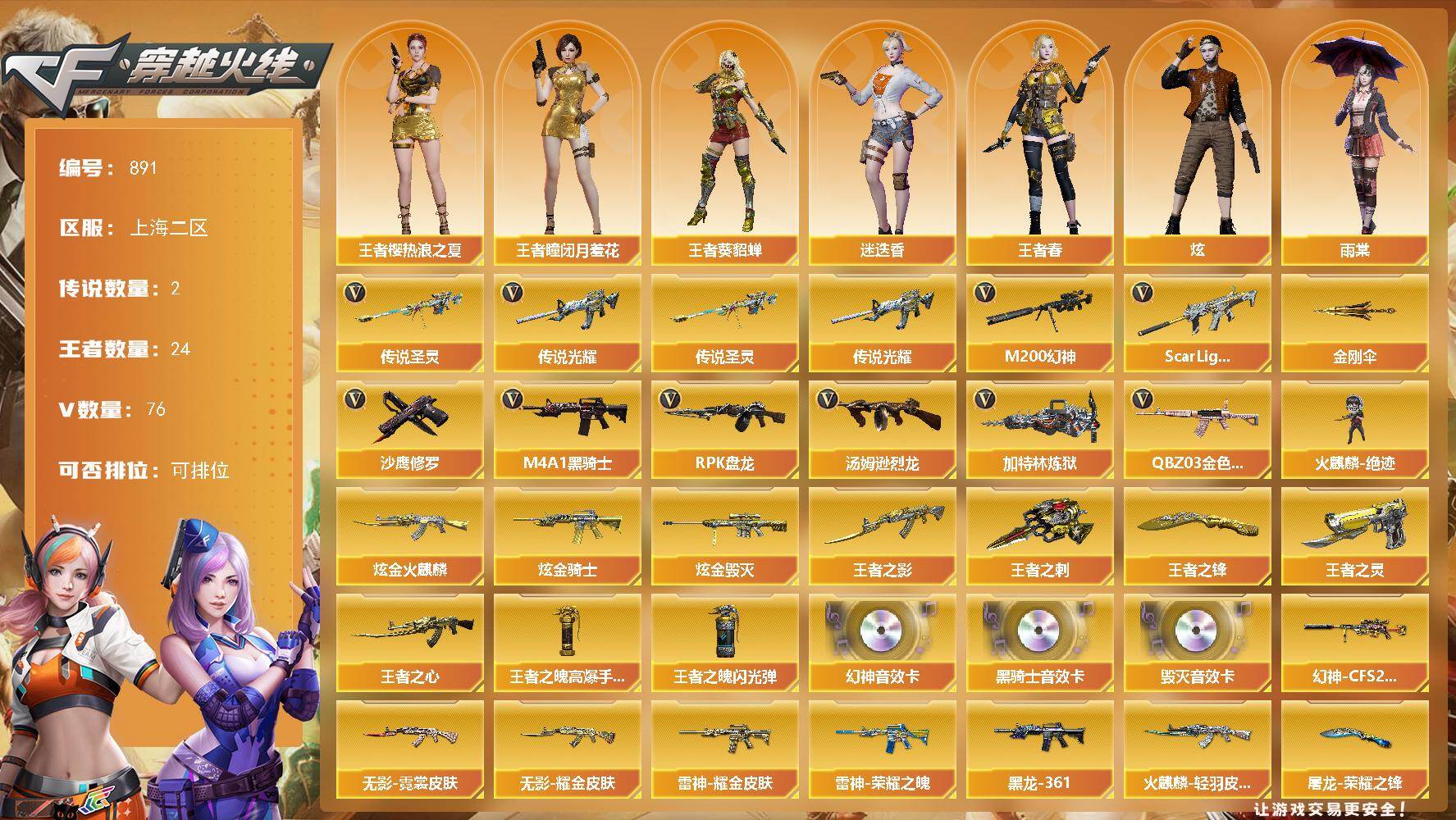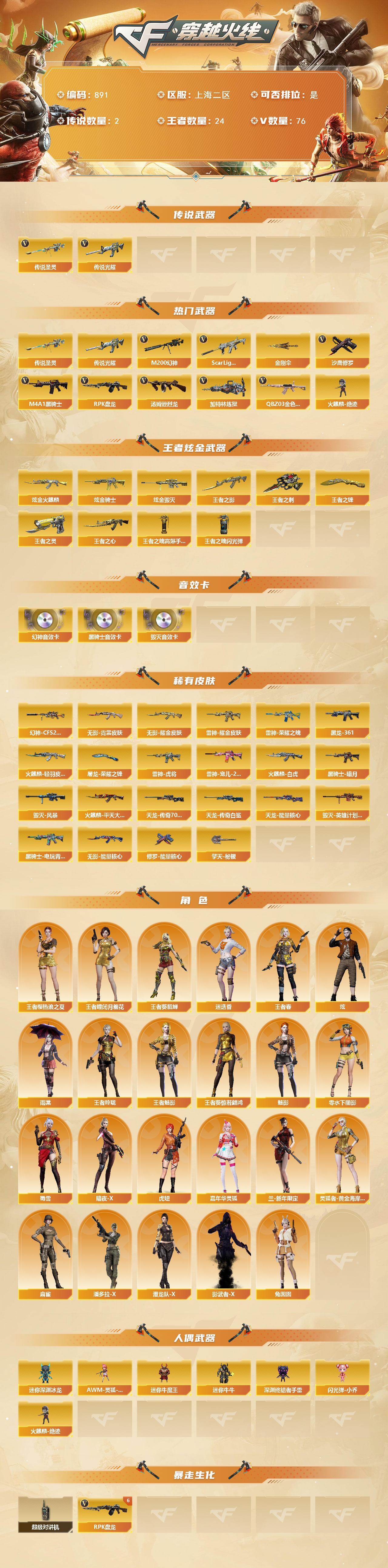 [15635638]上海二区-76V-24王者-3炫金 【传说武器】:传说光耀,传说圣灵 【热门武器】:传说光耀,传说圣灵,QBZ03-金色蔷薇,Scar Light-白虎,M200-幻神,M4A1-黑骑士*7,汤姆逊-烈龙*3,RPK-盘龙*6,加特林-炼狱,火麒麟-绝迹,沙鹰-修罗,金刚伞 【王者炫金武器】:王者之影,王者之心,王者之灵,王者之刺,王者之锋,炫金火麒麟,炫金骑士,炫金毁灭,王者之魄高爆手雷,王者之魄闪光弹*3 【音效卡】:M200-幻神音效卡,M4A1-黑骑士音效卡,Barrett-毁灭音效卡 【皮肤】:幻神-CFS2022,雷神-荣耀之魄,雷神-虎将,雷神-耀金皮肤,雷神-宠儿-2019MVP,火麒麟-轻羽皮肤*2,火麒麟-平天大圣,火麒麟-白虎,毁灭-风暴,毁灭-英雄计划 皮肤,M4A1-黑龙-361,黑骑士-暗月,黑骑士-电玩青兔皮肤,无影-能量核心,无影耀金皮肤,无影-霓裳皮肤,天龙-能量核心,AWM-天龙-传奇70KG,AWM-天龙-传奇白鲨,修罗-能量核心,屠龙-荣耀之锋*2,擎天-秘银 【角色】:魅影,炫,迷迭香,雨棠,王者-瞳-闭月羞花,王者樱-热浪之夏,王者-葵-貂蝉,王者葵-惊若翩鸿,王者春,王者玲珑,王者-魅影,暗夜-X,虎妞,嘉年华灵狐,兰-新年限定,零-水下丽影,灵狐者-黄金海岸,麻雀,潘多拉-X,潜龙队-X,蜀雪,兔囡囡,影武者-X 【人偶武器】:火麒麟-绝迹,AWM-灵狐-15周年嘉年华,迷你深渊冰龙,迷你牛魔王,迷你牛牛,深渊终结者手雷*2,闪光弹-小乔 【暴走生化】:超级对讲机 【挑战大师】:AK47-冰龙粉碎者,冰龙粉碎者-白马银枪*2,激光毁灭者III,神圣爆裂者-末日III*2,阐释者III*2 【英雄级武器】:AK47-火麒麟*2,M4A1-黑龙,M4A1-雷神,M4A1-黑骑士*7,AK47-无影,M4A1-死神,AK47-黑武士,AK12-天启,AK47-机械迷城,Scar Light-白虎,无影-神兵利器,QBZ03-金色蔷薇,王者之翼-觉醒版,王者之魄-觉醒版,王者之势-觉醒版,王者之戮-觉醒版,AK47-B-战神,王者之城-觉醒版,王者炎心-觉醒版,黑骑士-海王*2,QBZ-03-王者蔷薇-觉醒版,黑武士-CF网剧冠军*3,AWM-天龙*2,Barrett-毁灭*2,Barrett-极光,AWM-裁决*2,M20