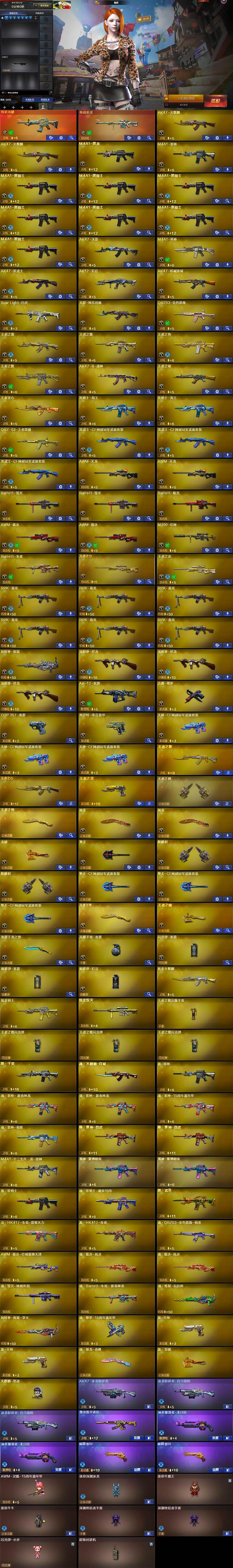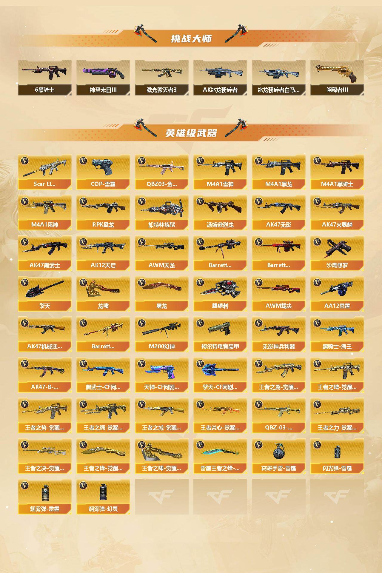 【英雄级武器】:AK47-火麒麟*2,M4A1-黑龙,M4A1-雷神,M4A1-黑骑士*7,AK47-无影,M4A1-死神,AK47-黑武士,AK12-天启,AK47-机械迷城,Scar Light-白虎,无影-神兵利器,QBZ03-金色蔷薇,王者之翼-觉醒版,王者之魄-觉醒版,王者之势-觉醒版,王者之戮-觉醒版,AK47-B-战神,王者之城-觉醒版,王者炎心-觉醒版,黑骑士-海王*2,QBZ-03-王者蔷薇-觉醒版,黑武士-CF网剧冠军*3,AWM-天龙*2,Barrett-毁灭*2,Barrett-极光,AWM-裁决*2,M20