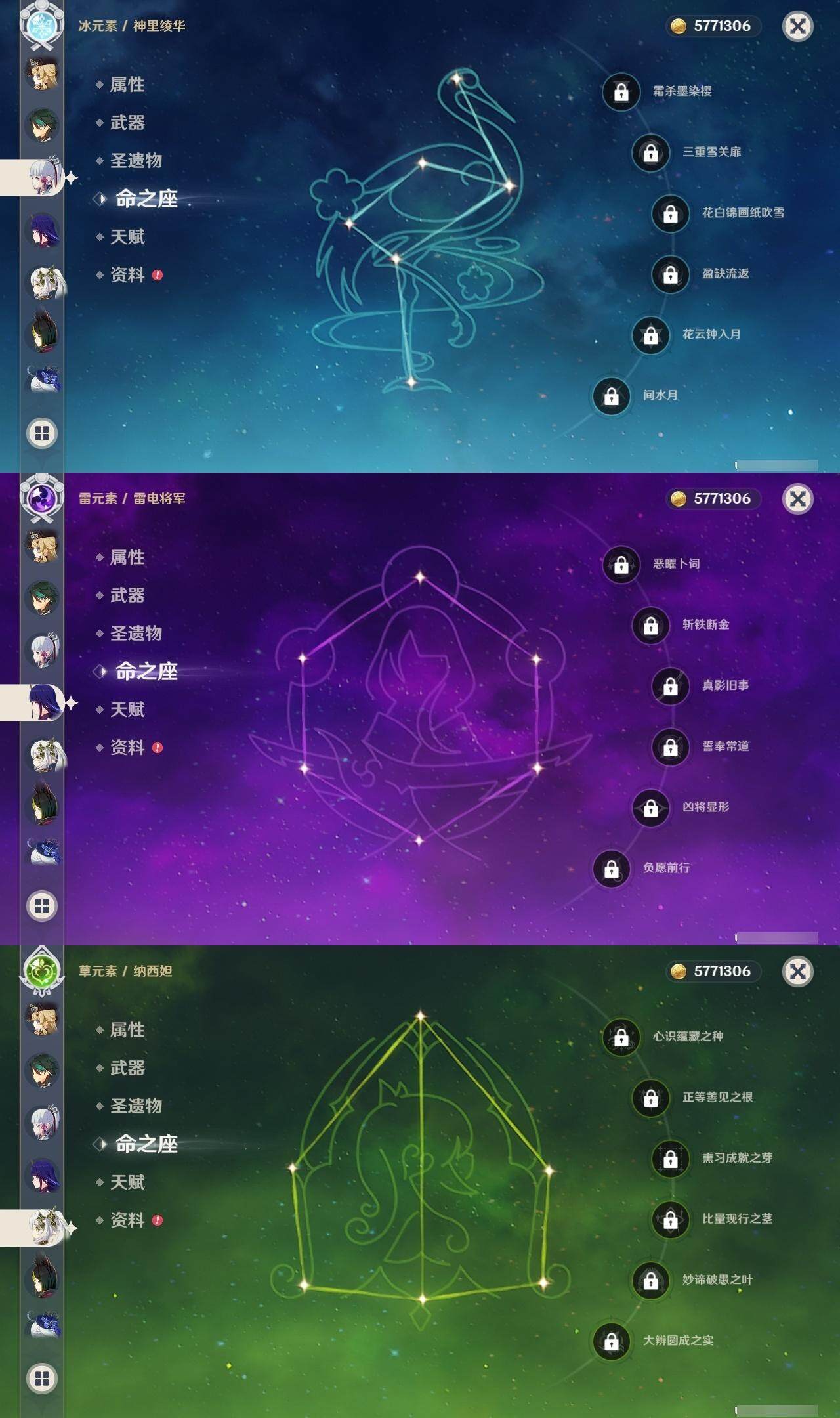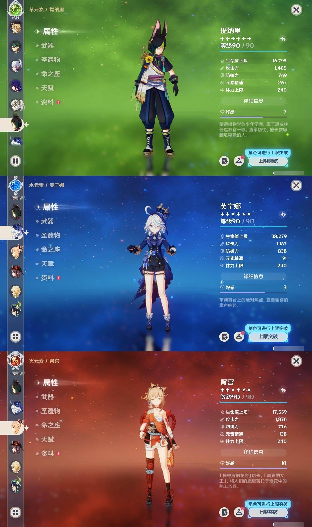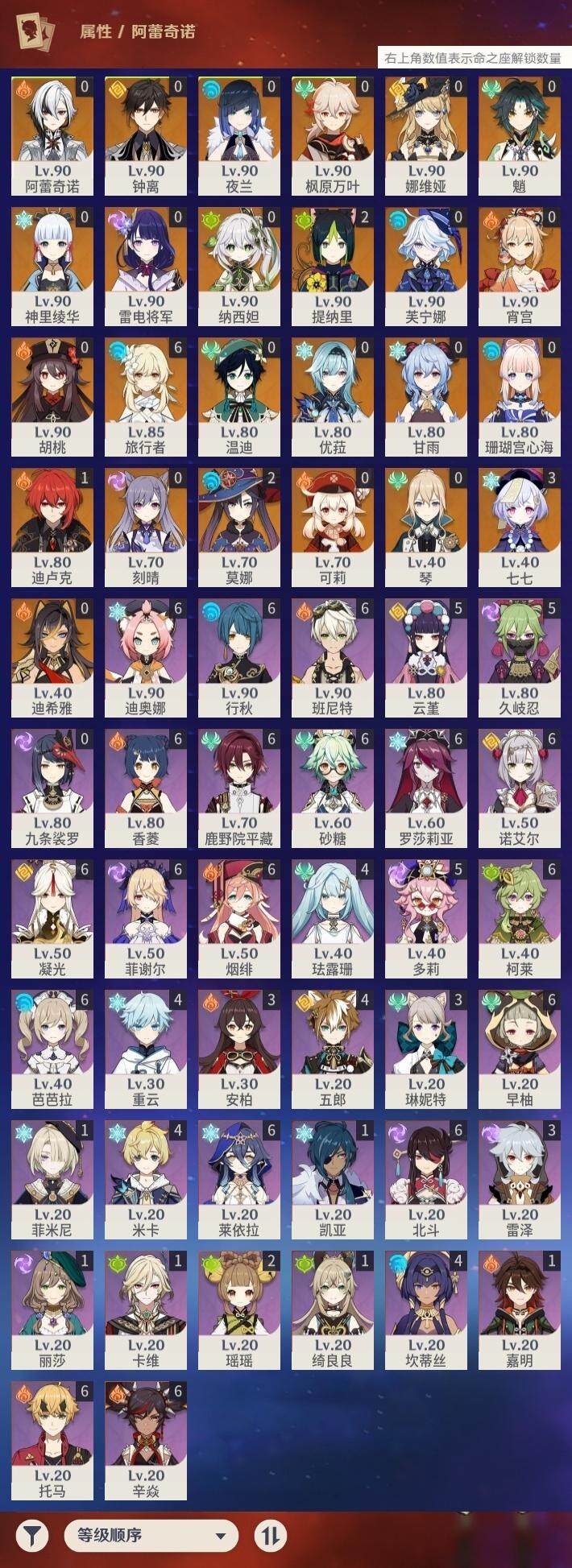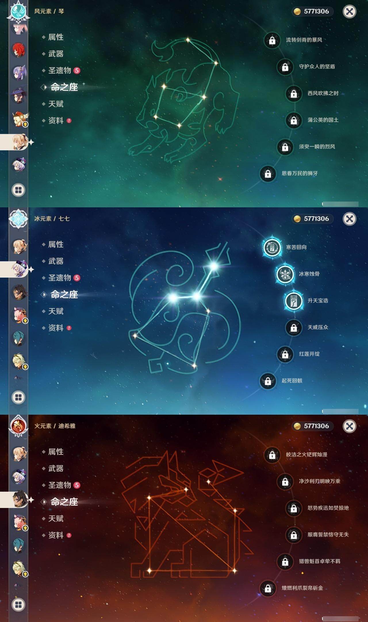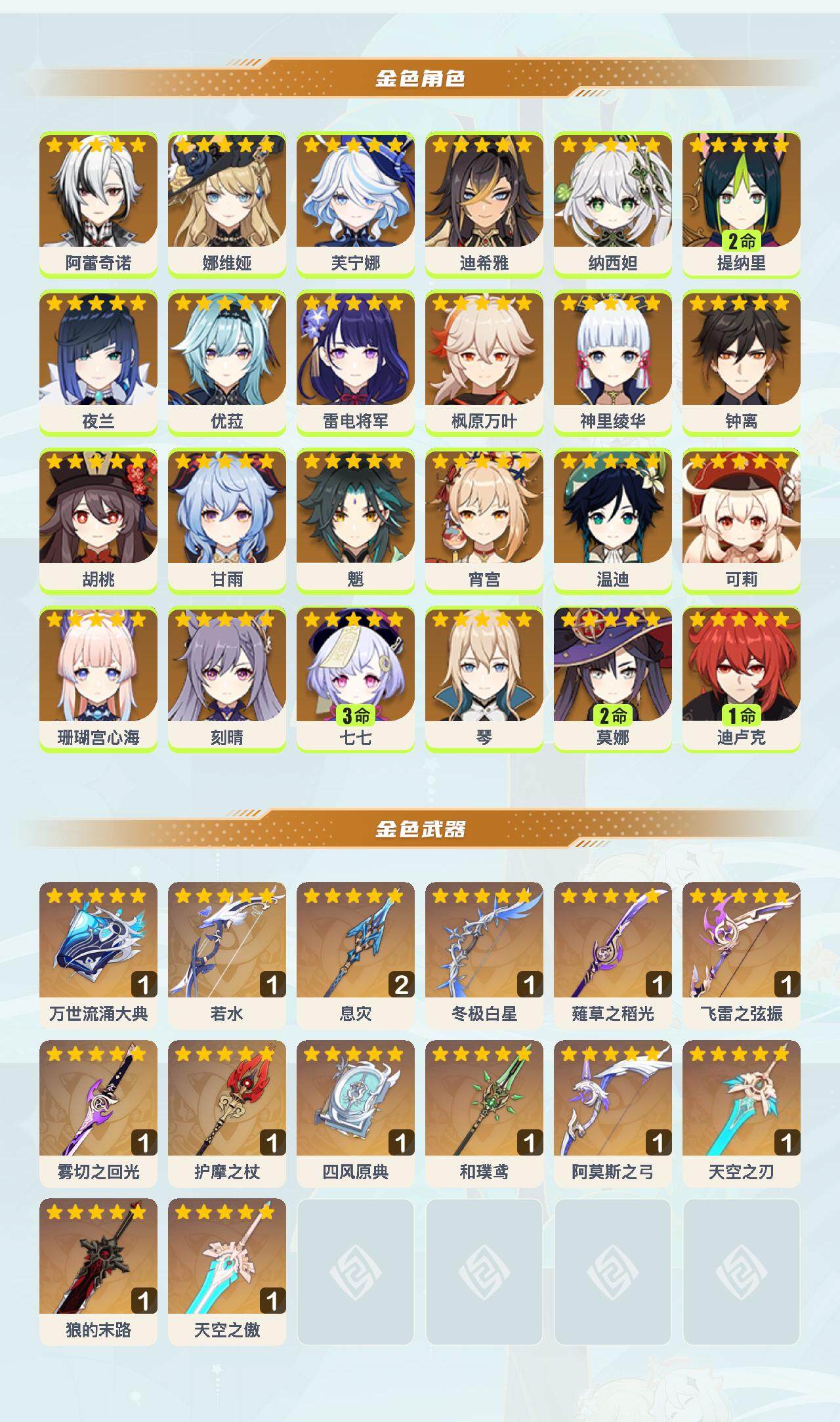 0命阿蕾奇诺,0命娜维娅,0命芙宁娜,0命迪希雅,0命纳西妲,2命提纳里,0命夜兰,0命优菈,0命雷电将军,0命枫原万叶,0命神里绫华,0命钟离,0命胡桃,0命甘雨,0命魈,0命宵宫,0命温迪,0命可莉,0命珊瑚宫心海,0命刻晴,3命七七,0命琴,2命莫娜,1命迪卢克,精1万世流涌大典,精1若水,精2息灾,精1冬极白星,精1薙草之稻光,精1飞雷之弦振,精1雾切之回光,精1护摩之杖,精1四风原典,精1和璞鸢,精1阿莫斯之弓,精1天空之刃,精1狼的末路,精1天空之傲