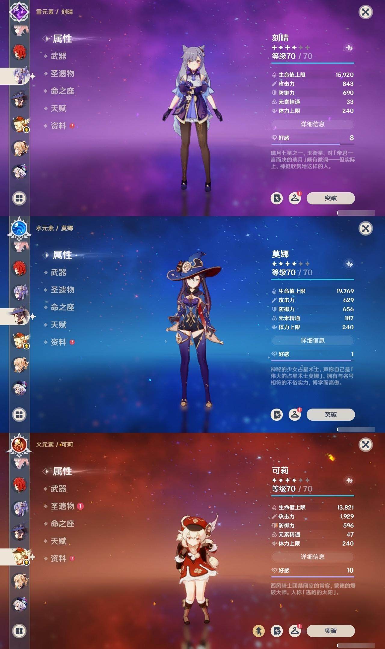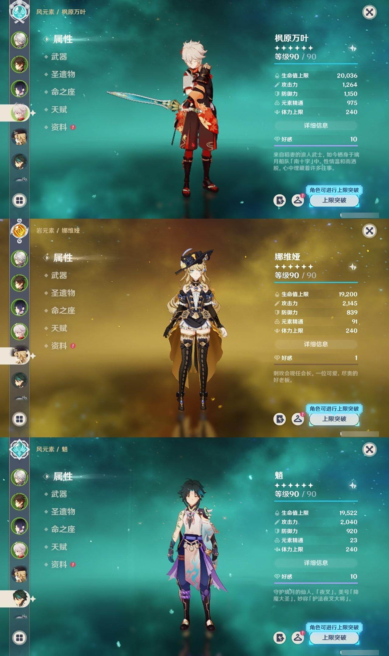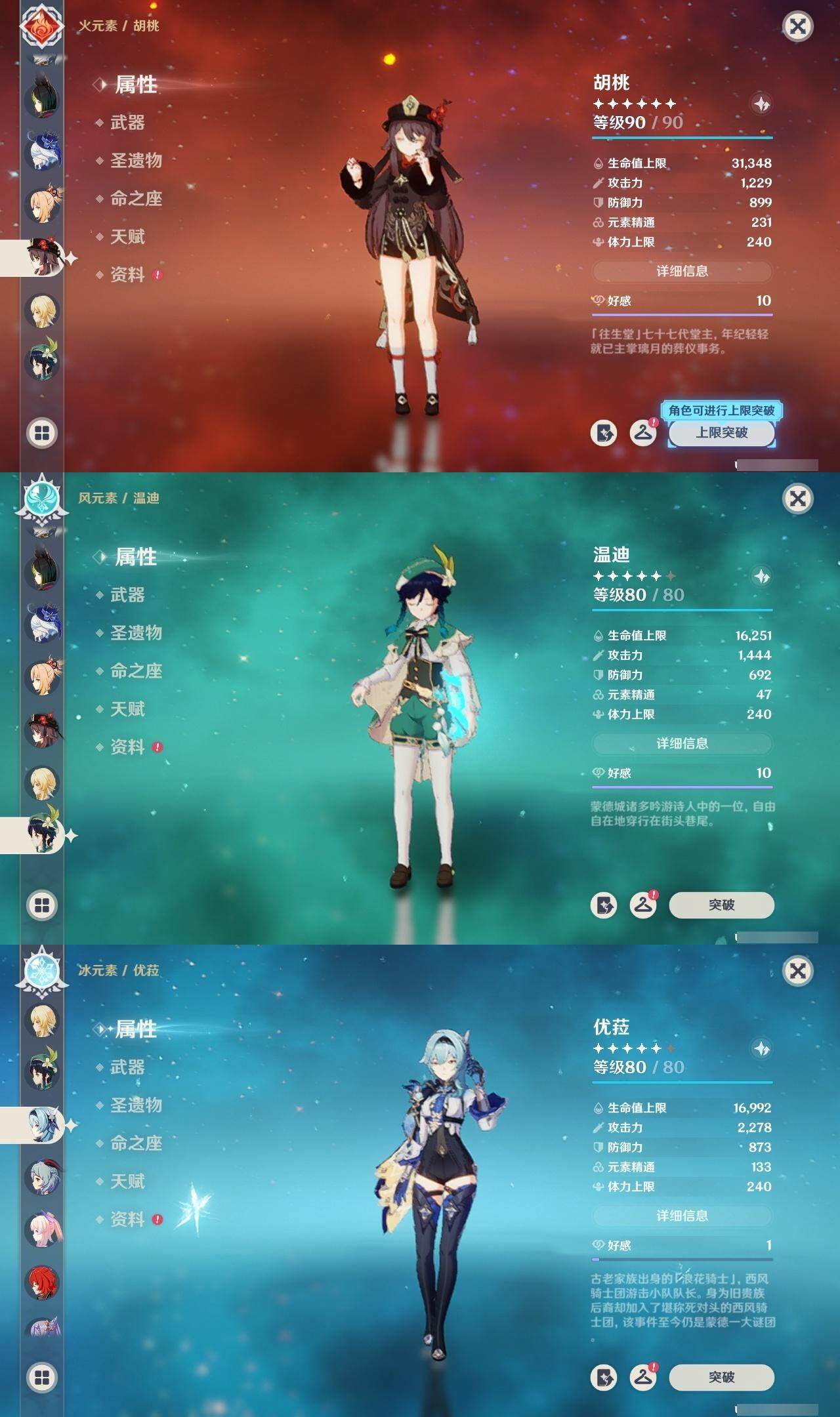 钟离,枫原万叶,魈,神里凌华,雷电将军,宵宫,胡桃,温迪,优菈,甘雨,珊瑚宫心海,迪卢克,刻晴,莫娜,可莉,琴,七七